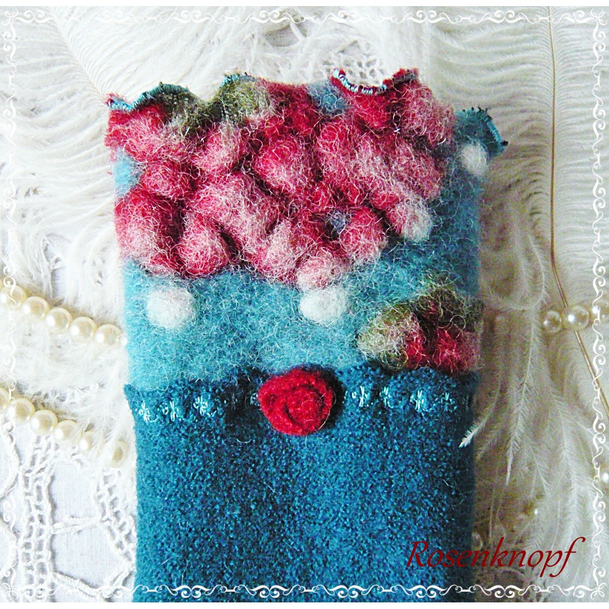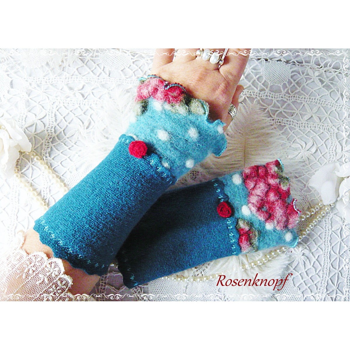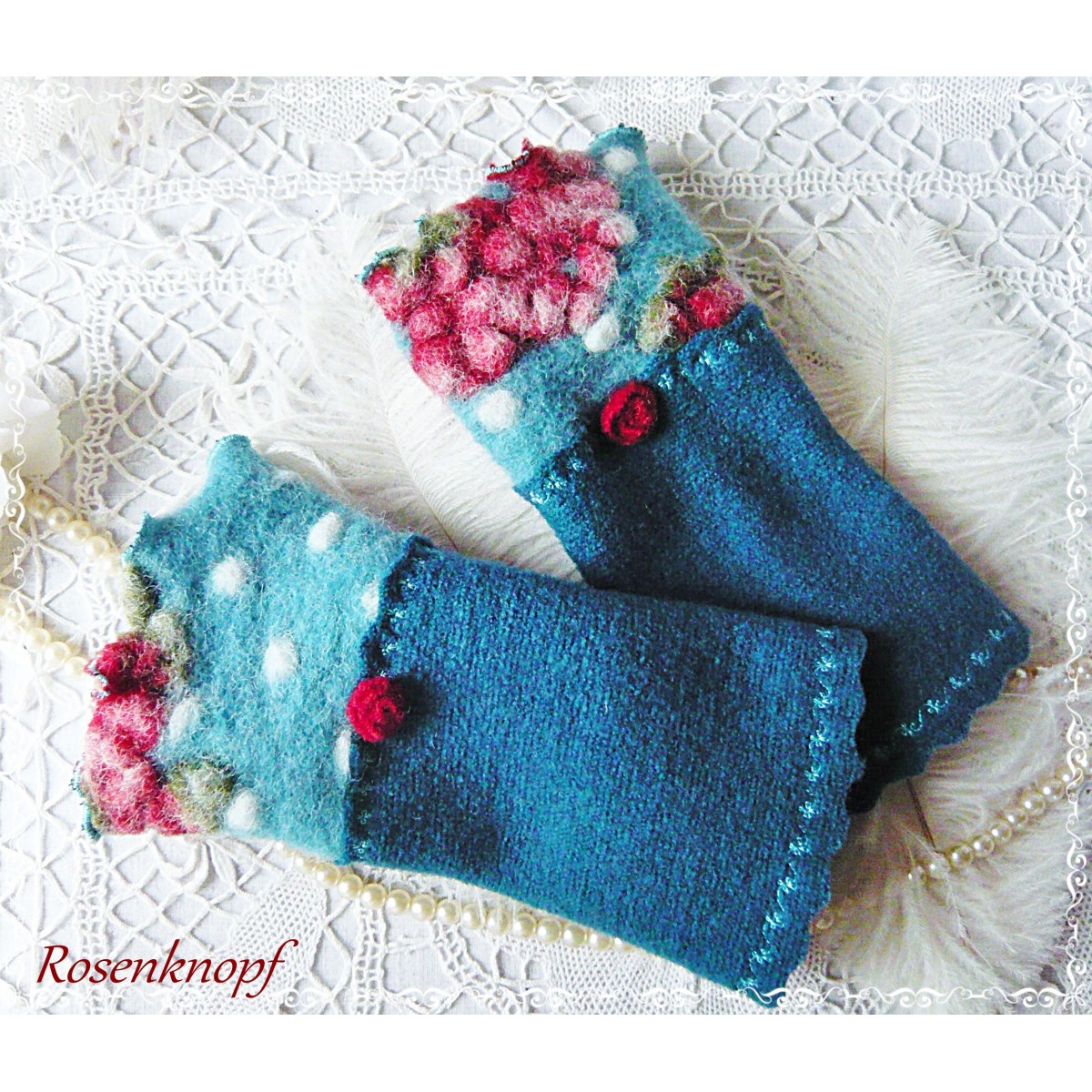Romantische Akzente erhalten die Armstulpen durch das Röschen in Kirschrot und den angesetzte Walkabschluss mit Reliefmuster.