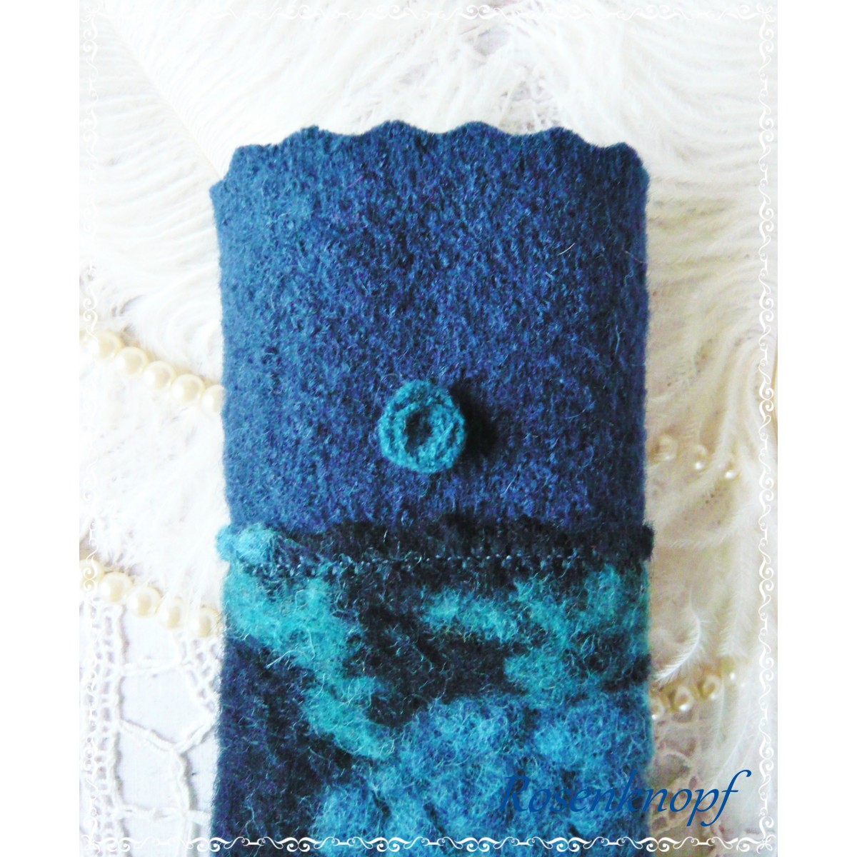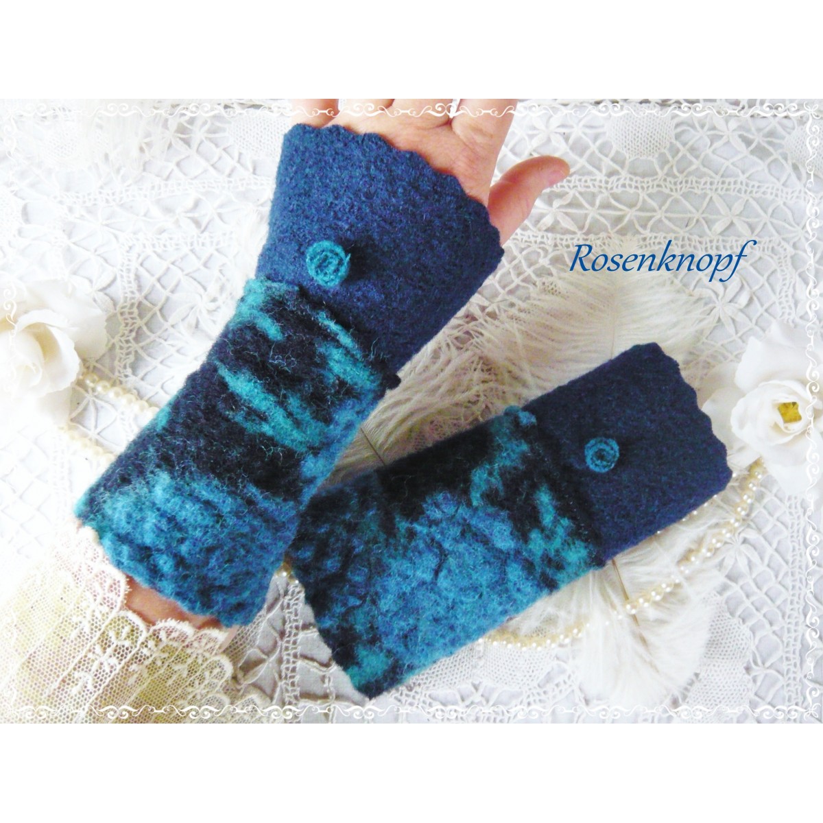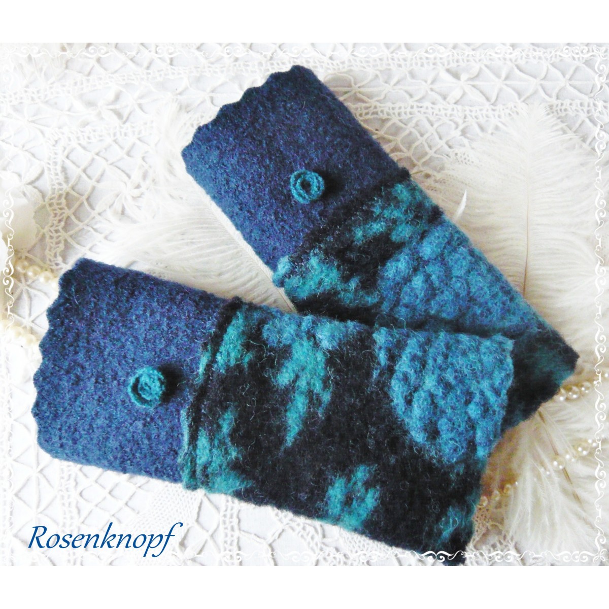Romantische Akzente erhalten die Armstulpen durch den angesetzen Walk in Azurblau und türkisfarbene Perlen.