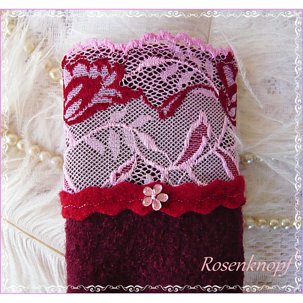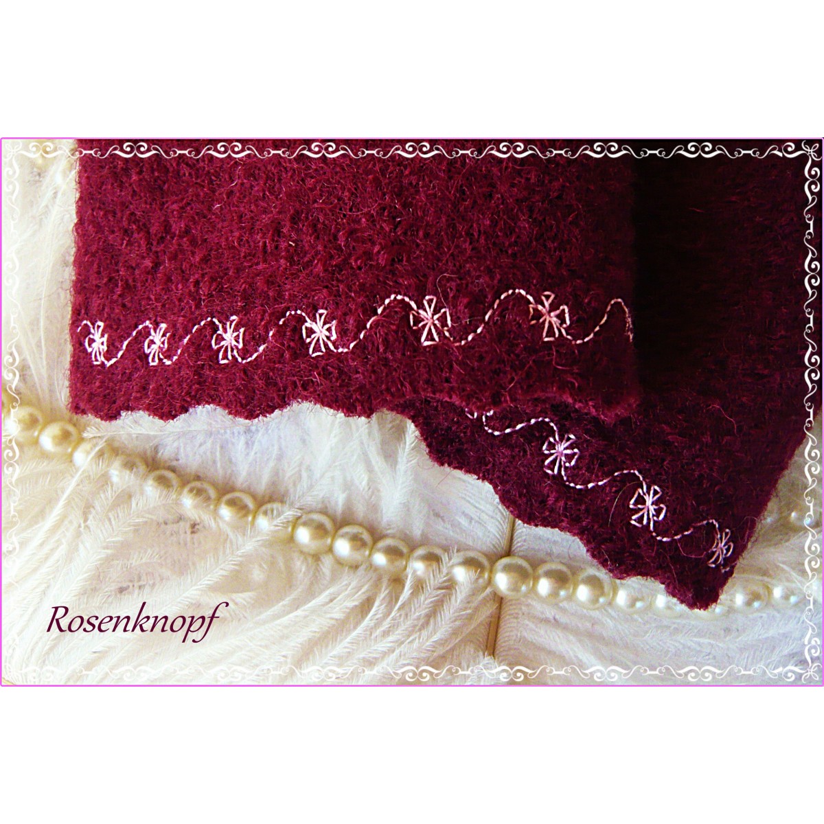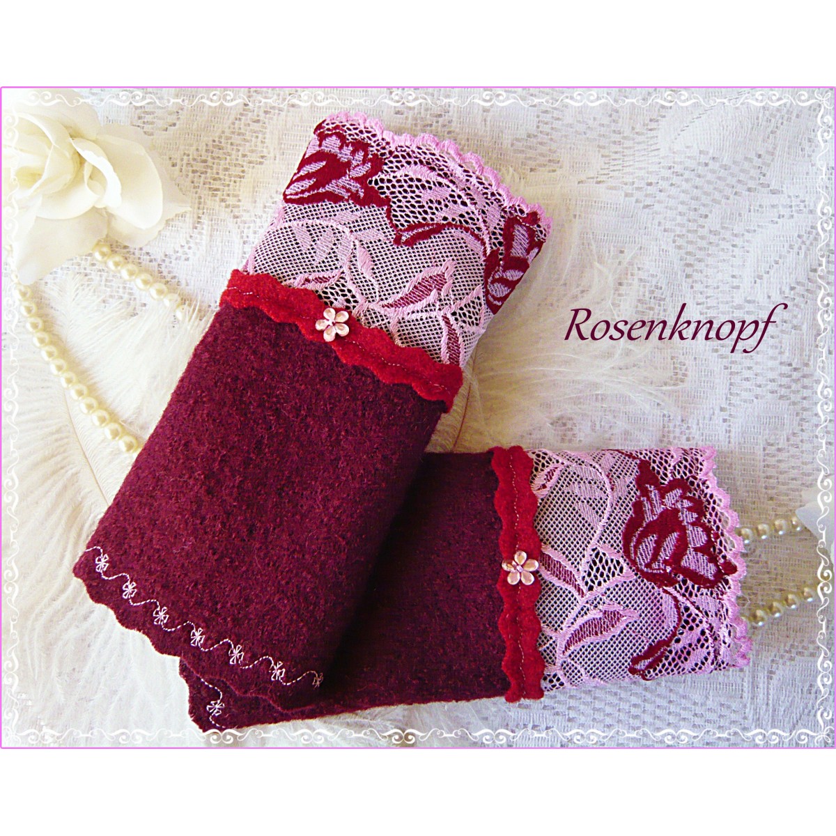 Elegante Walkstulpen in Weinrot mit aufgenähter elastische Spitze in Rosa-Violett Tönen und Glitzerblümchen mit Perle.