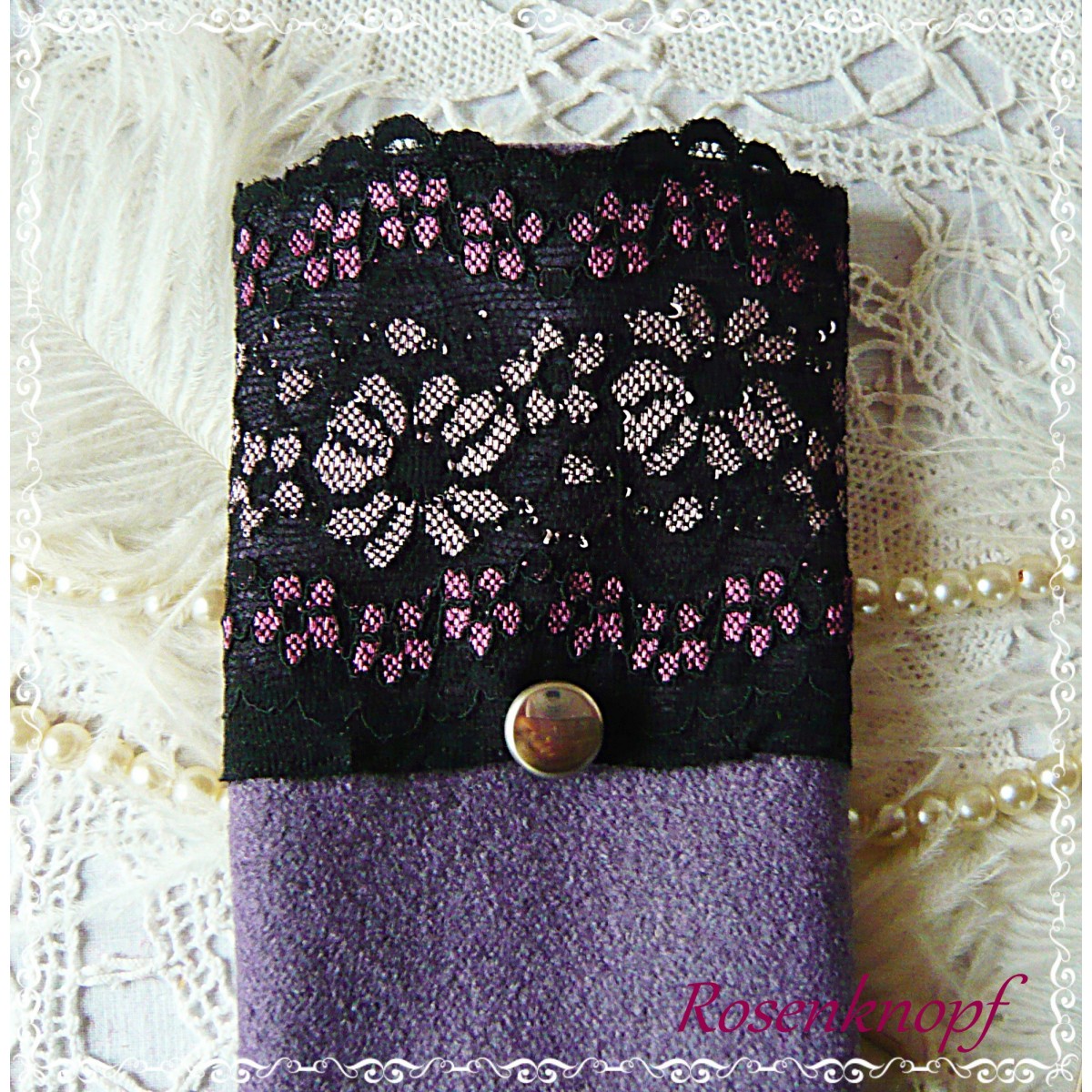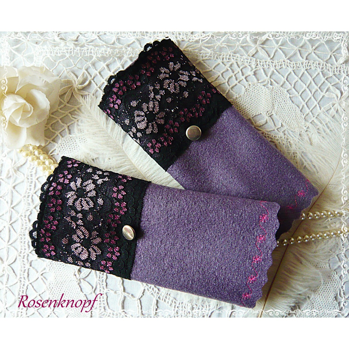 Romantische Akzente erhalten die Wollstulpen durch die elastische Spitze in Schwarz mit floralem Muster und dem Vintage Knopf.