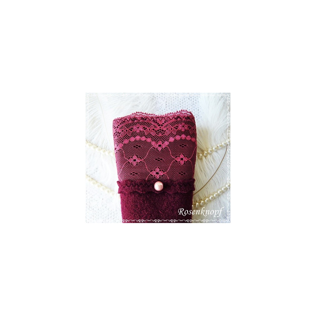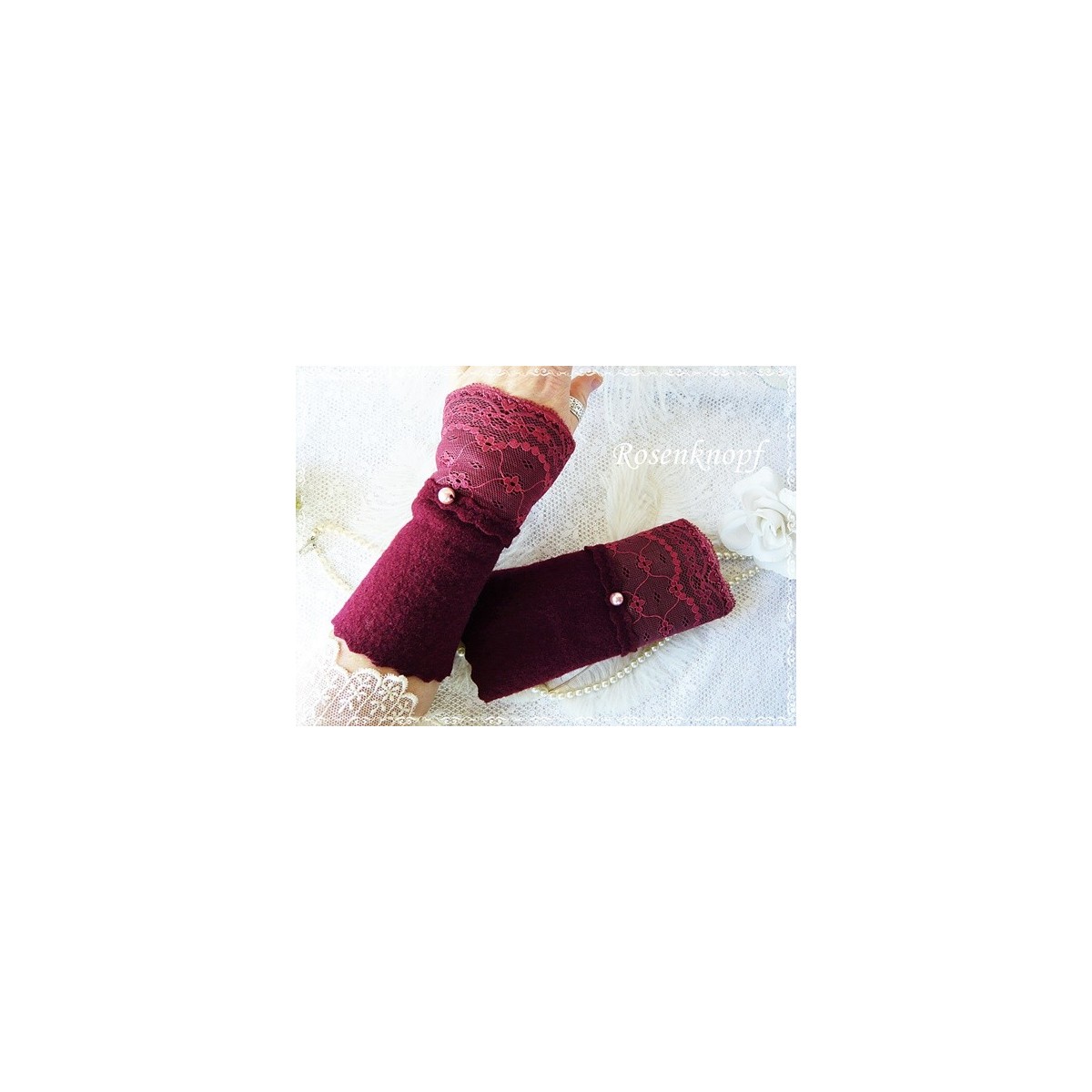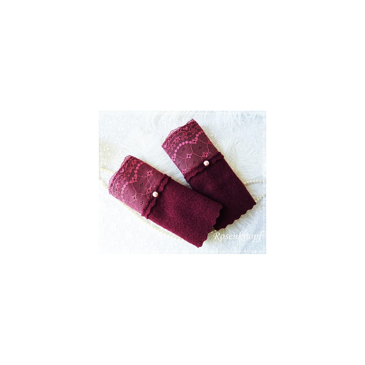 Romantische Akzente erhalten die Wollstulpen durch die elastische Spitze und roséfarbene Perlen.