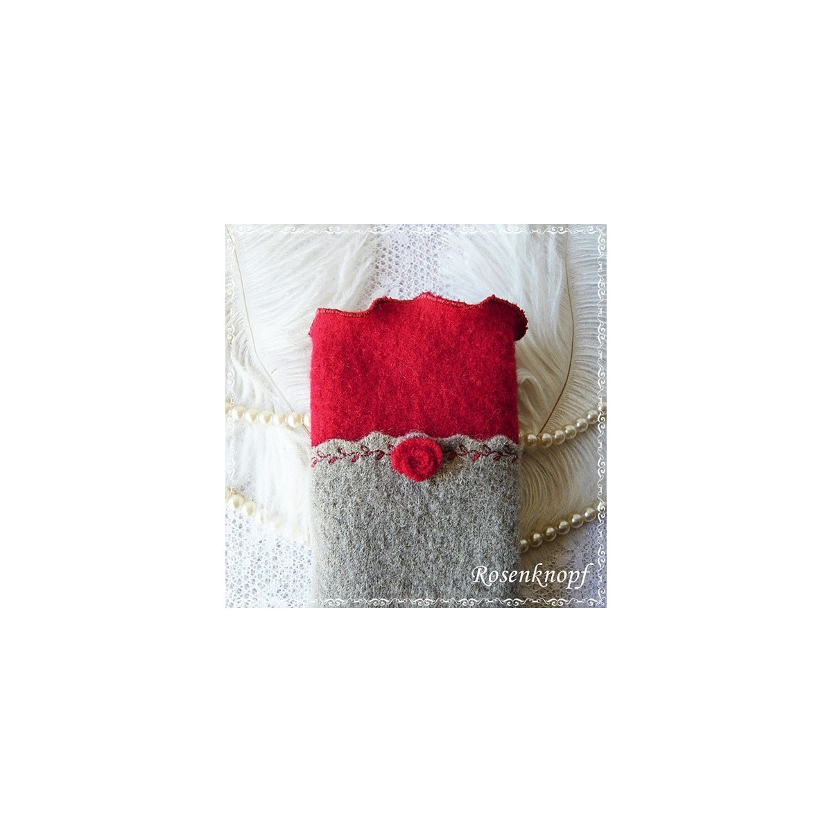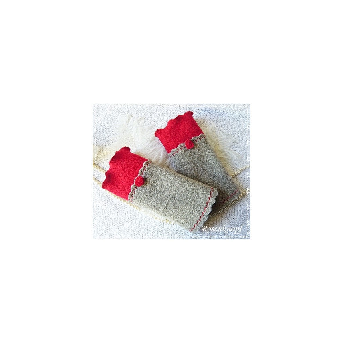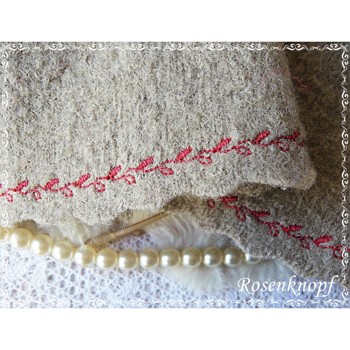 Romantische Akzente erhalten die Armstulpen durch das zarte Walkröschen und den gekrausten Walkstreifen in Tiefrot, der mit Zierstich angenäht wurde.