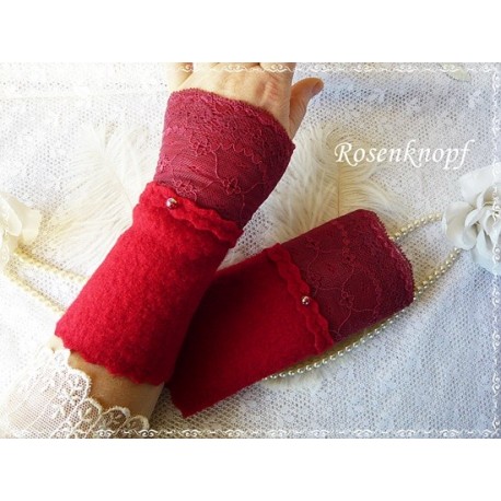 Romantische Akzente erhalten die Wollstulpen durch die elastische Spitze mit floralem Muster und einer schimmernden Perle.