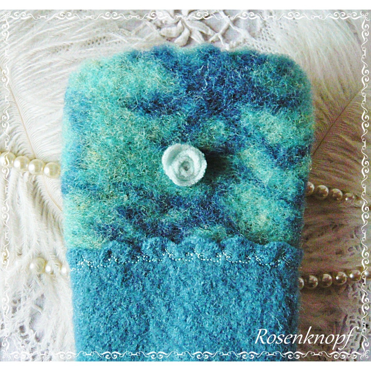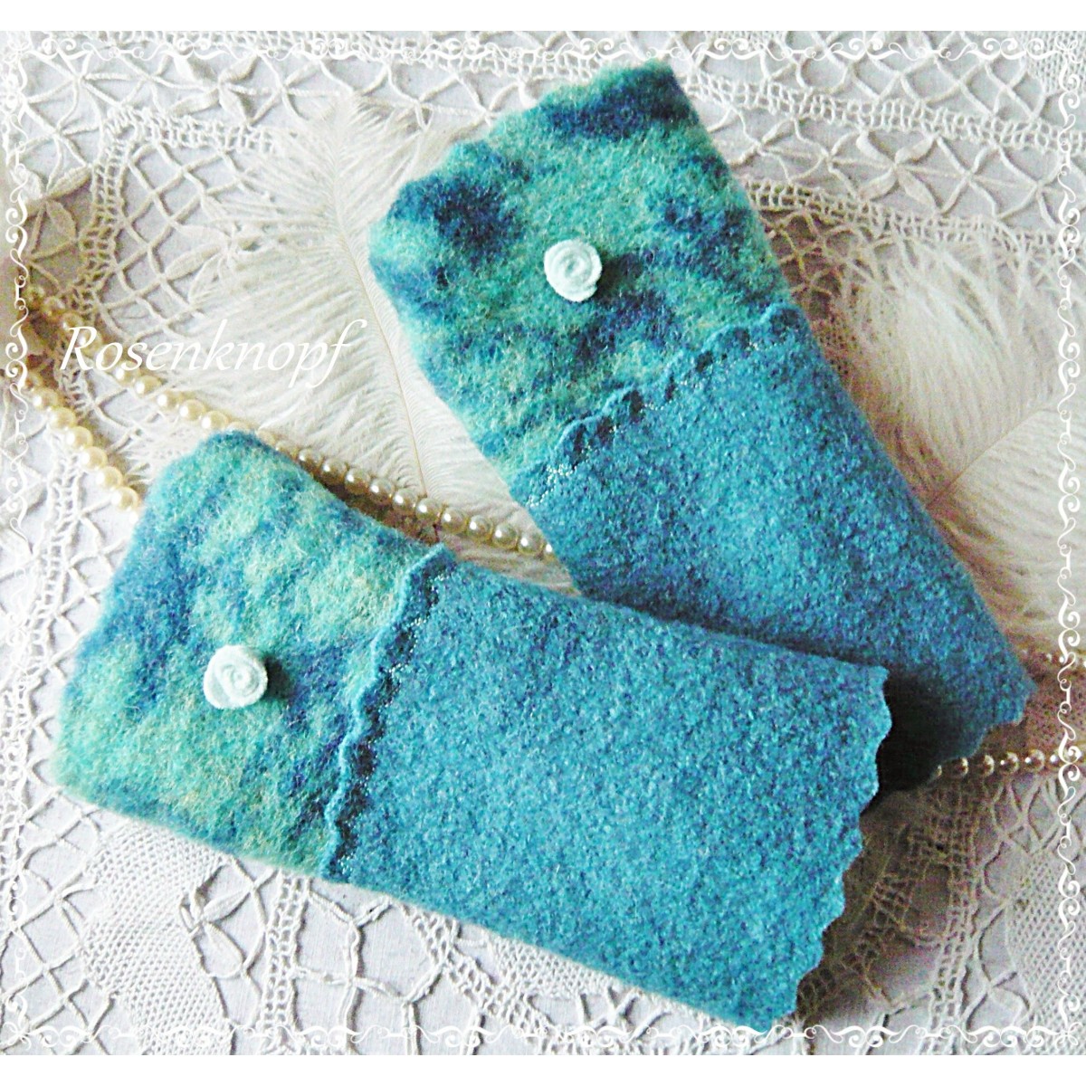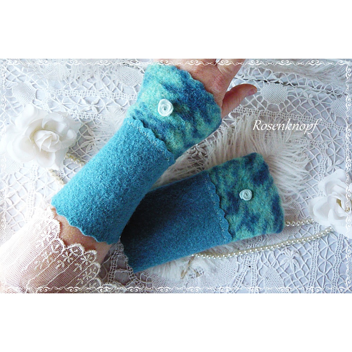 Romantische Akzente erhalten die Wollstulpen durch das Röschen in Mint und den melierten Walkstreifen mit Wellenkante.
