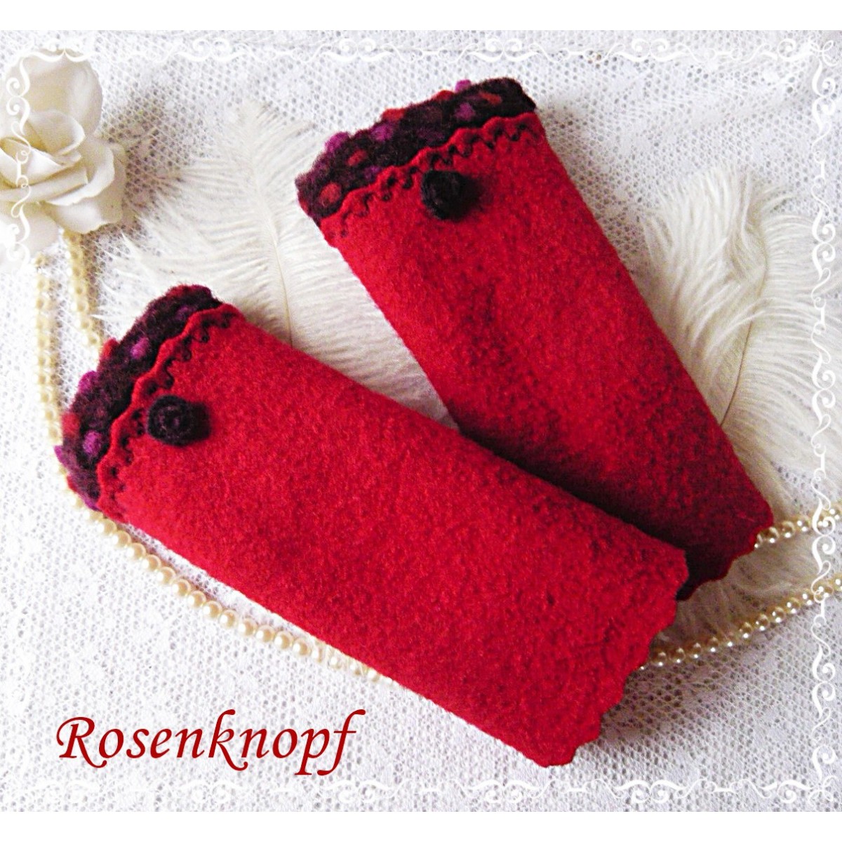 Romantische Akzente erhalten die Armstulpen durch das Walkröschen und die Abschluss-Walkborte in Bordeaux mit Dots, die mit Zierstich an die vordere Kante genäht wurde.