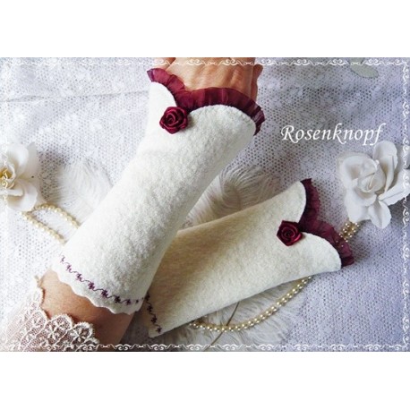 Romantische Akzente erhalten die Wollstulpen durch die bordeauxfarbene Organzaborte, das Satinröschen und einer floralen Ziernaht.