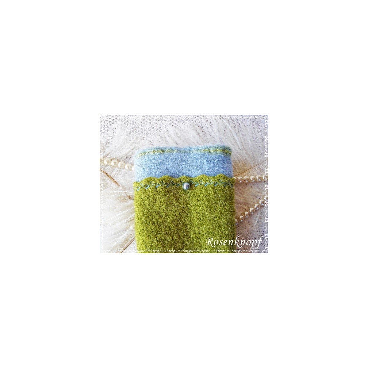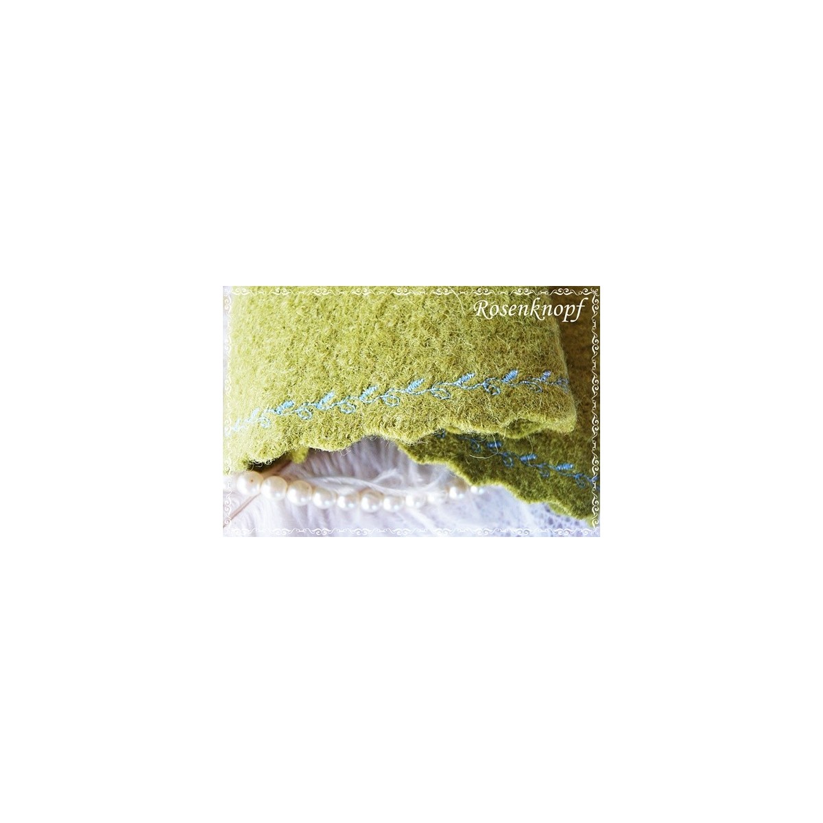 Romantische Akzente erhalten die Stulpen durch den angesetzten Walkabschluss in Hellblau, den Zierstich und das Walkröschen.