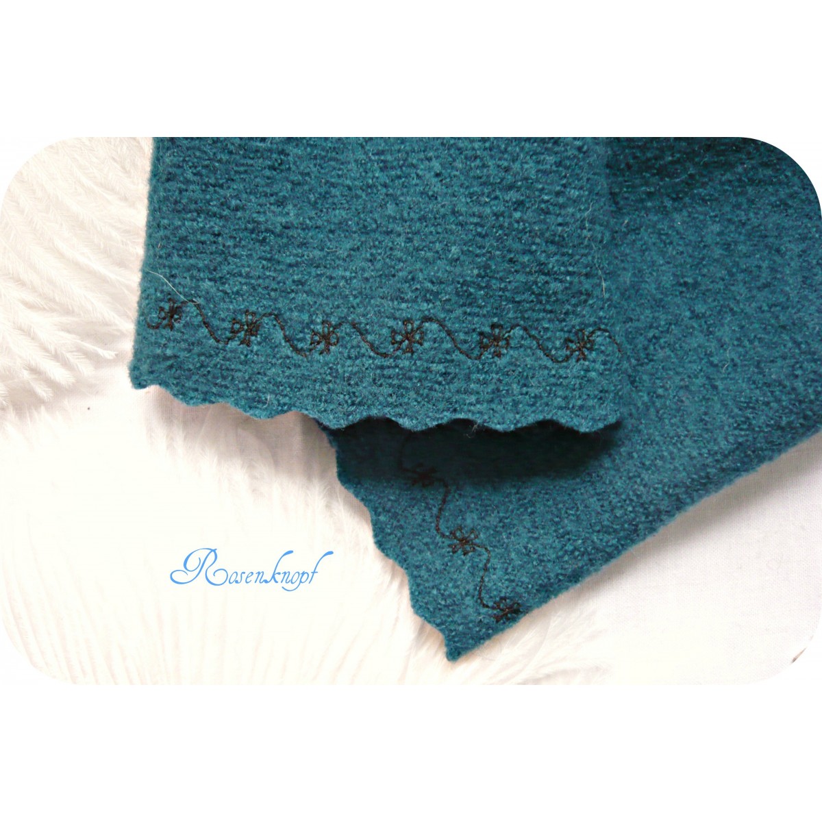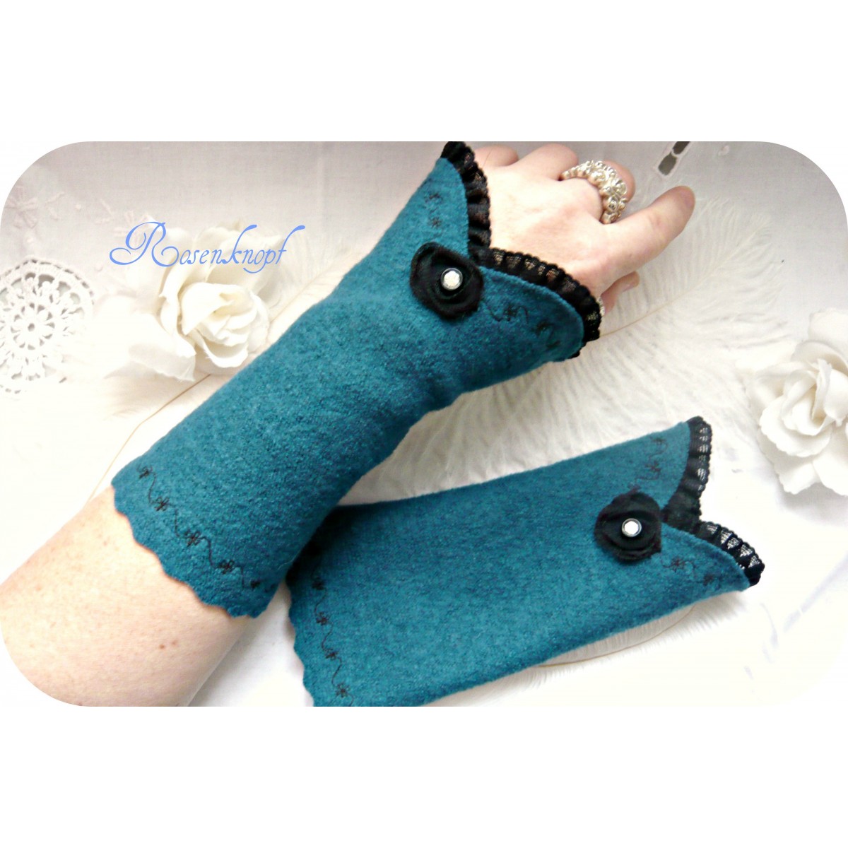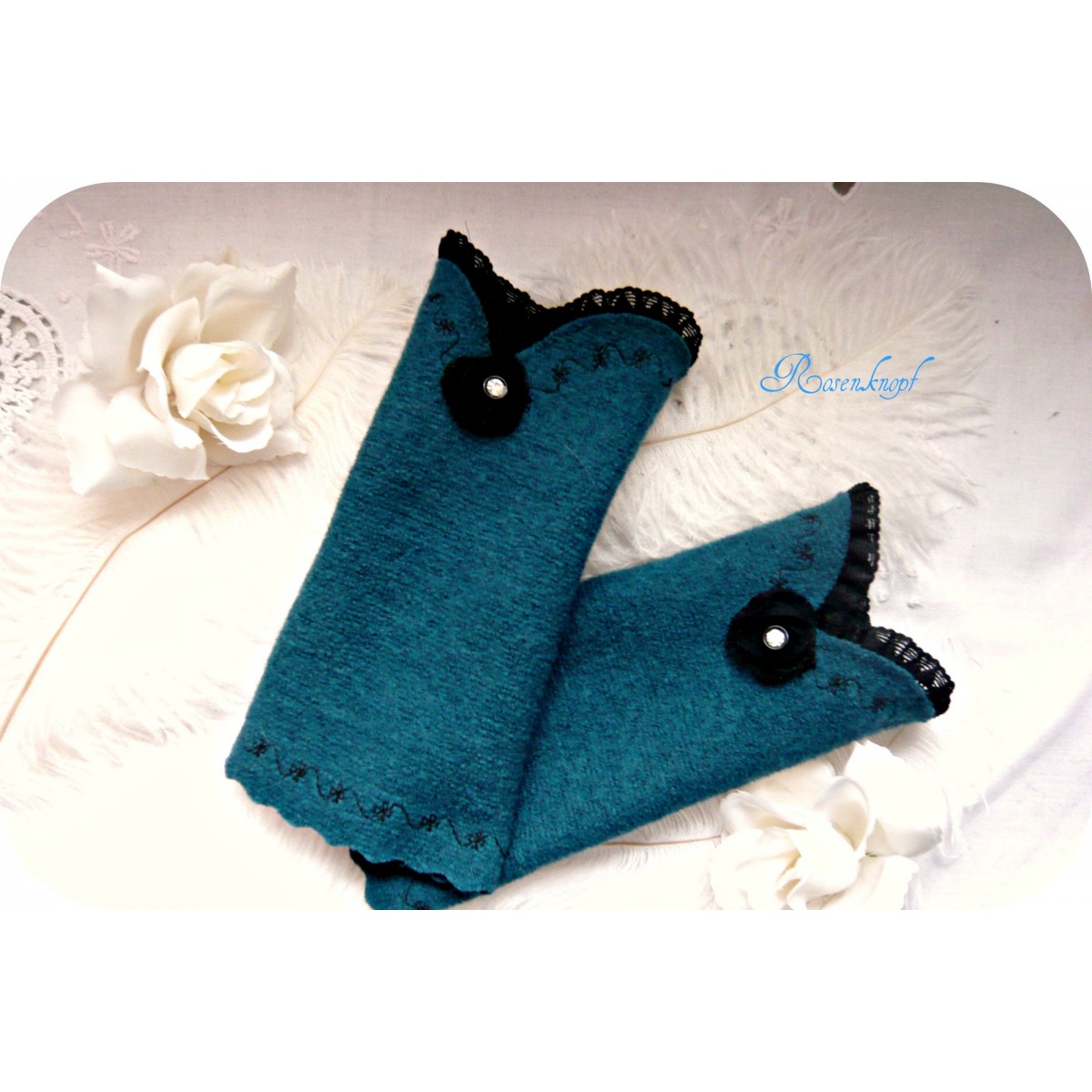 Eine schwarze Spitzenborte schmückt die vordere Kante der Wollstulpen die einen verspielten Einschnitt haben.