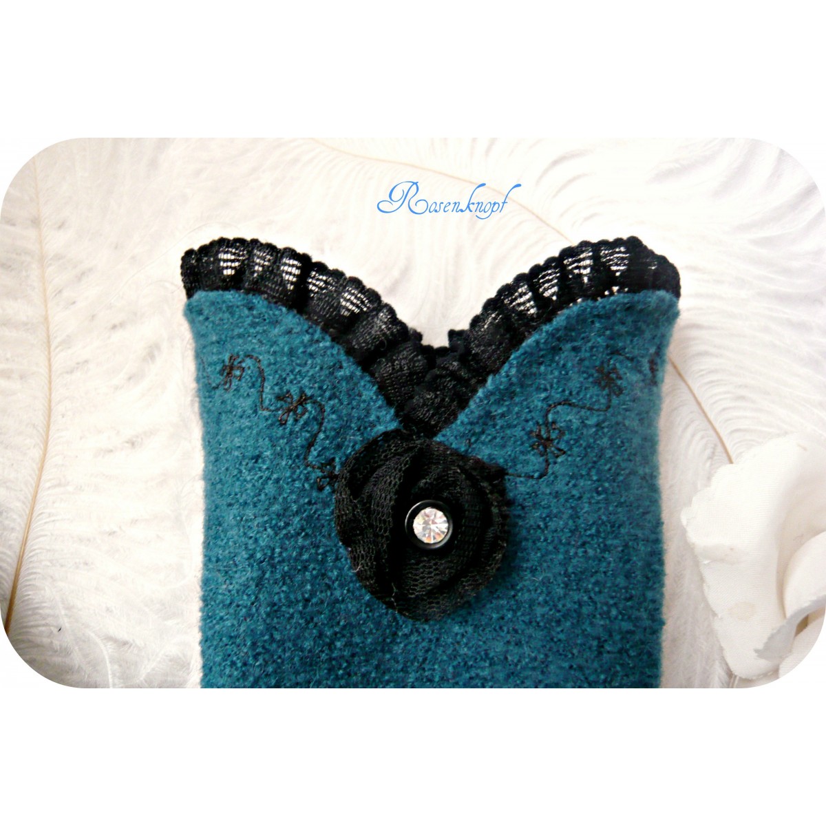 Romantische Akzente setzt das Tüllröschen dessen Mitte ein strassbestücktes Vintage Knöpfchen ziert.