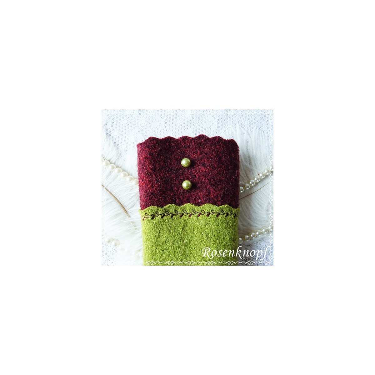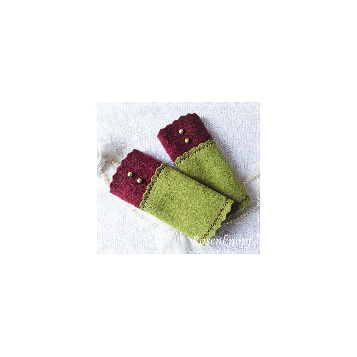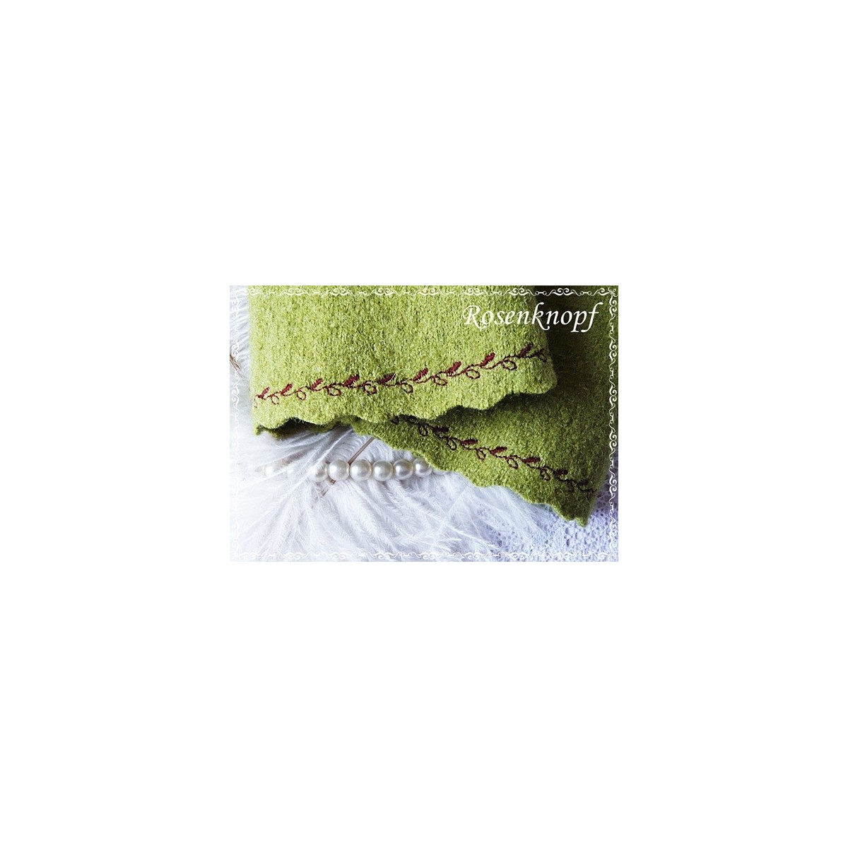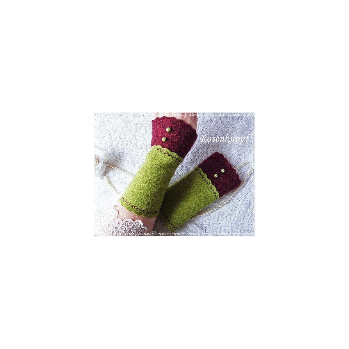 Romantische Akzente erhalten die Stulpen durch den angesetzten Walkstreifen in Rostrot, den Zierstich und zwei grünen Perlen.