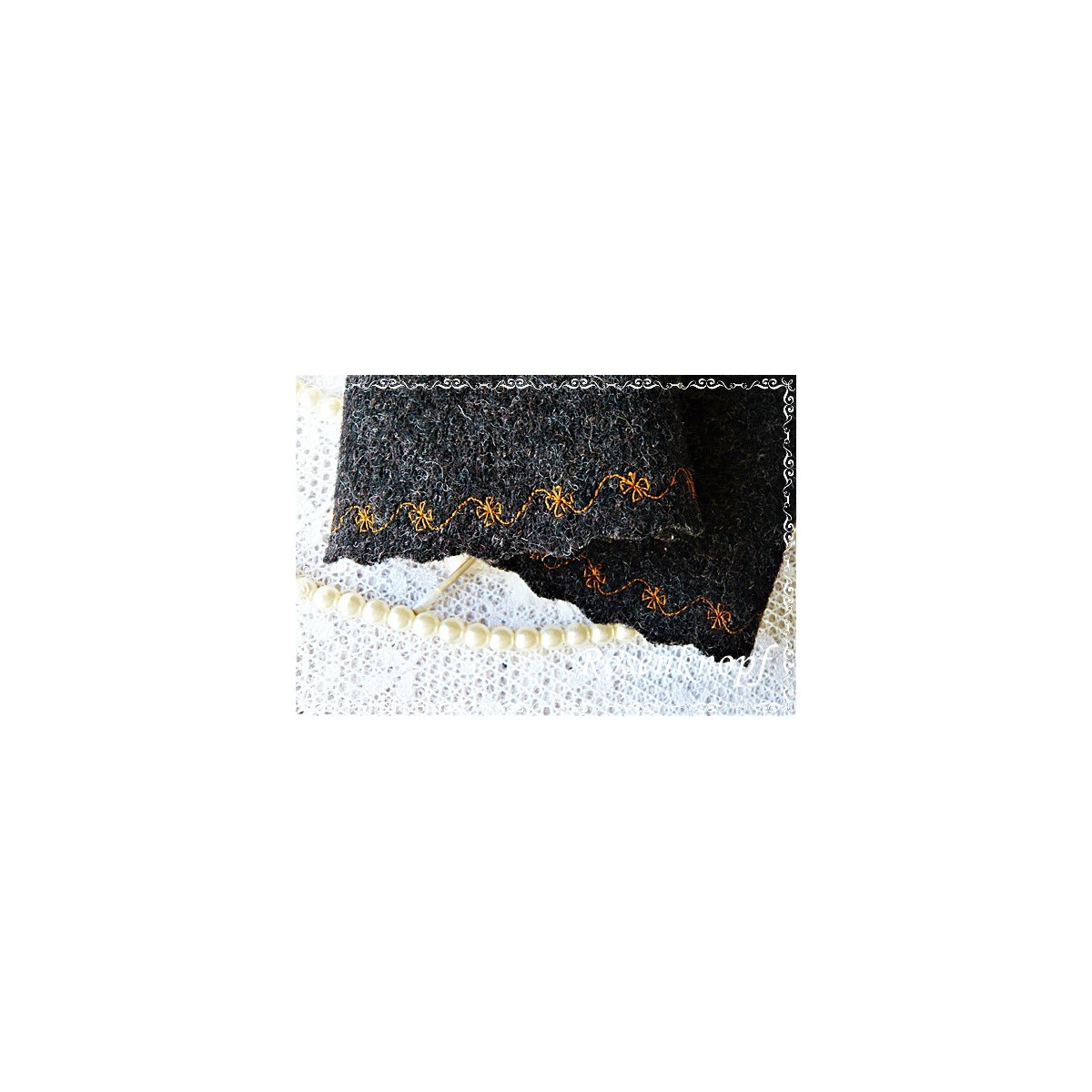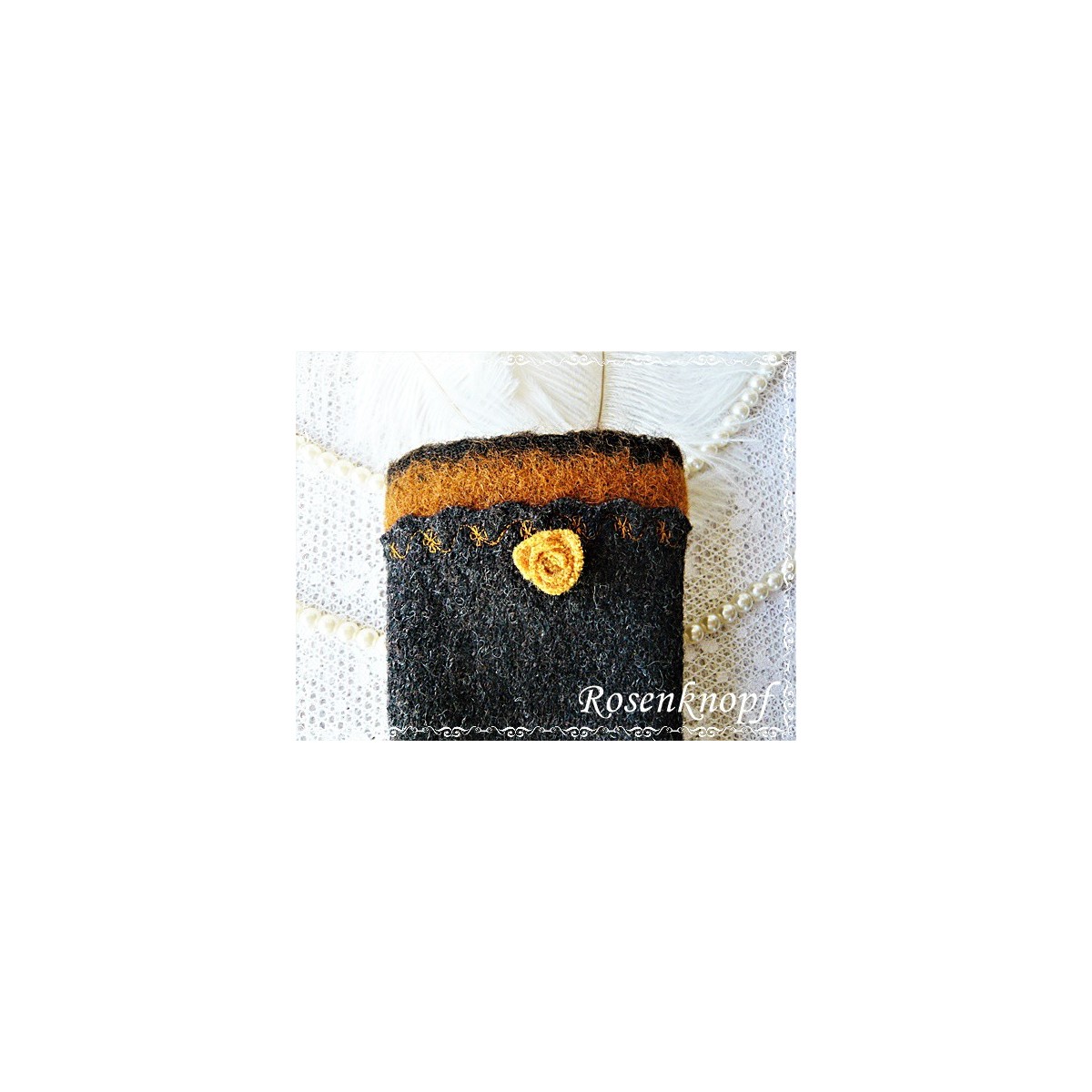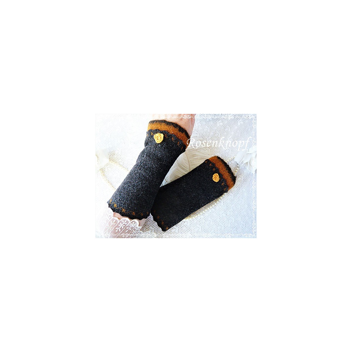 Romantische Akzente erhalten die Armstulpen durch den mit floralem Zierstich angesetzten Walkabschluss in Rehbraun und durch das von mir in Handarbeit gefertigte Walkröschen in farblich passendem Ocker.