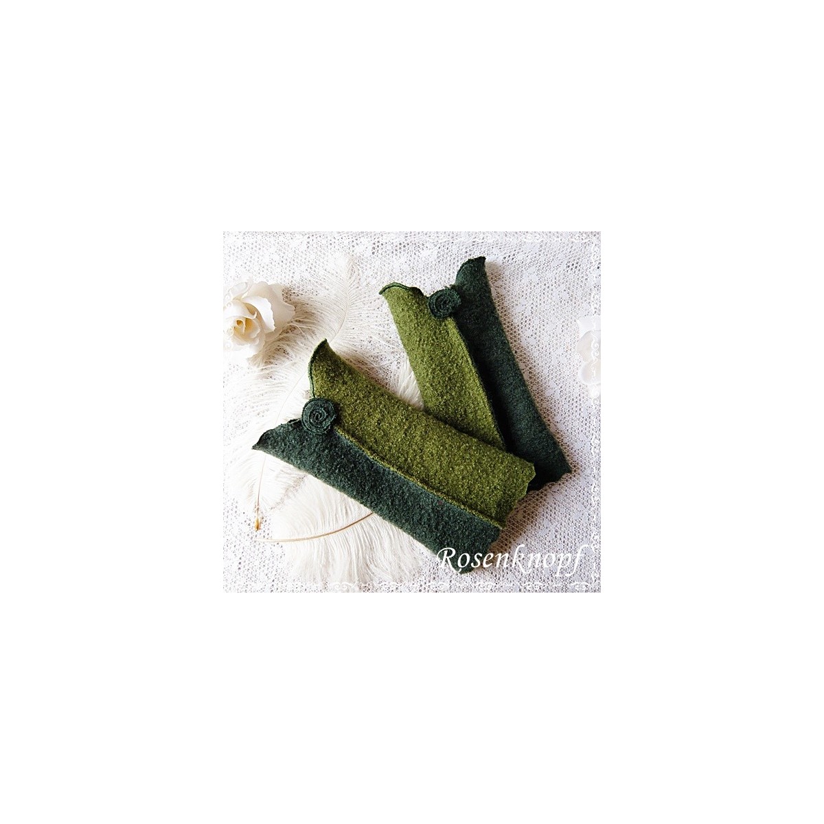 Romantische Akzente erhalten die Armstulpen durch das Walkröschen in der Schnittmitte der abgerundeten Kanten und die sichtbare Nahtstelle.
