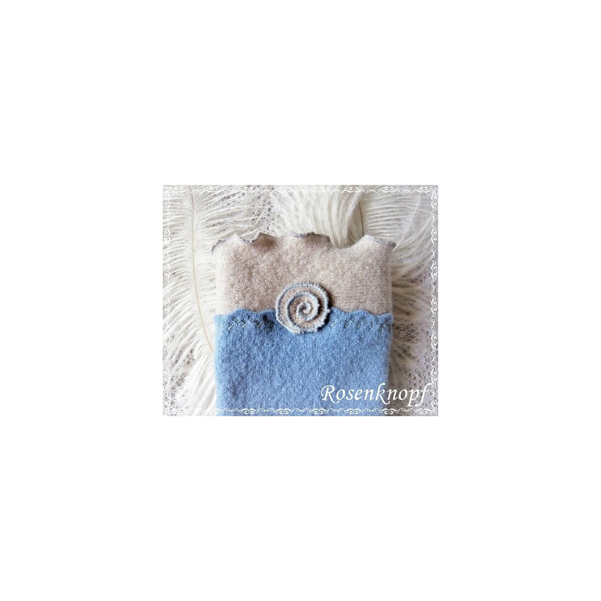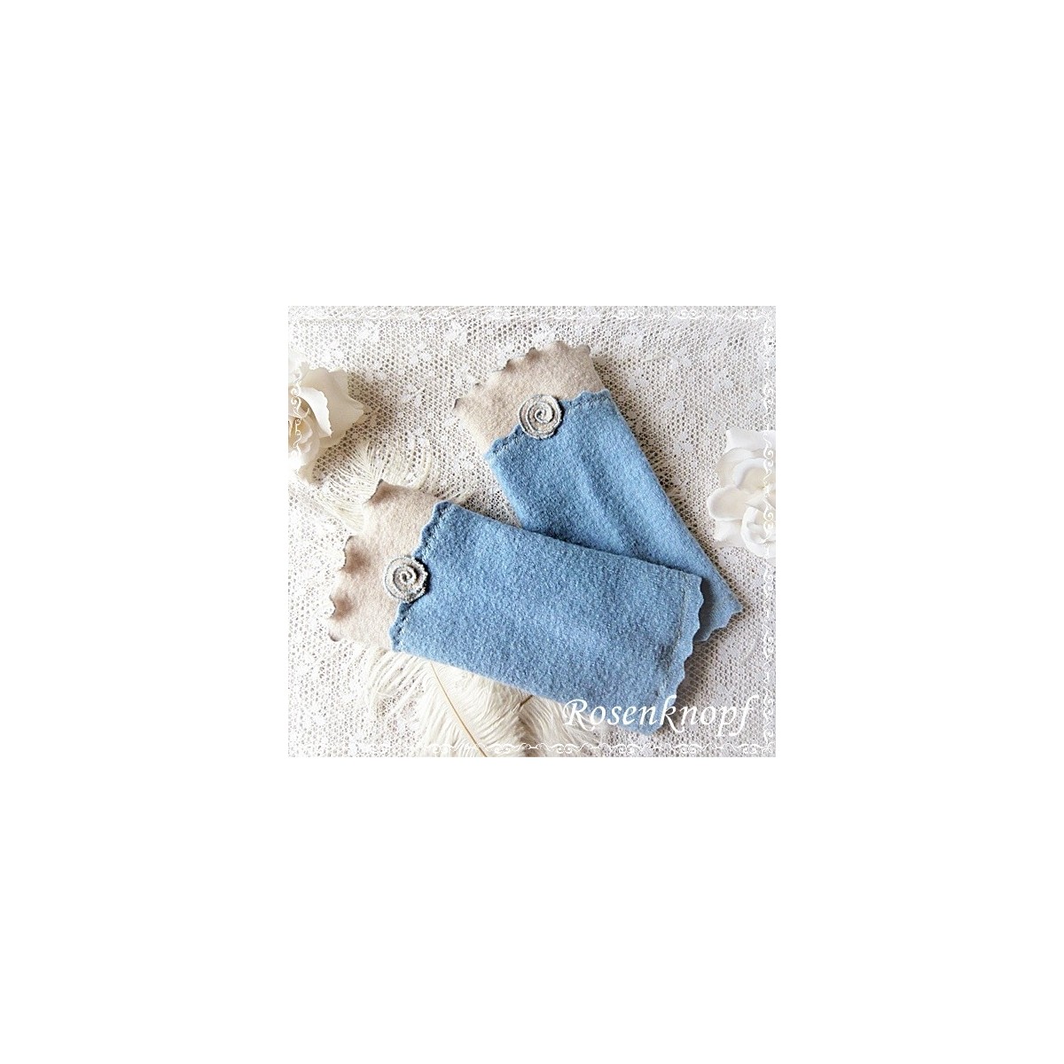 Elegante Walkstulpen in Hellblau mit angesetztem Walkstreifen in hellem Beige, wellig versäumter Kante und einer von mir in Handarbeit gefertigten Walkrose.