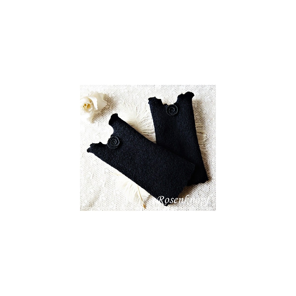 Romantische Akzente erhalten die Armstulpen durch das Walkröschen in der Schnittmitte und die wellig versäumte Kante.