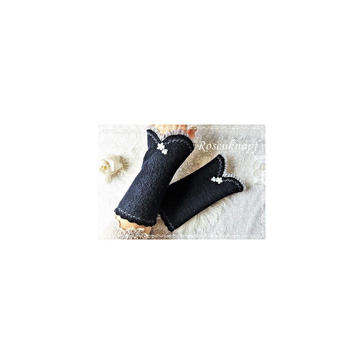 Romantische Akzente erhalten die Armstulpen durch den verspielten Einschnitt mit zarter Spitzenborte in Graublau, der Blütenapplikation in Ivory und Hellblau und einer Ziernaht.