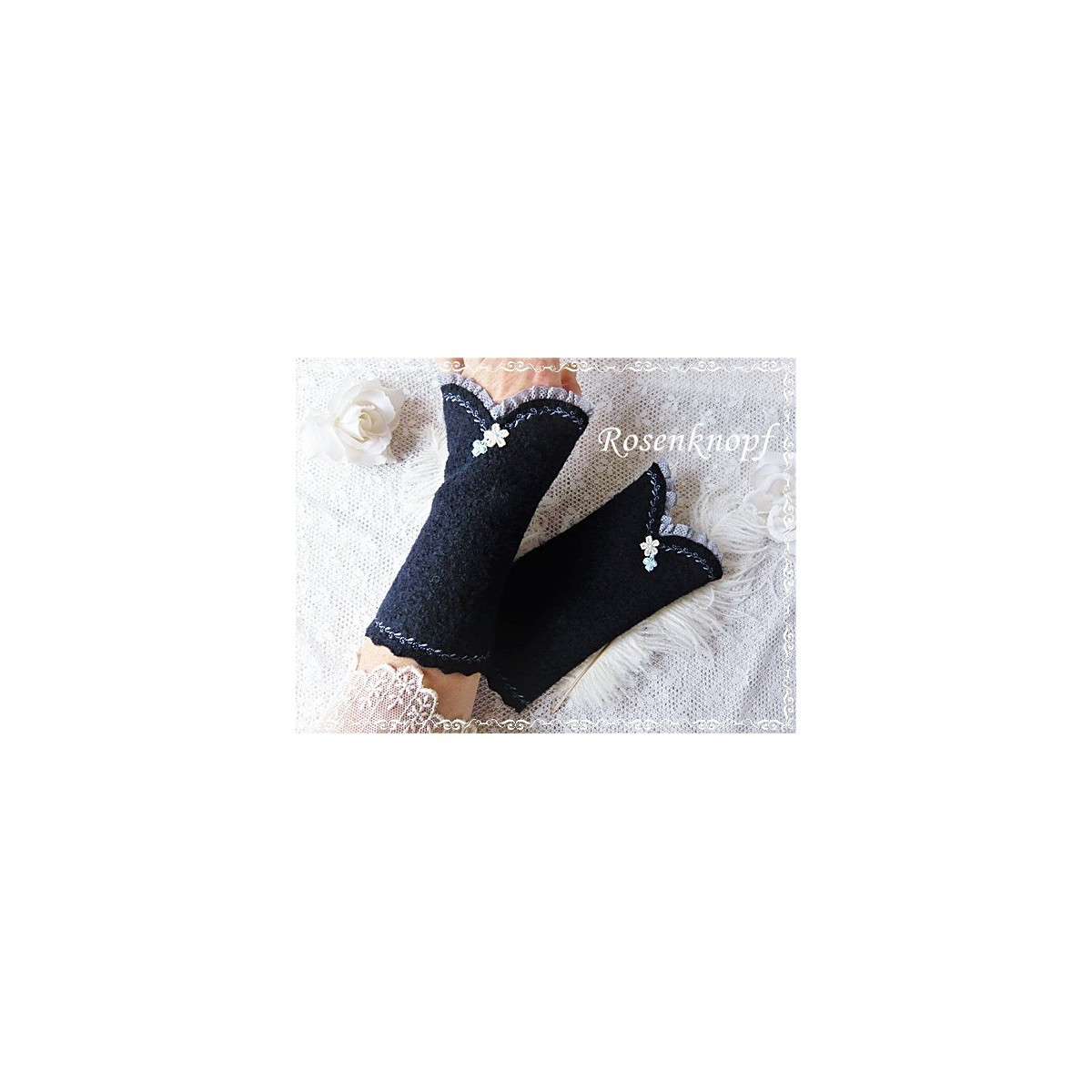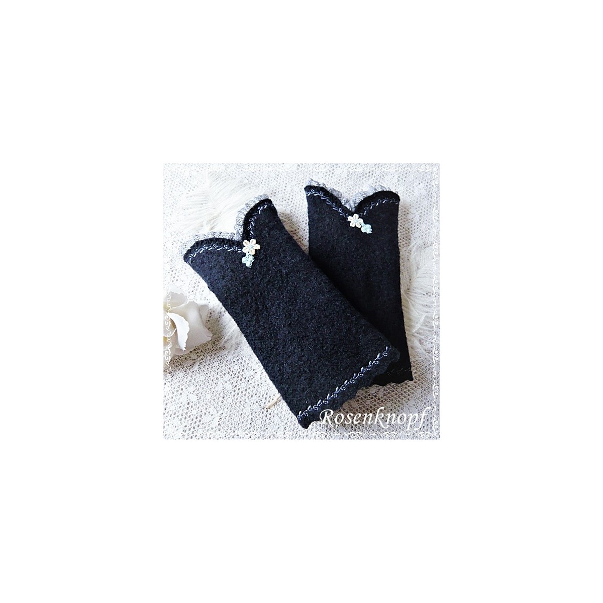 Romantische Akzente erhalten die Armstulpen durch den verspielten Einschnitt mit Spitzenborte in Grau, der Vintage Stickapplikation und floralen Ziernähten.