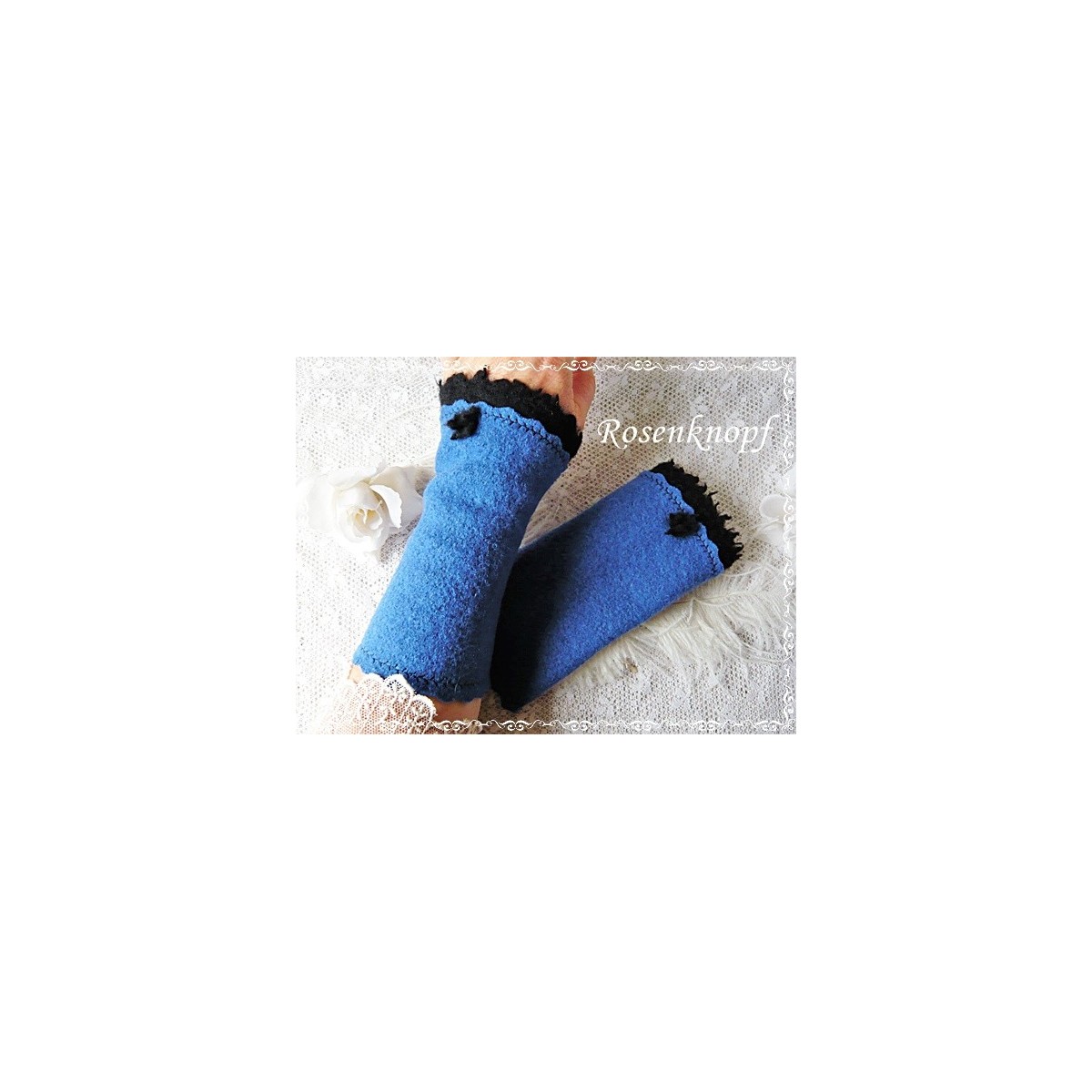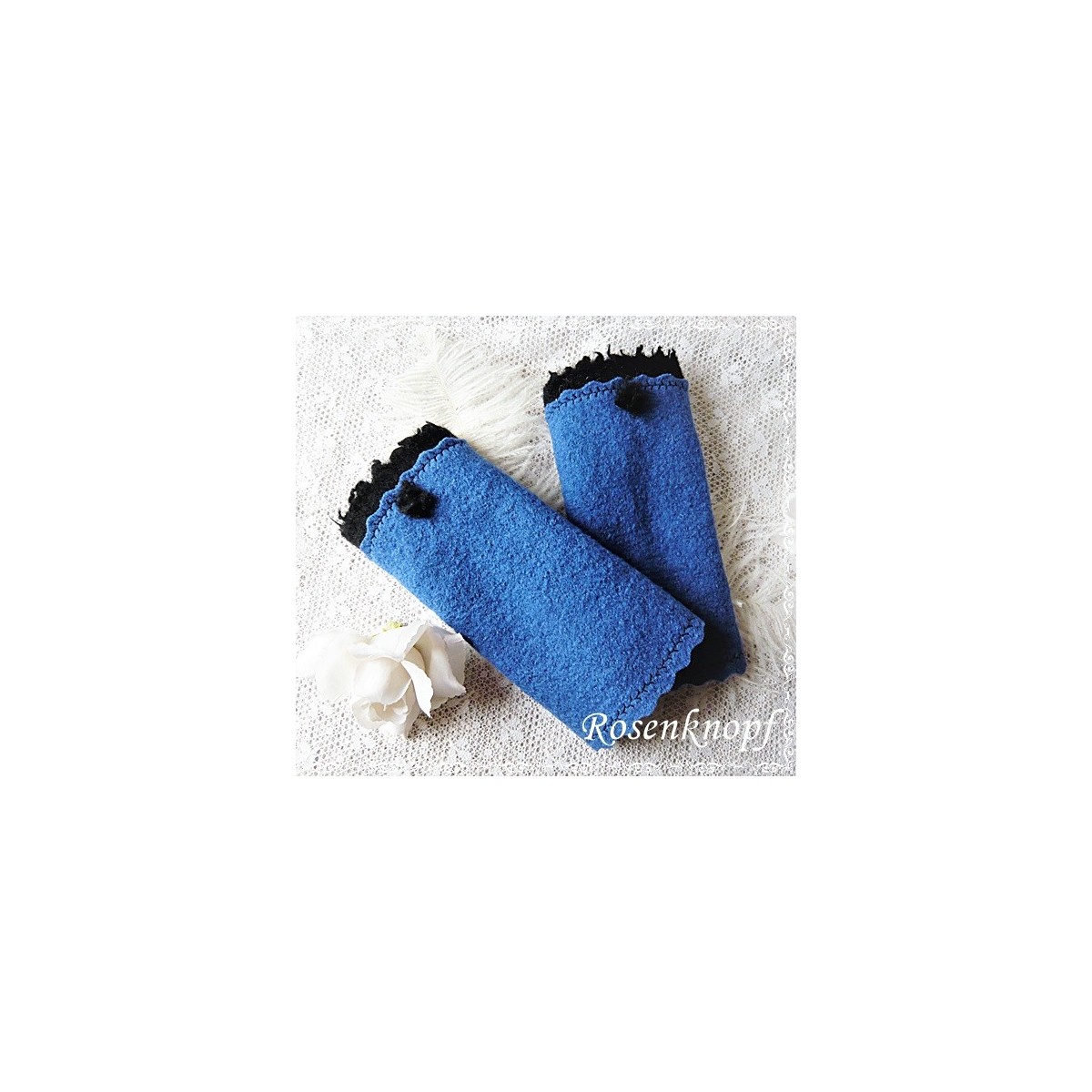 Romantische Akzente erhalten die Armstulpen durch den angesetzen schwarzen Walk mit fransigem Abschluss und dem zottigen Röschen.