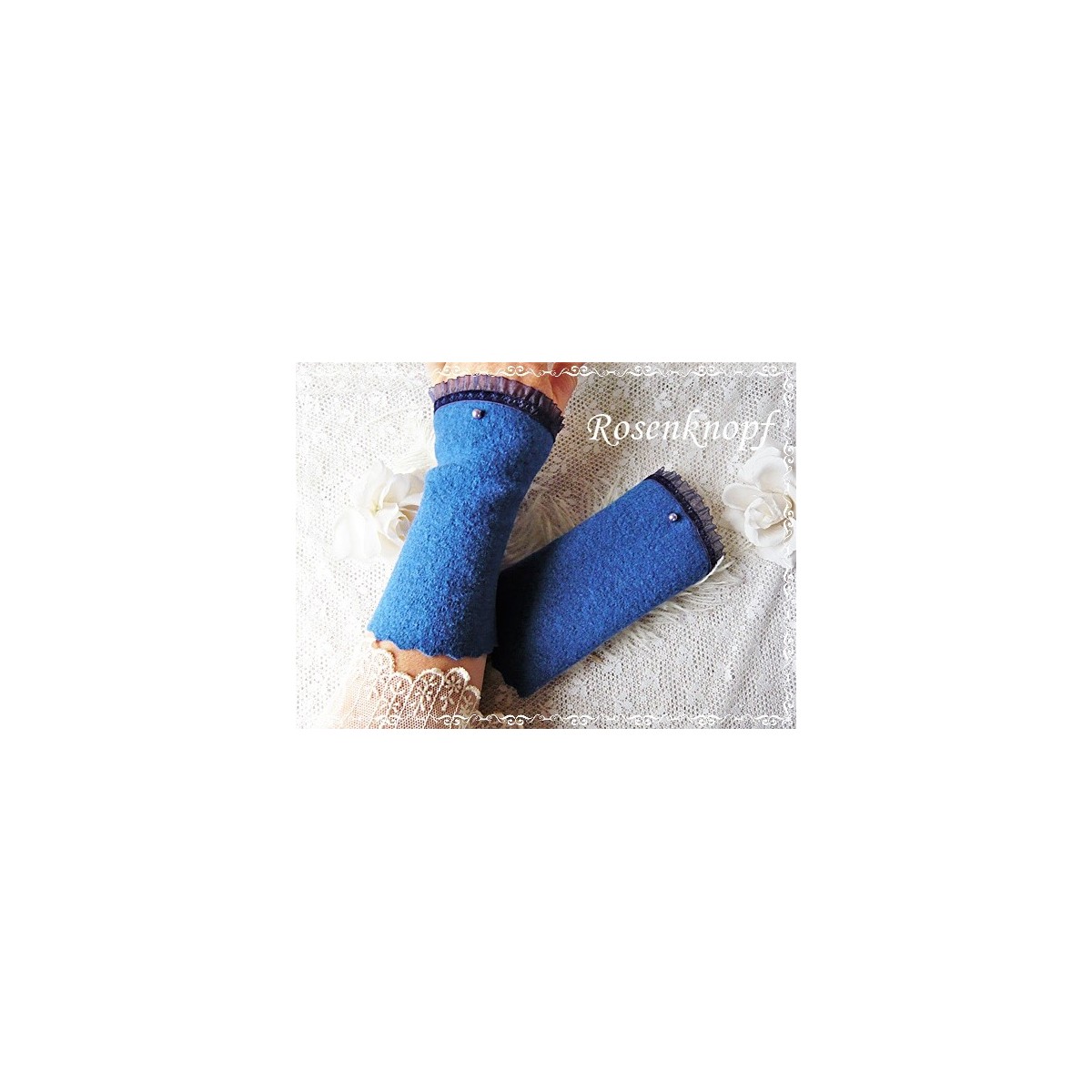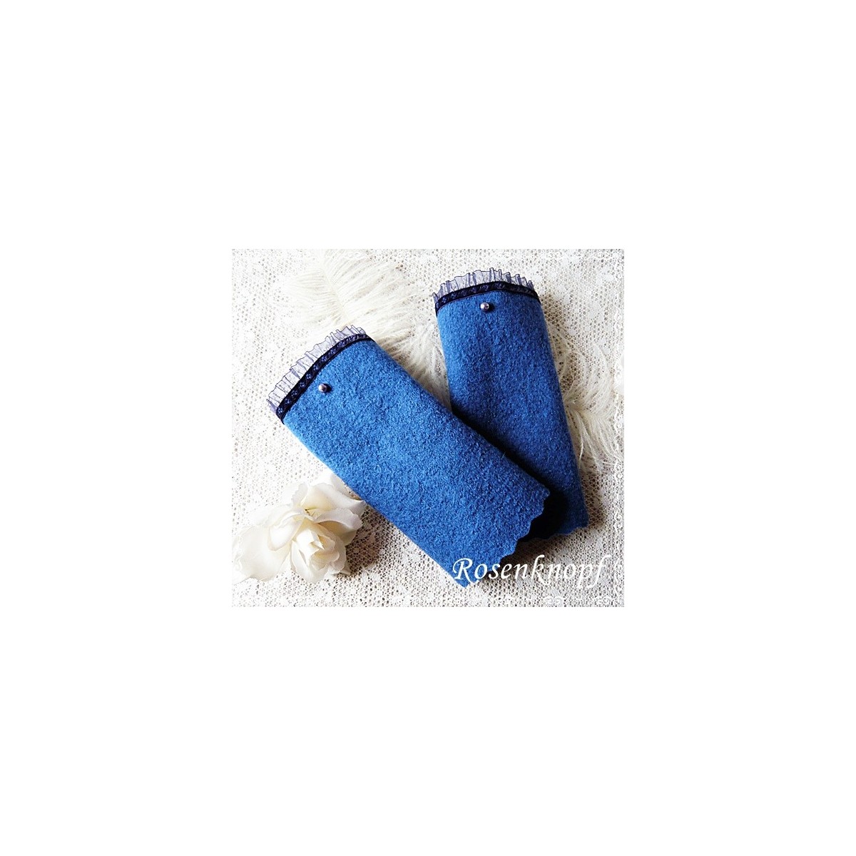 Romantische Akzente erhalten die Armstulpen durch das nachtblaue Samtband mit Organzarüsche und die Merano Glasperle