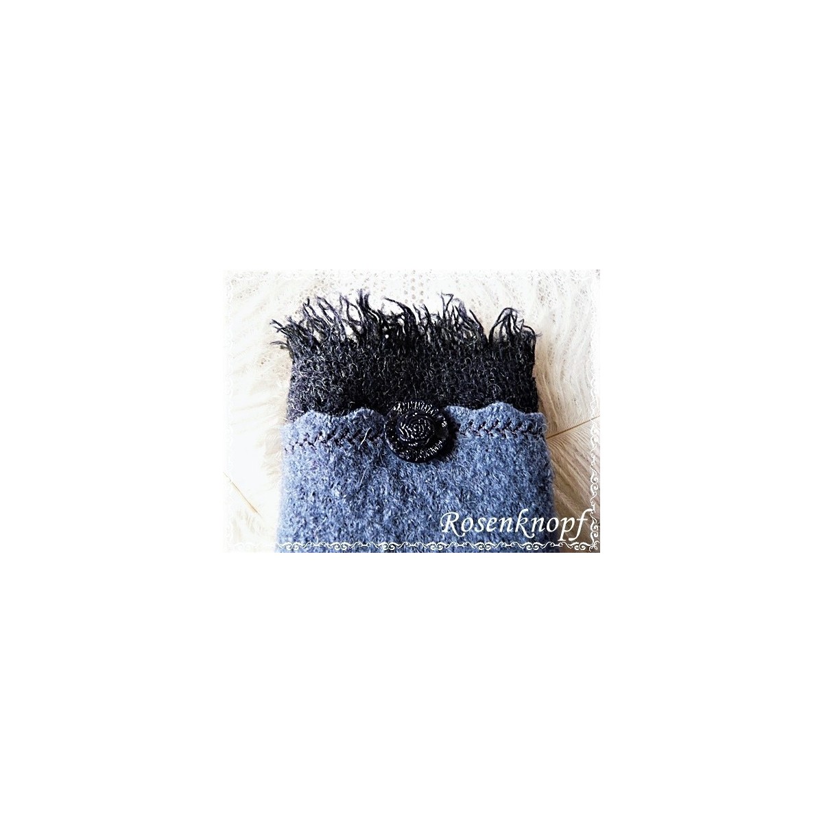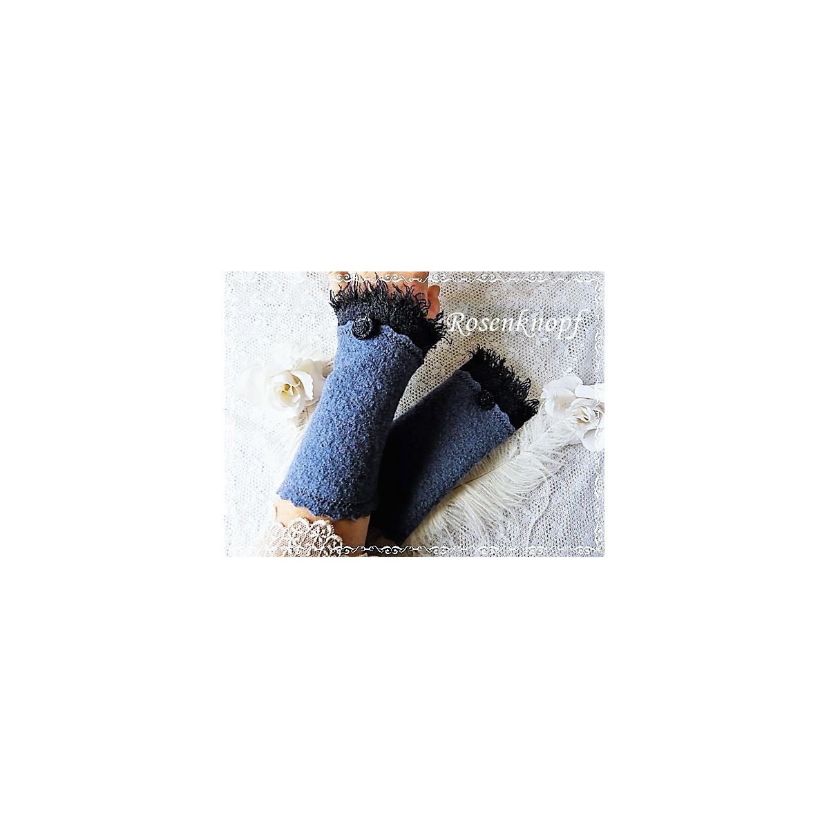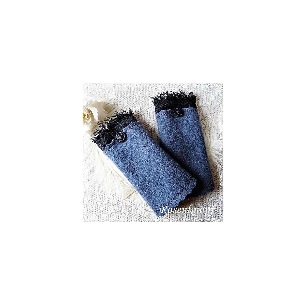 Romantische Akzente erhalten die Armstulpen durch den angesetzen Wollstoff mit Fransen, Ziernähten und dem schmucken, nachtblauen Vintage Knopf.