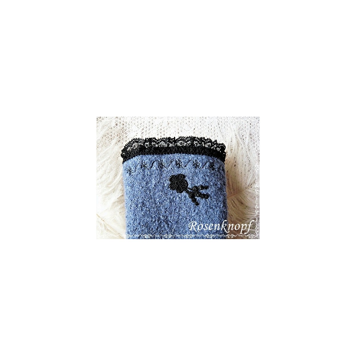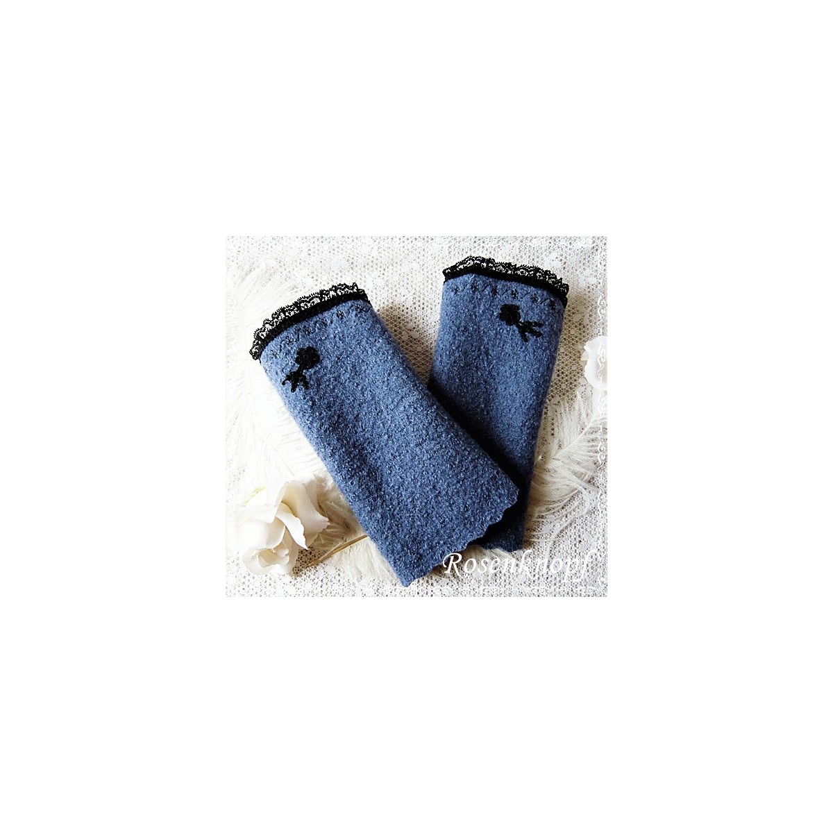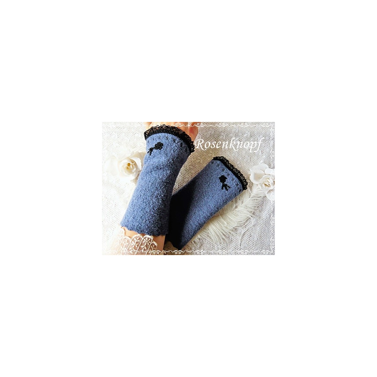 Romantische Akzente erhalten die Armstulpen durch die schwarze Spitzenborte, der floralen Vintage Stick-Applikation und einer Ziernaht