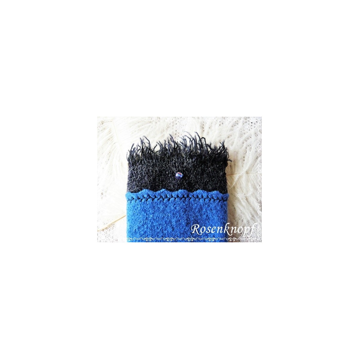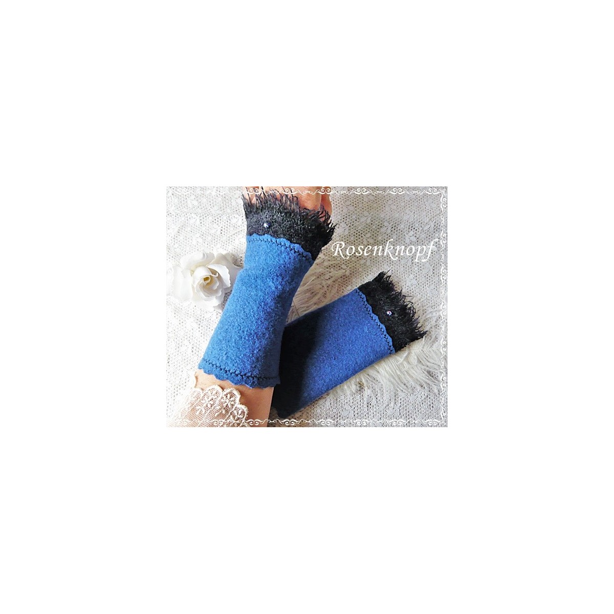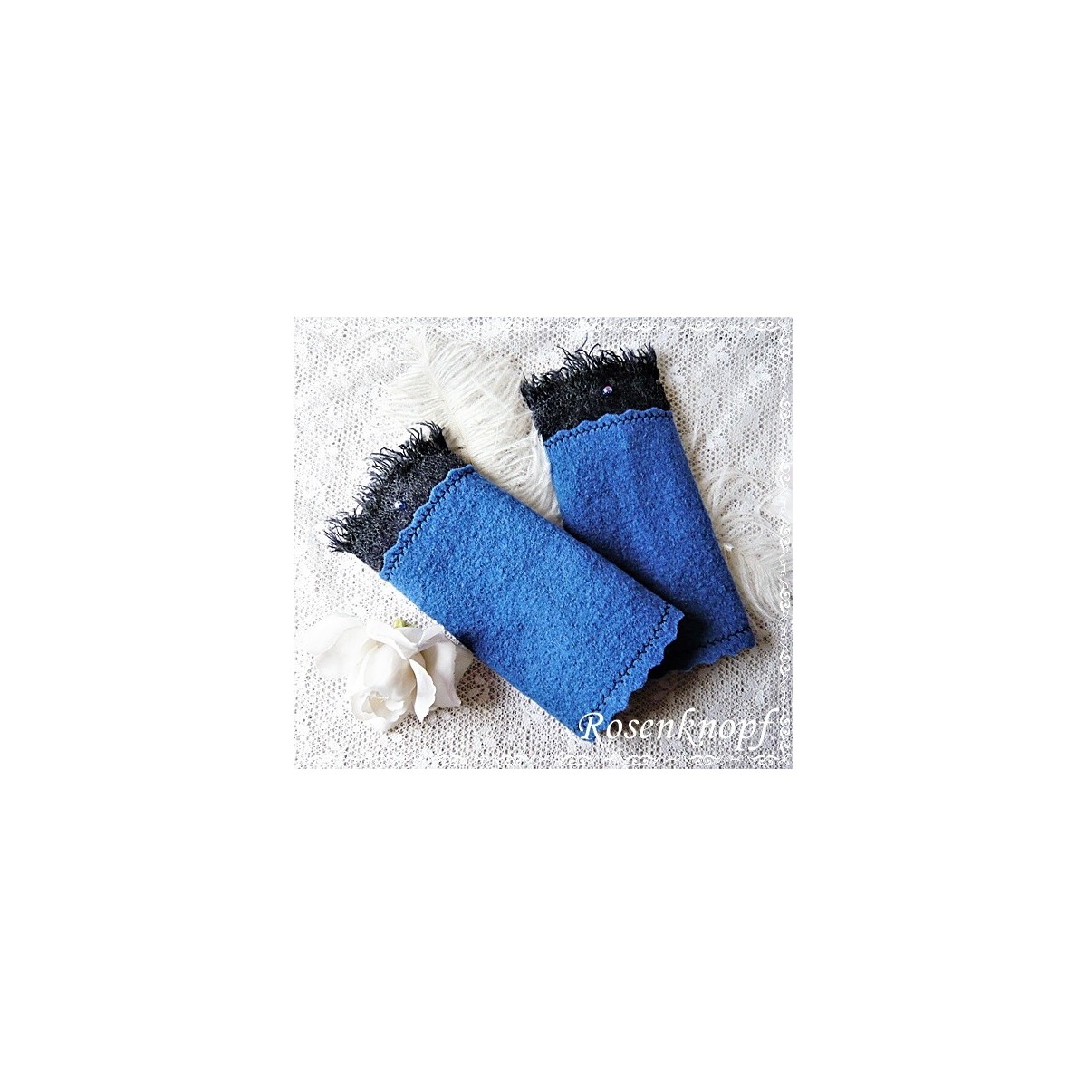 Romantische Akzente erhalten die Armstulpen durch den nachtblauen Wollstoff mit Fransen, Ziernähten und schmucker Perle.