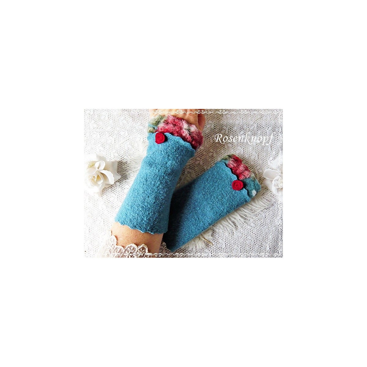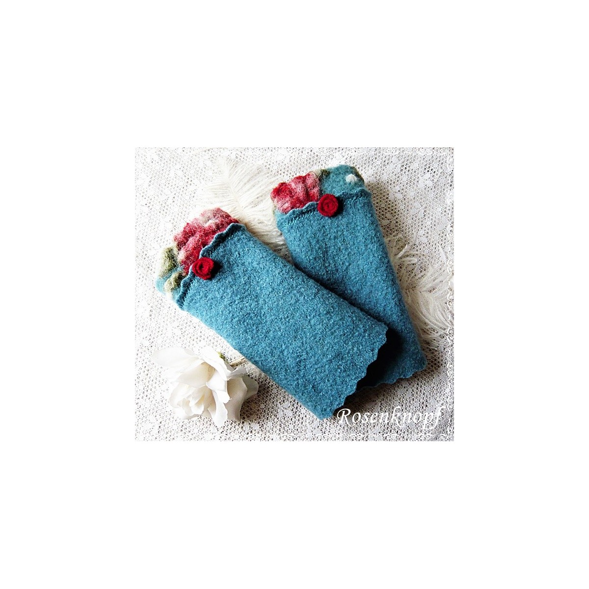 Romantische Akzente erhalten die Armstulpen durch das Röschen in Kirschrot und den angesetzten, versäumten Walkabschluss mit Reliefmuster.