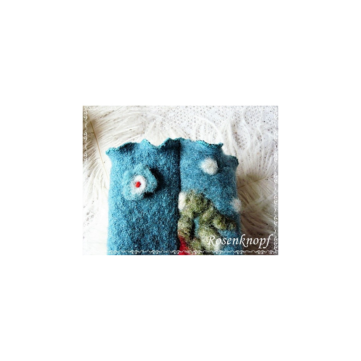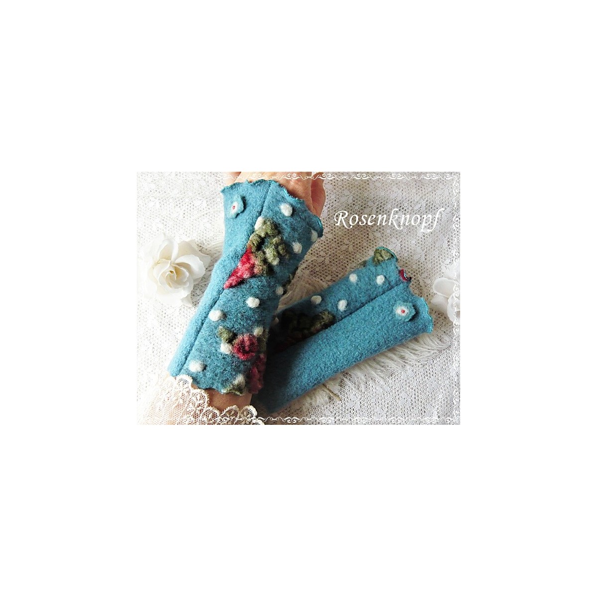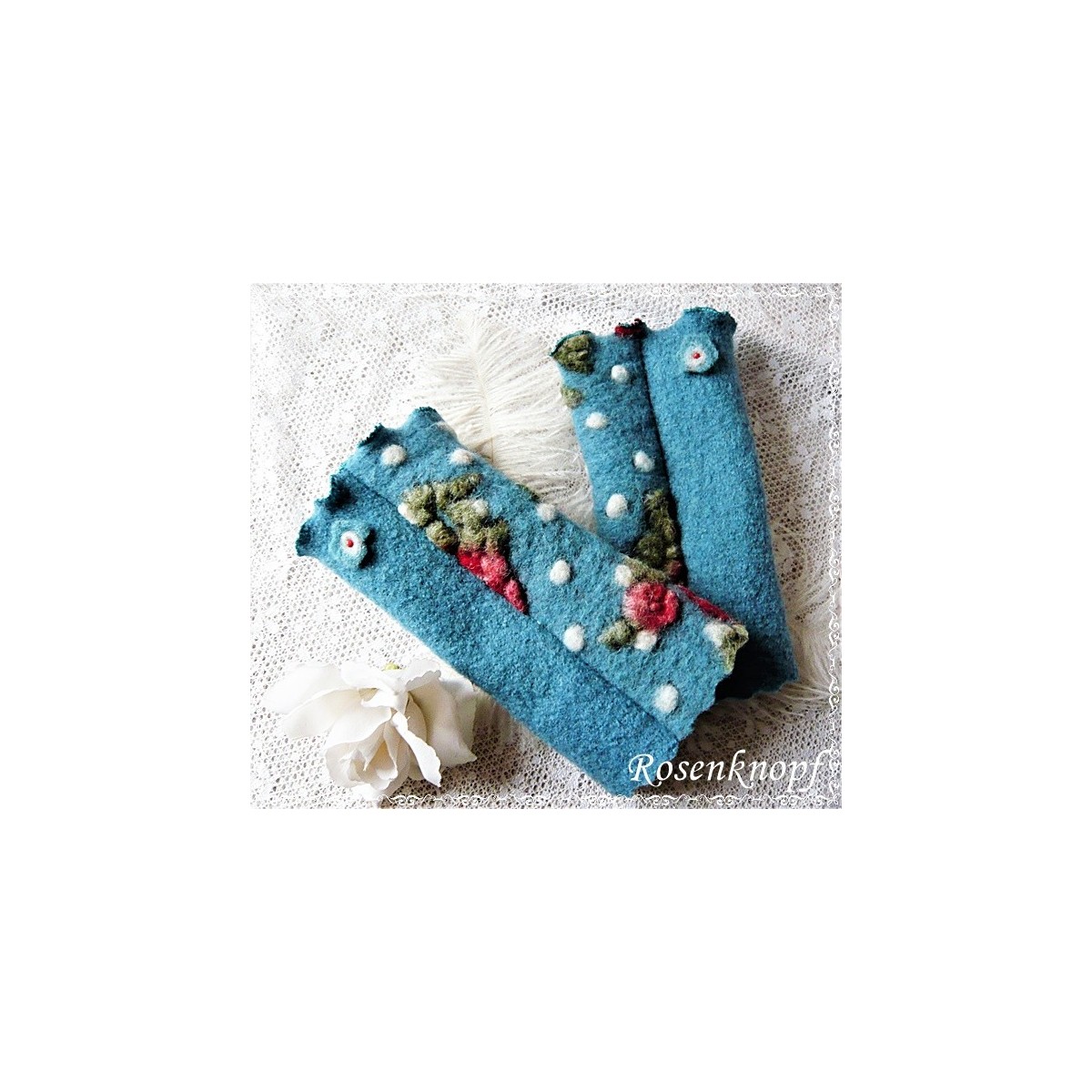 Romantische Akzente erhalten die Armstulpen durch den Mix aus Walk mit Rosen-Reliefmuster und dem einfarbigen Walk, den ein kleines Walkblümchen mit roter Perle ziert.
