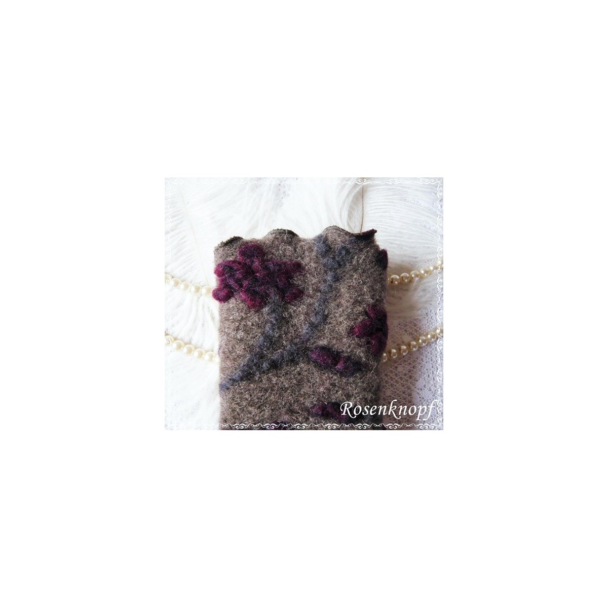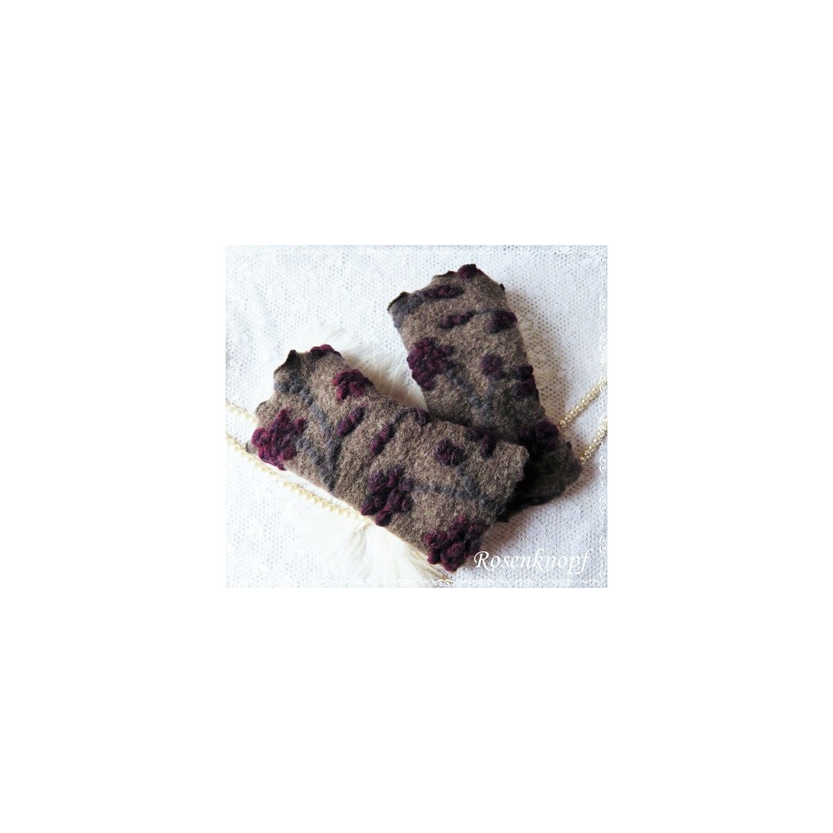 Kuschelige und wärmende Walkstulpen aus hochwertigem Relief-Walk in Braun mit floralem Muster in Bordeaux und Blaugrau.