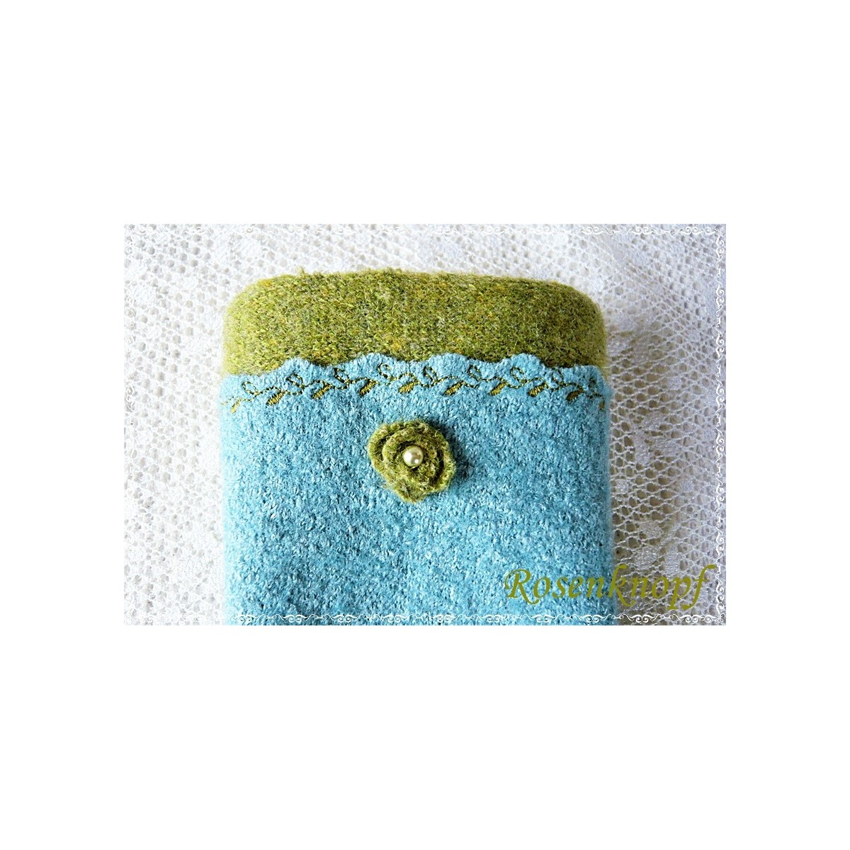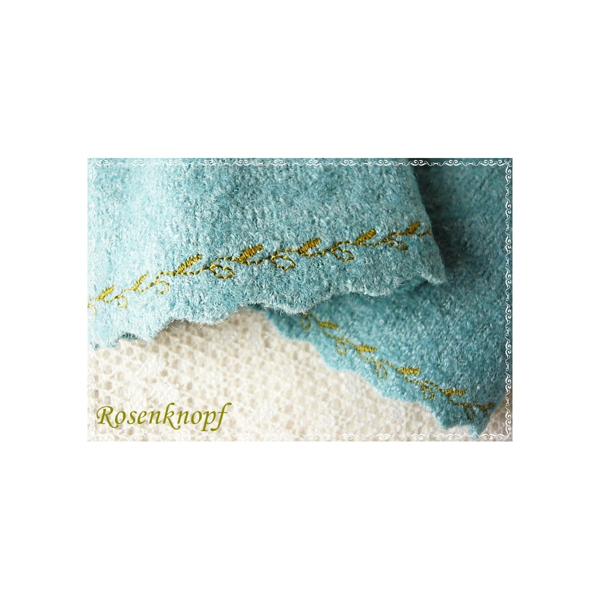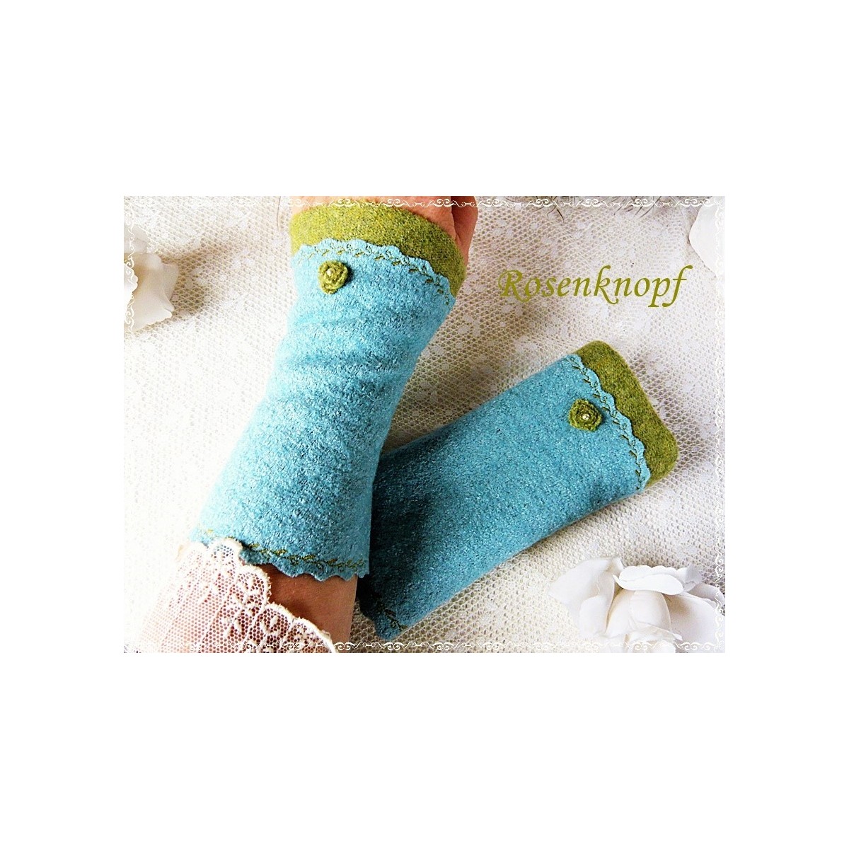 Romantische Akzente erhalten die Stulpen durch die Walk Kante in Hellgrün und das in Handarbeit gefertigte Walkröschen mit kleiner Perle in der Mitte.