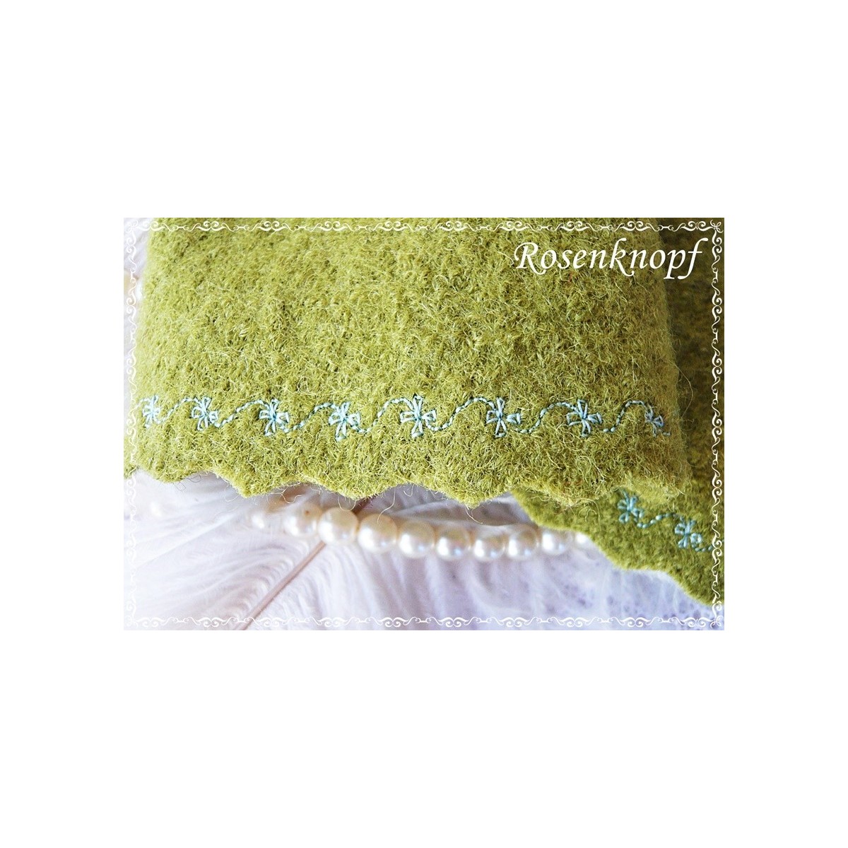 Romantische Akzente erhalten die zweifarbigen Armstulpen durch den mit floralem Zierstich angesetzten Walk in Hellblau mit seiner wellig versäumten Kante und das kleine von mir in reiner Handarbeit gefertigte Walkröschen.