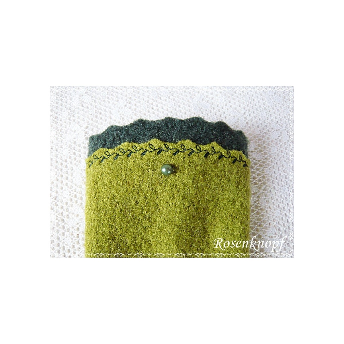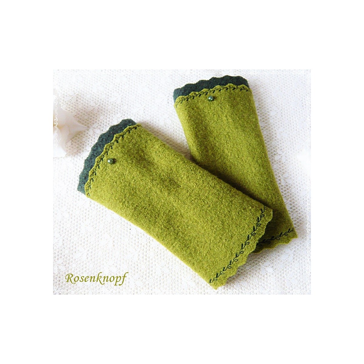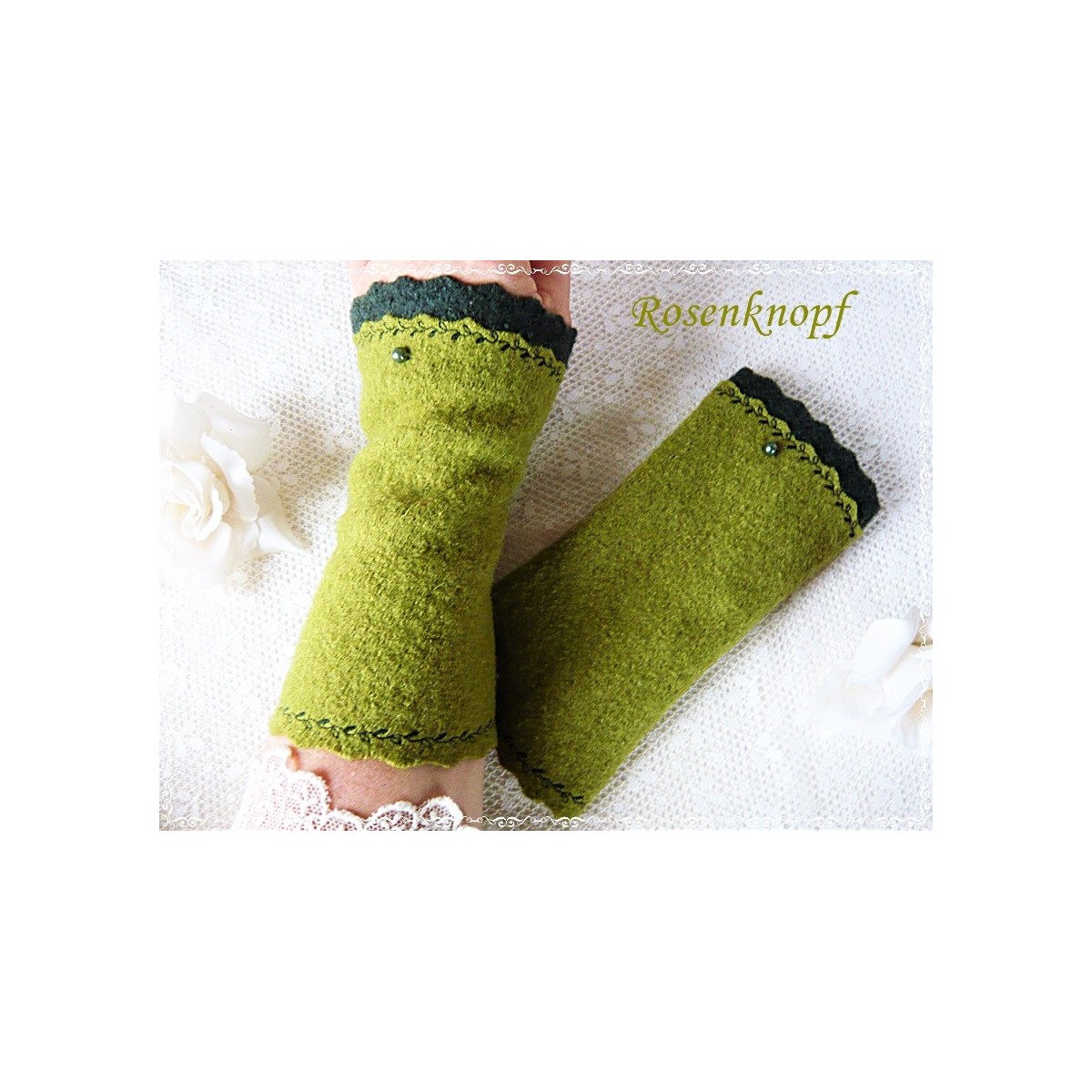 Romantische Akzente erhalten die zweifarbigen Armstulpen durch den mit floralem Zierstich angesetzten Walk in Dunkelgrün mit seiner welligen Kante und die farblich passende Perle.