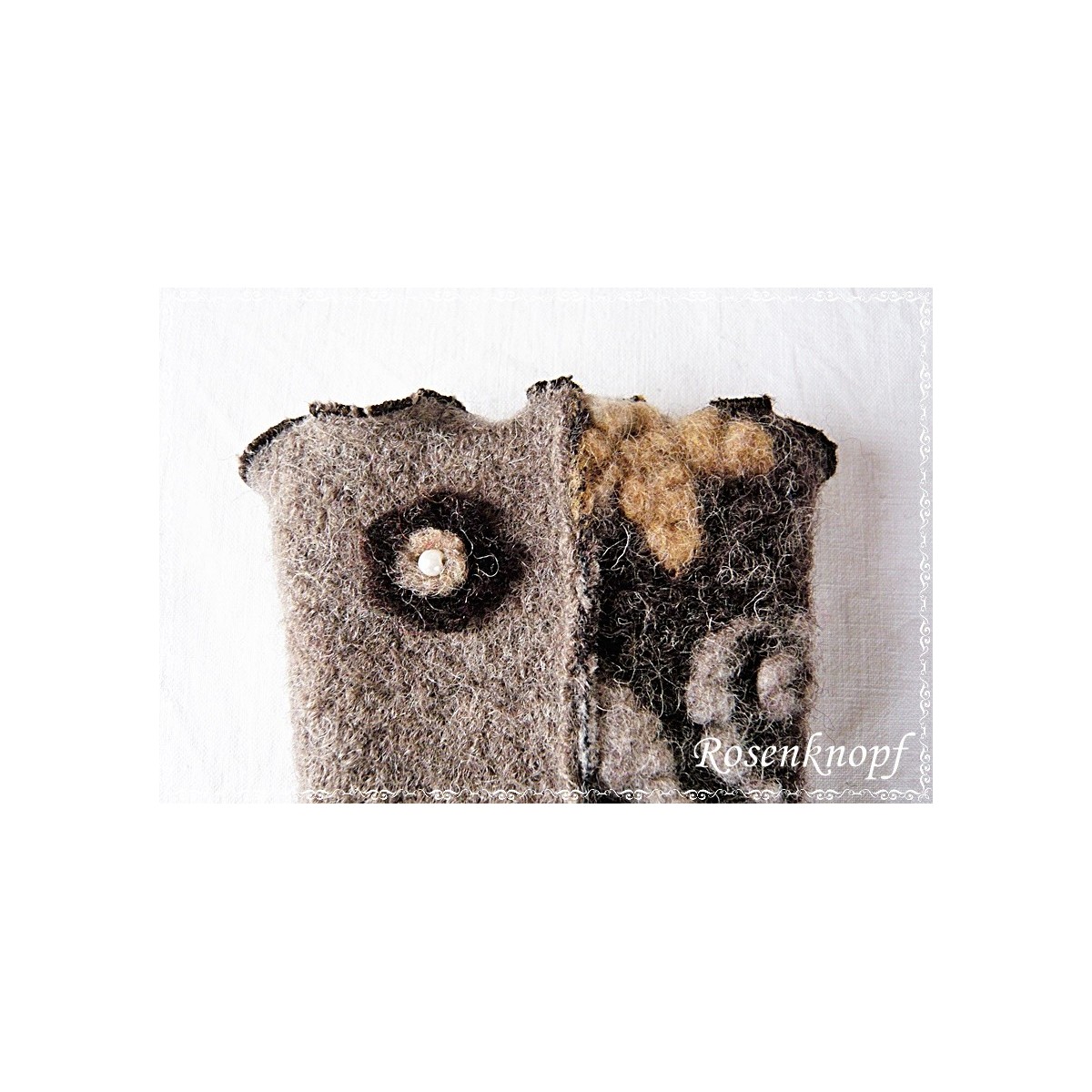 Romantische Akzente erhalten diese einzigartigen Armstulpen durch längs verlaufende Sichtnaht, die wellig versäumte vordere Kante und das schmucke Walkblümchen mit Perle in der Mitte.