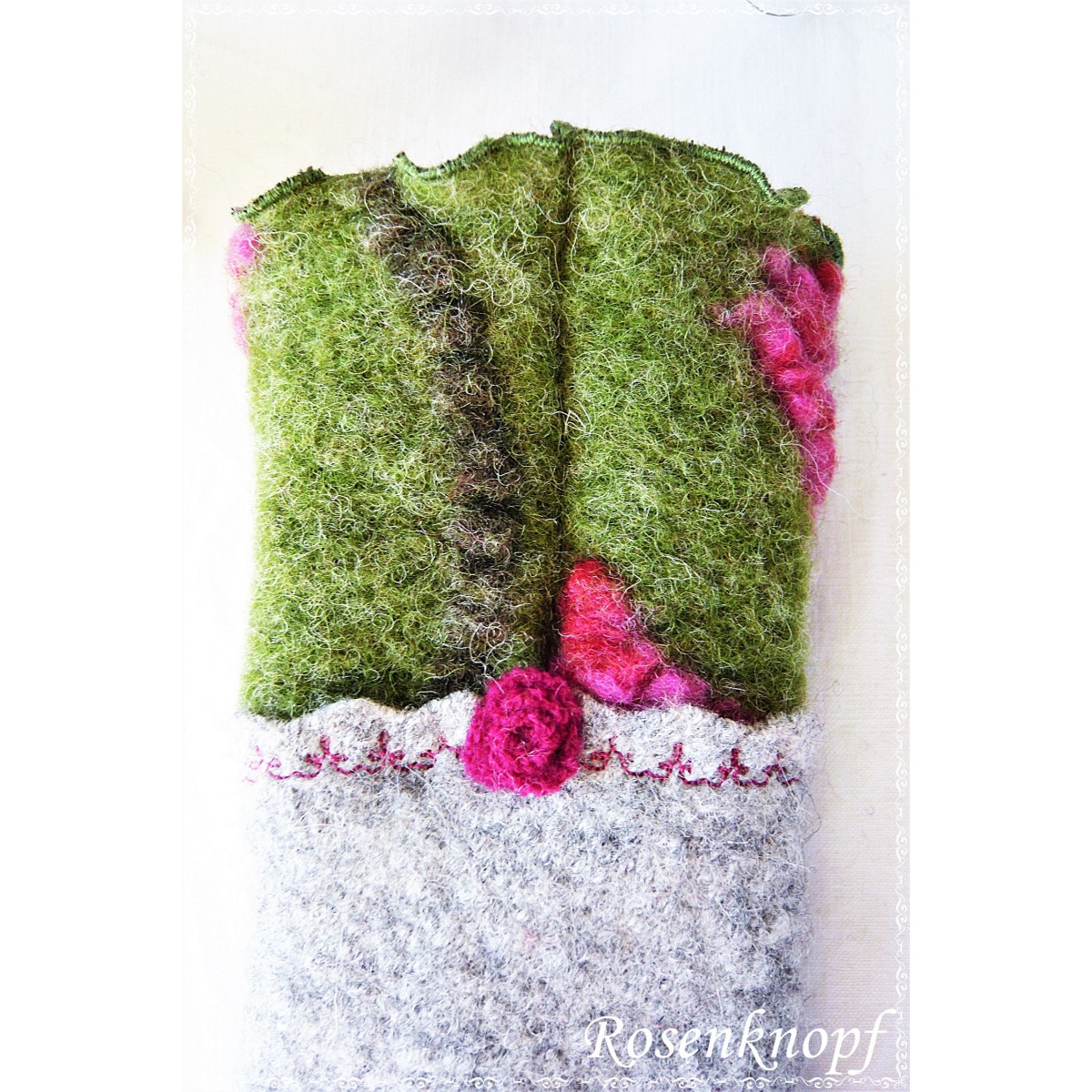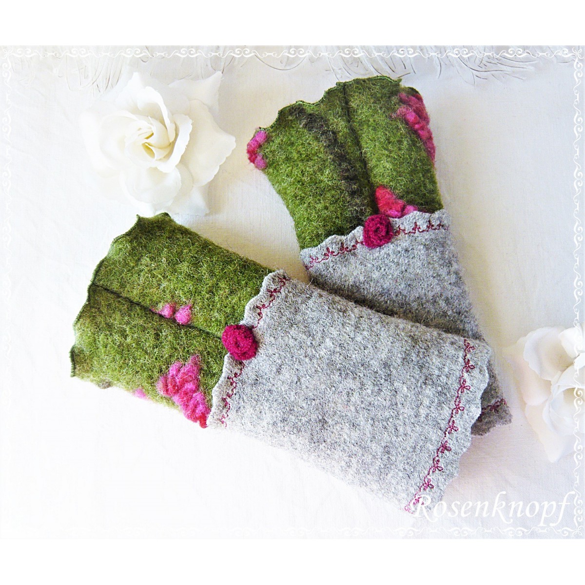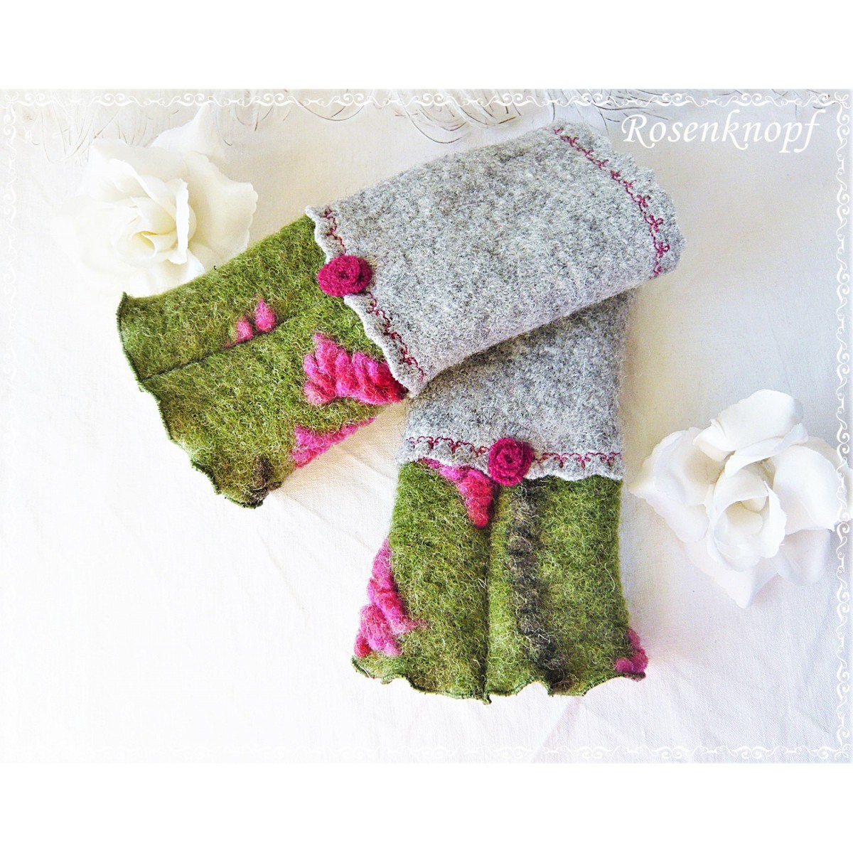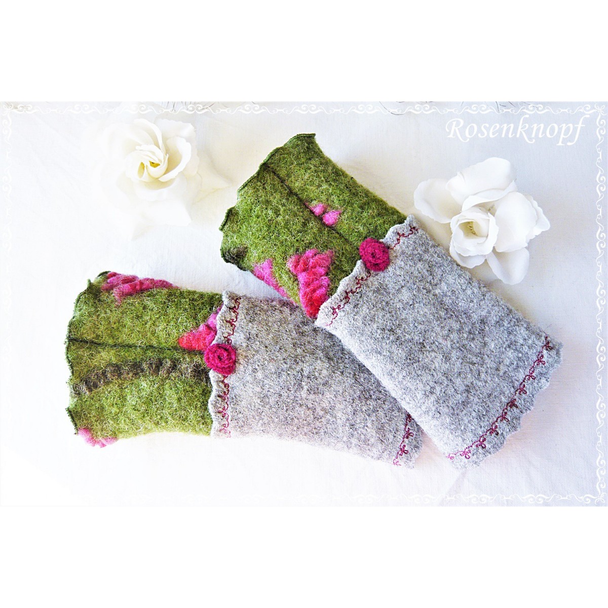 Schöne Akzente erhalten die Armstulpen durch den mit floralem Zierstich angesetzten Reliefwalk mit Pinkfarbenen erhabenen Blüten und seiner wellig versäumten Kante und das zauberhafte von mir in Handarbeit gefertigte Walkröschen in Pink.