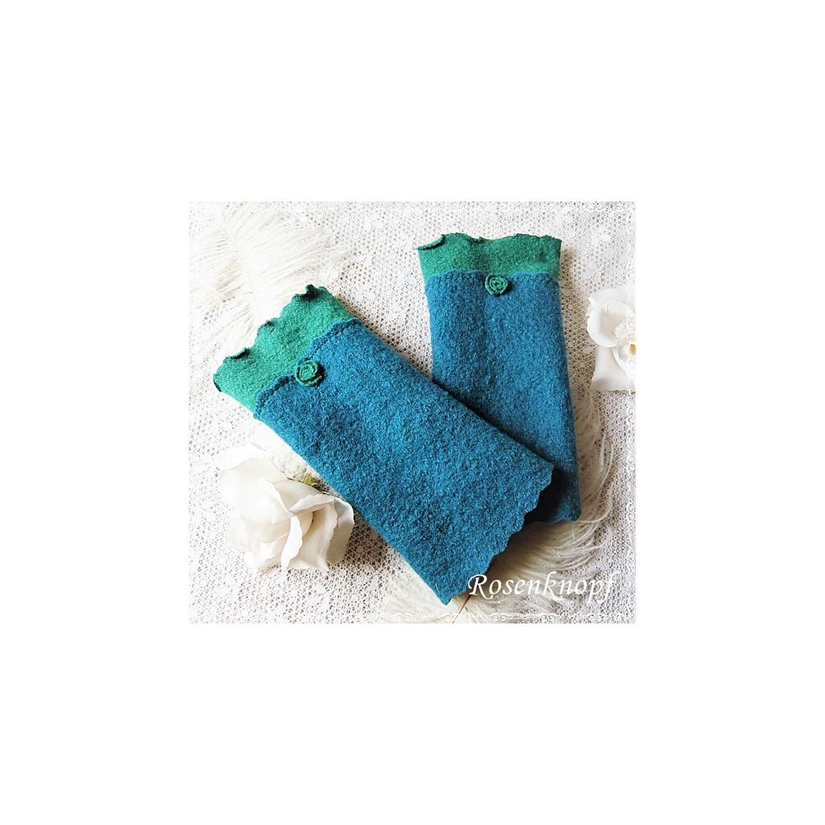 Romantische Akzente erhalten die einzigartigen Armstulpen durch den vorne mit Zierstich angesetzen, smaragdfarbenen Strickwalk mit seiner wellig versäumten Kante und einer von mir handgefertigten Walkrose in smaragdgrün.