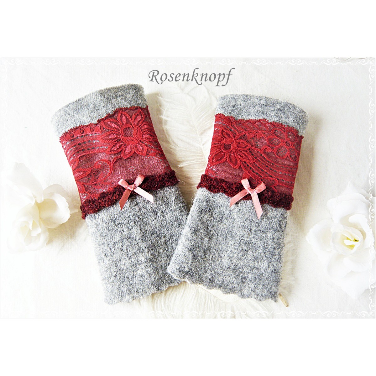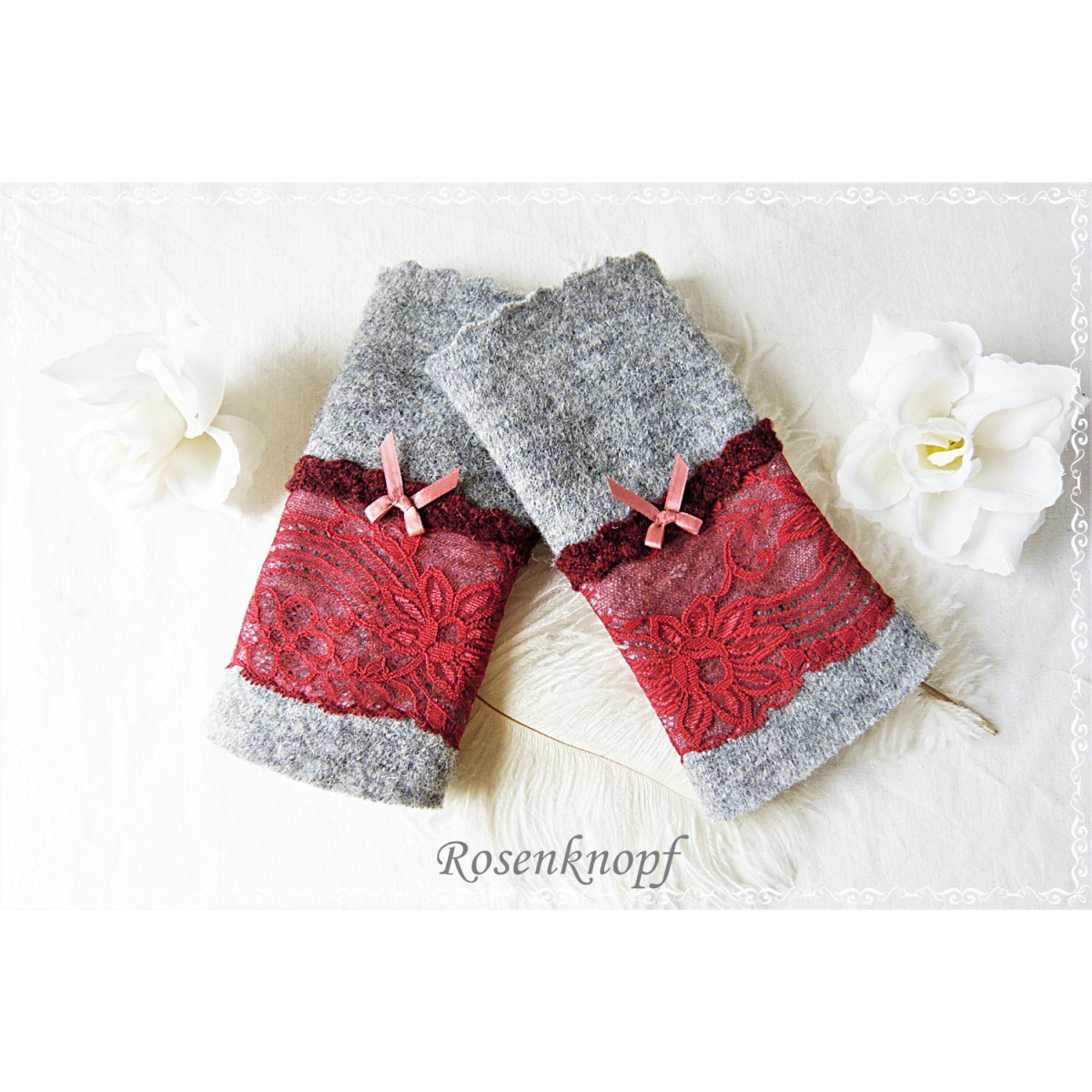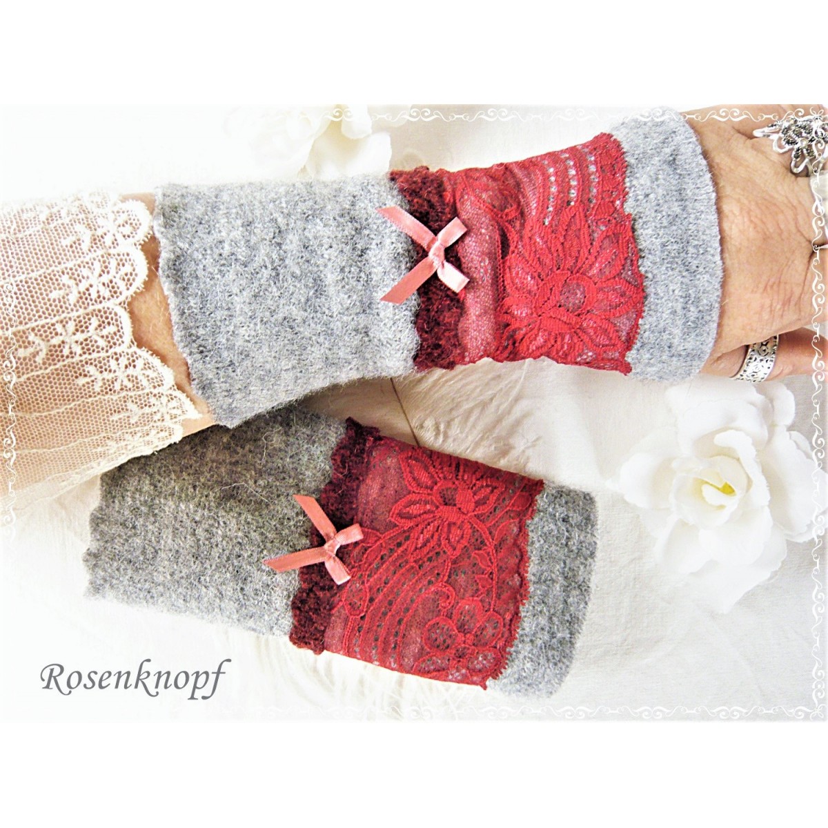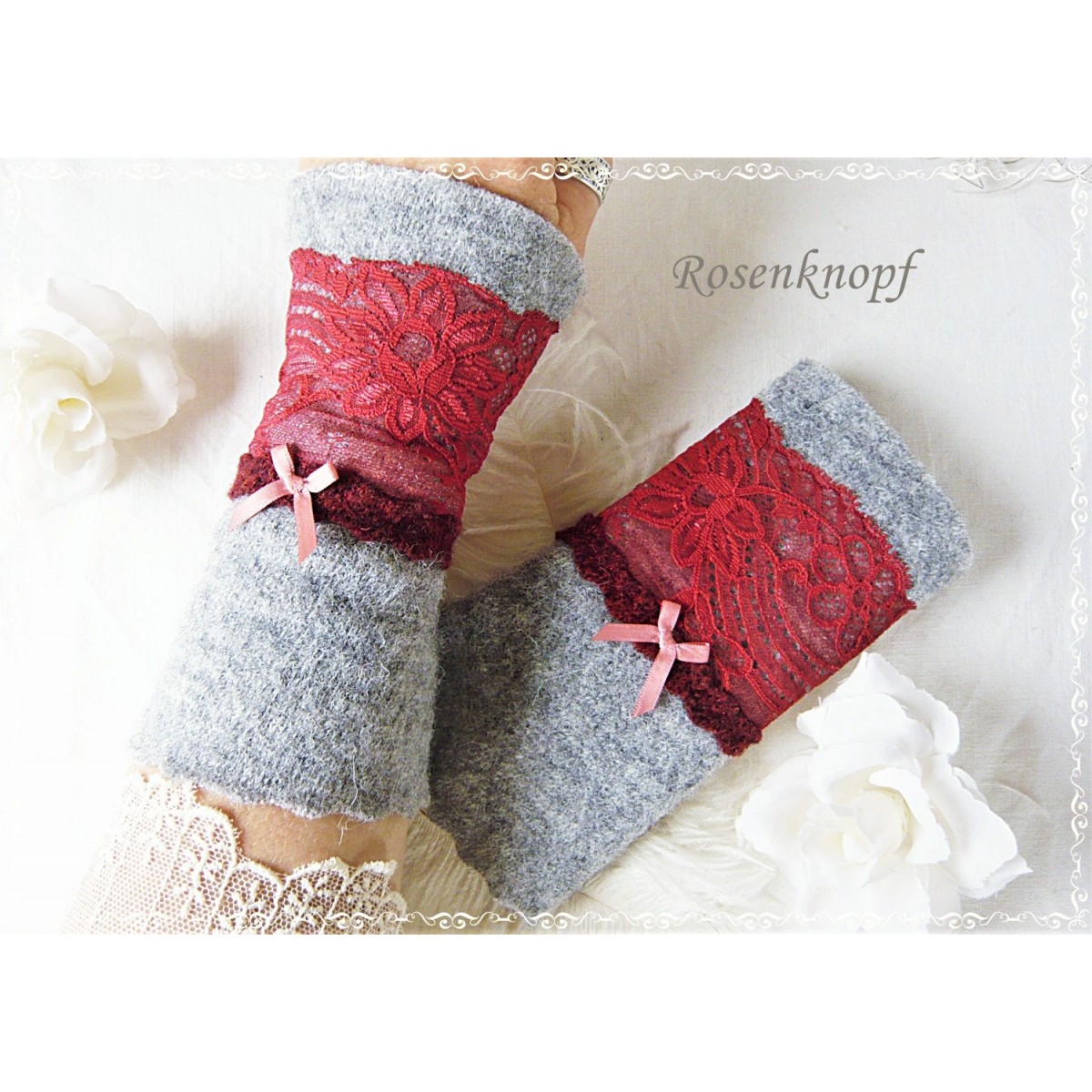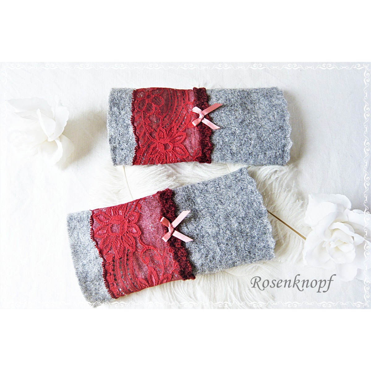 Romantische Akzente erhalten diese zeitlosen Armstulpen durch die aufgenähte elastische Spitze in einem dunklerem Rot.
