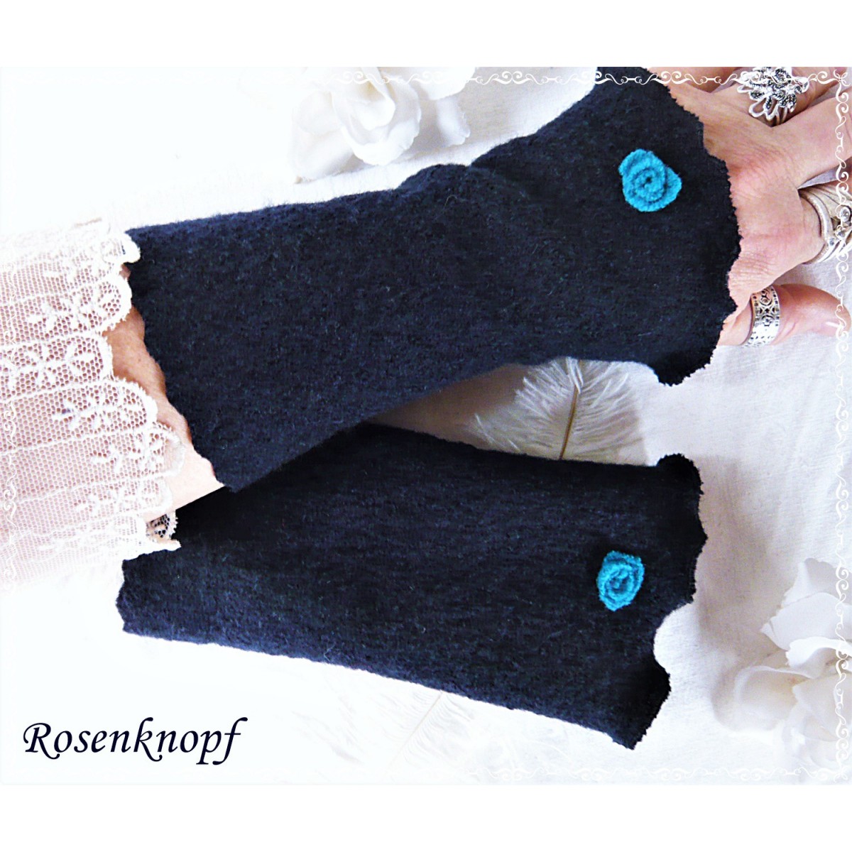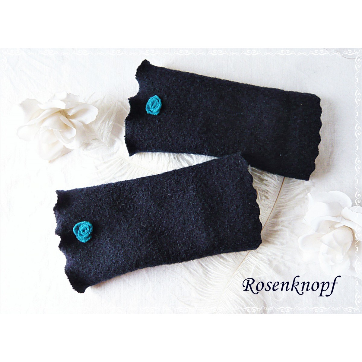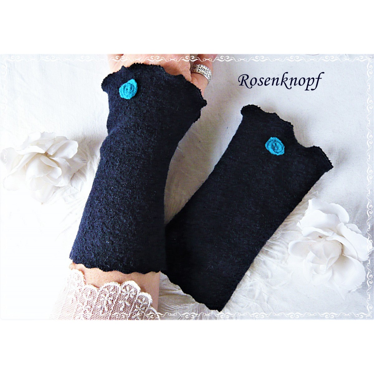 Romantische Akzente erhalten die Armstulpen durch den wellig versäumten Rand vorne und die kleine, von mir in Handarbeit gefertigte Walkrose in Petrol.