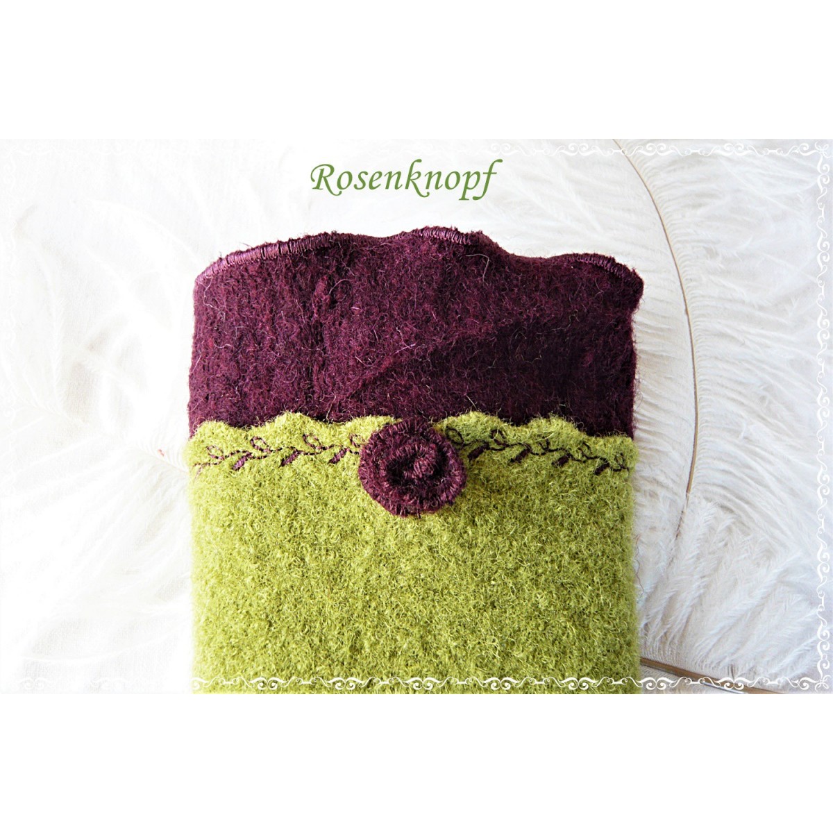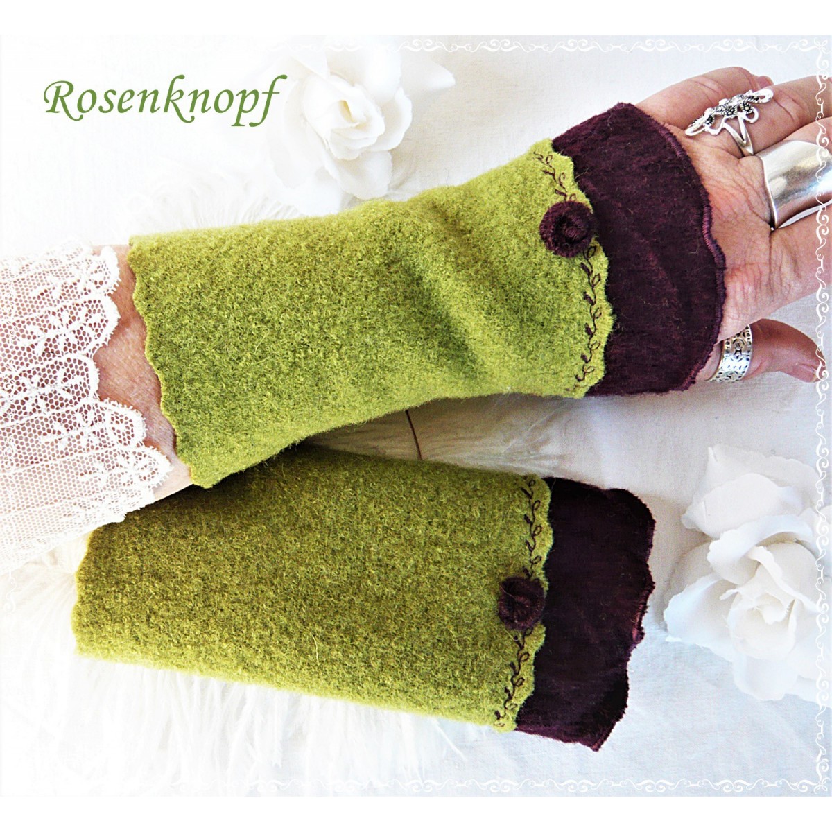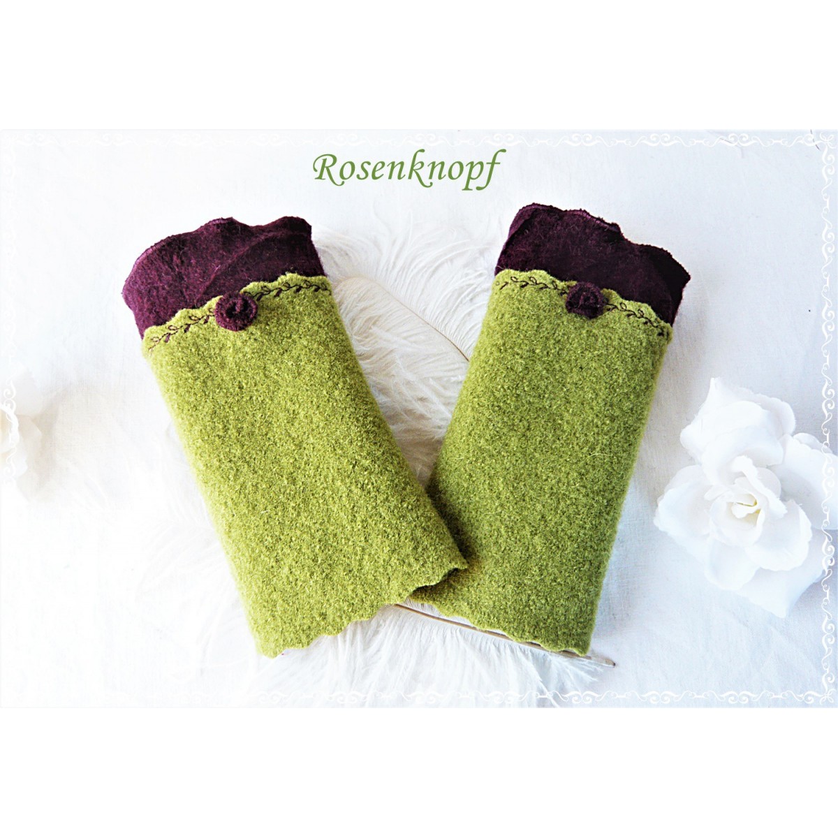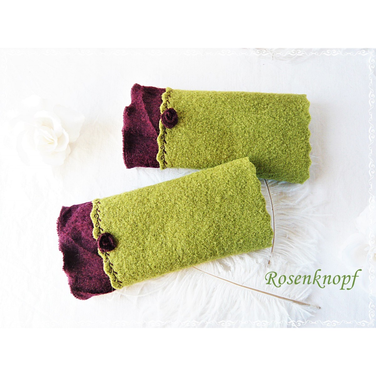 Warme Walkstulpen in hellem Grün mit angesetztem Walk in Bordeaux mit wellig versäumter Kante und einem von mir in Handarbeit gefertigten Walkröschen.