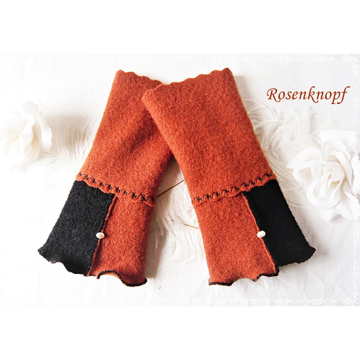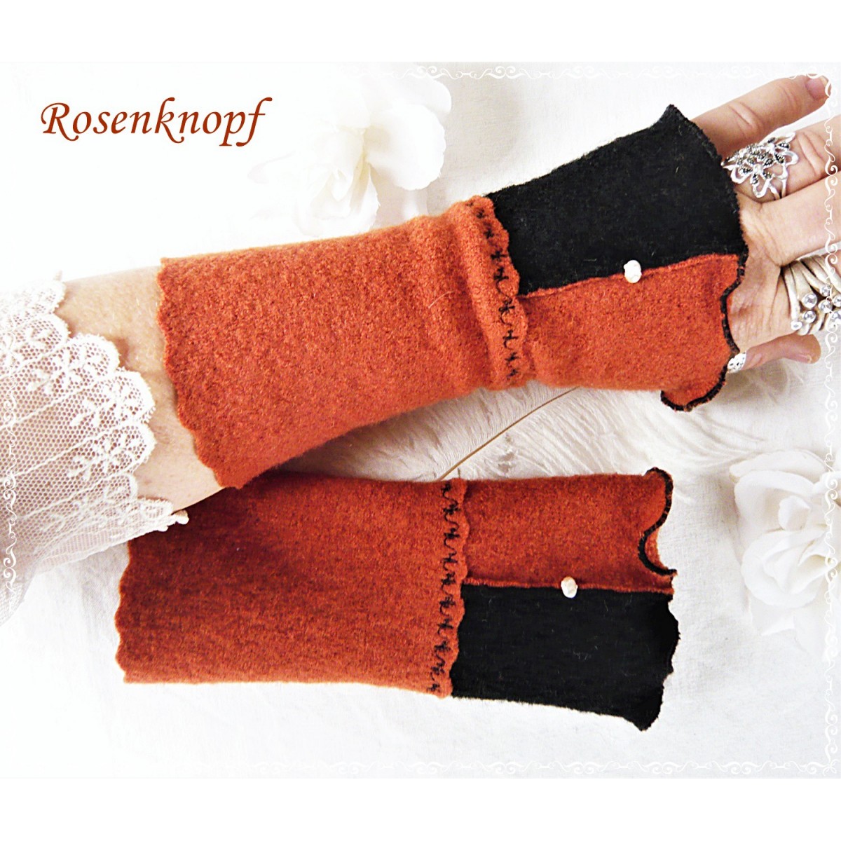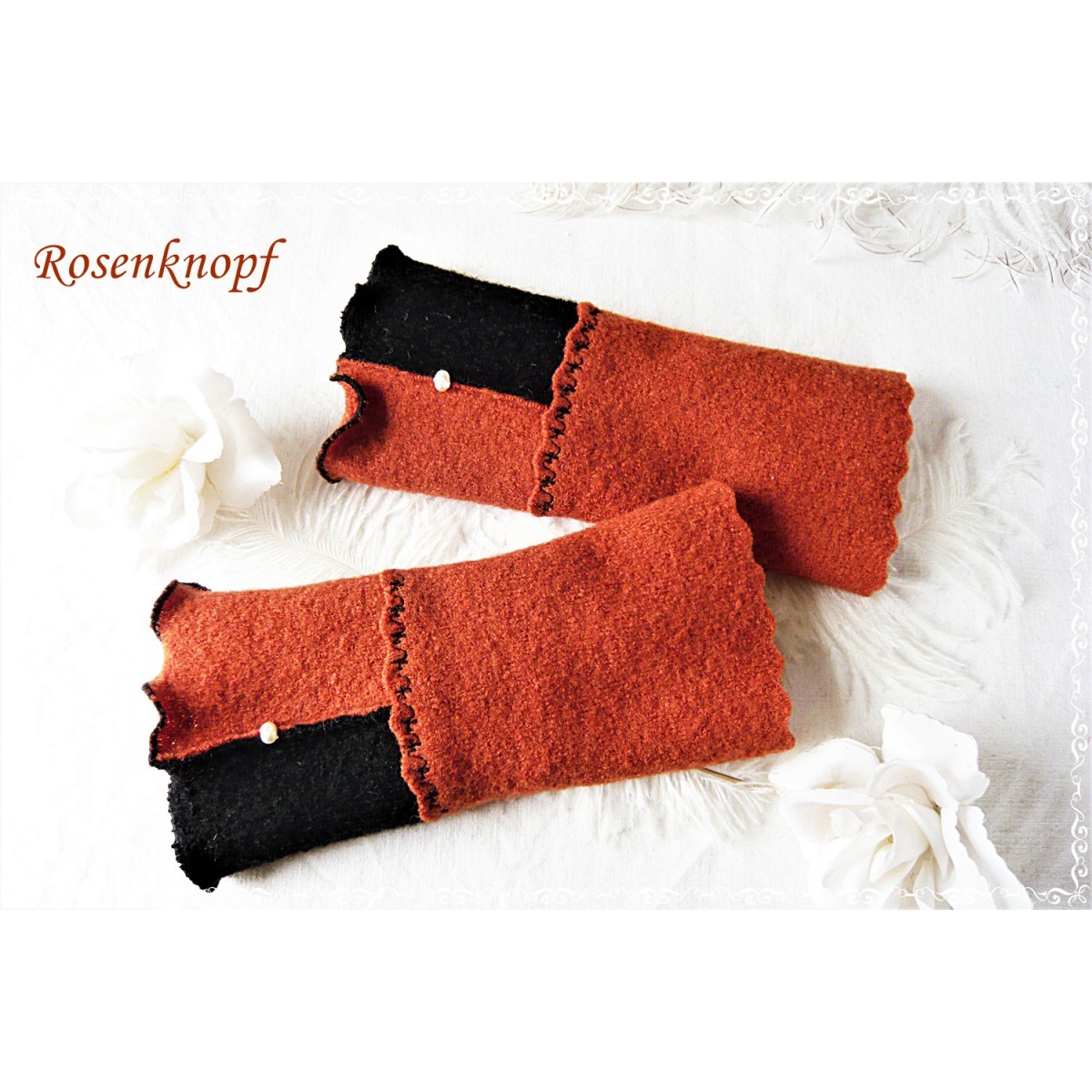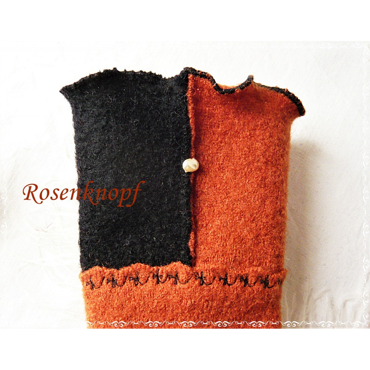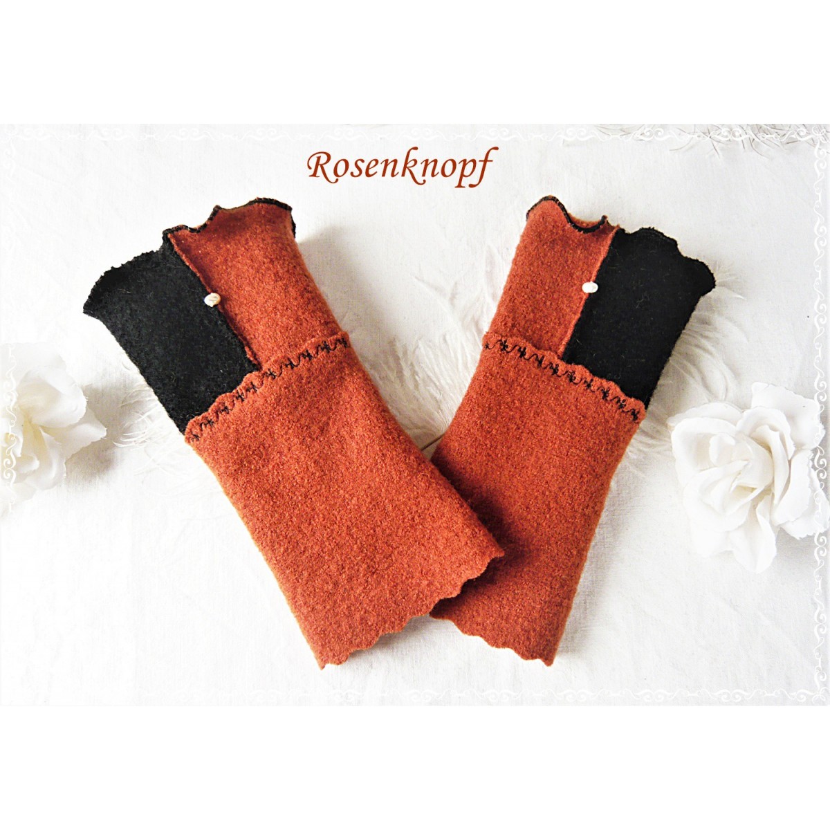 Elegante und wärmende Walkstulpen für kühle Tage und wurden aus zwei hochwertigen Walkstoffen in in Rostbraun und Schwarz gefertigt.