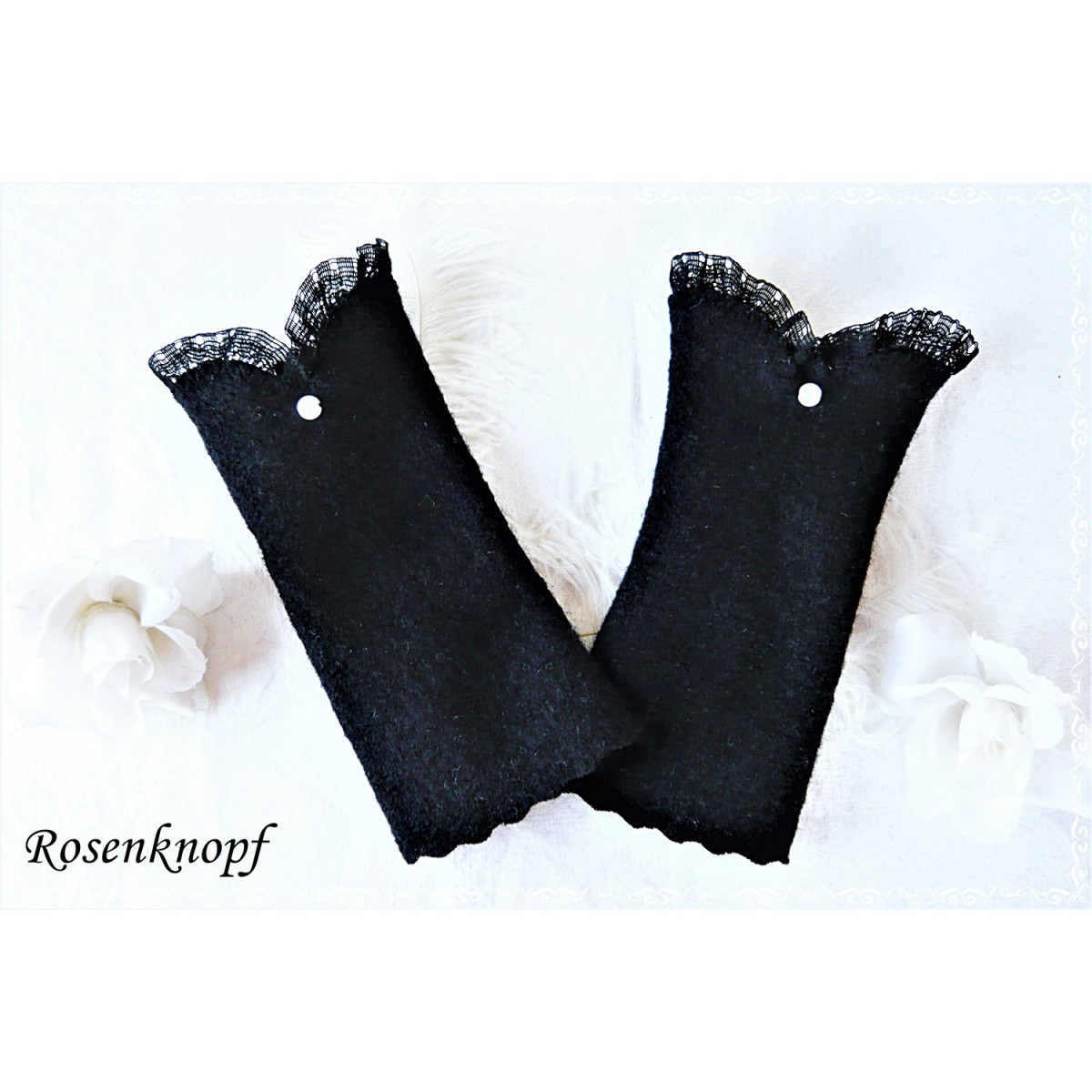 lll➤ Elegante Walkstulpen für kühle Tage aus hochwertigem Walk in Schwarz mit verspieltem Einschnitt, zarter Spitzenborte und einer Wachsperle in der Schnittmitte.