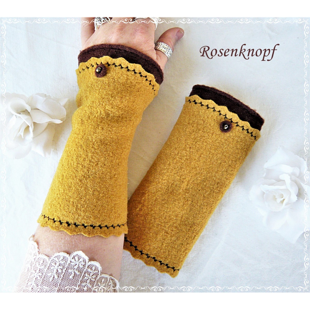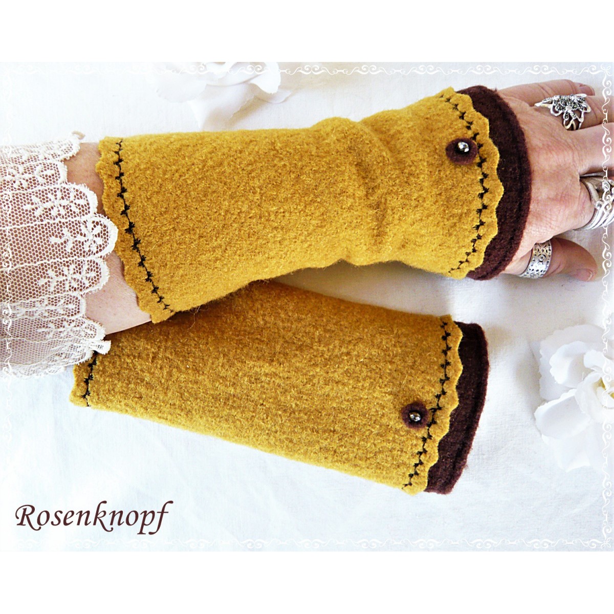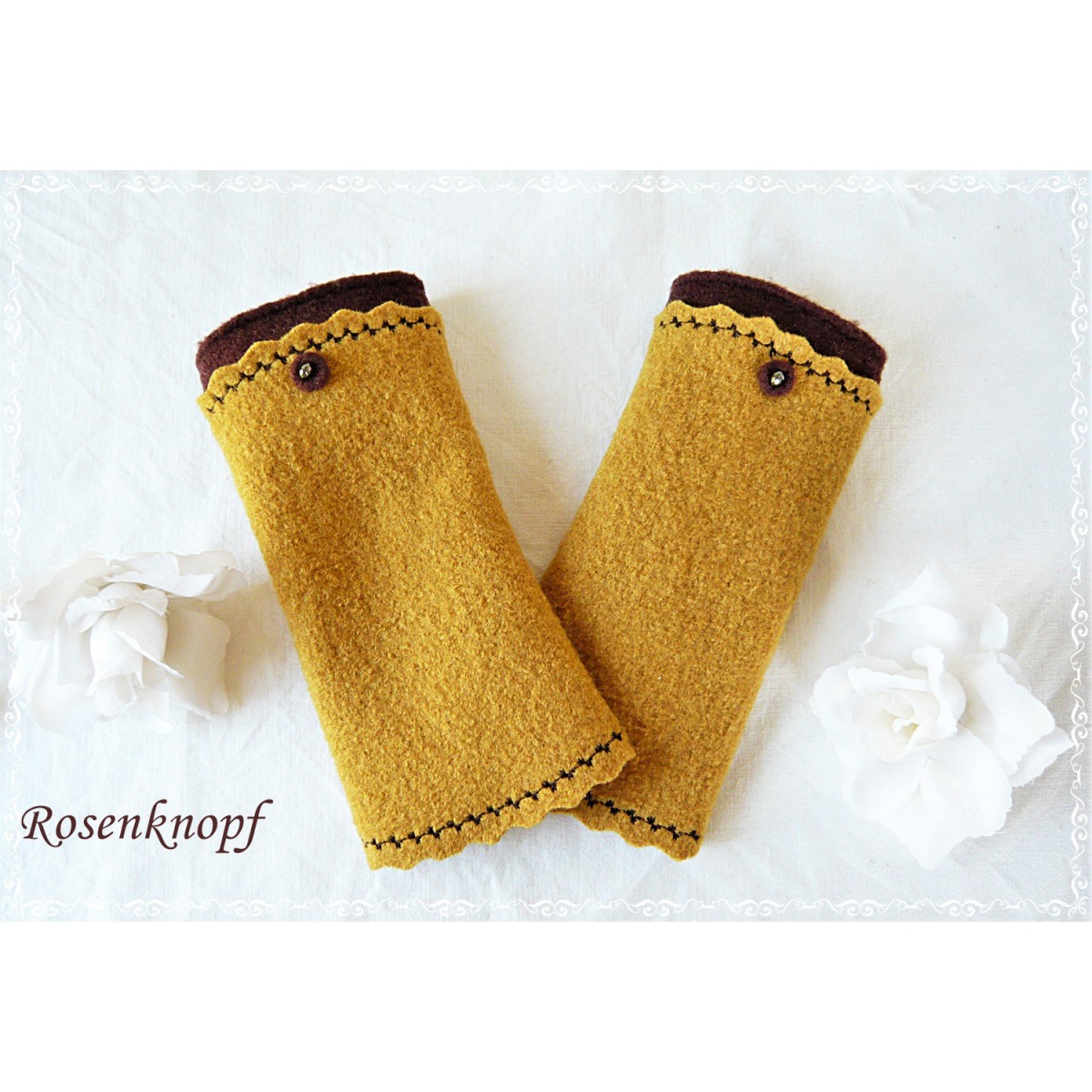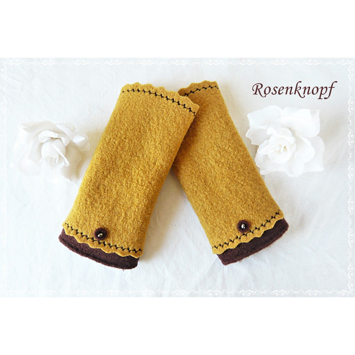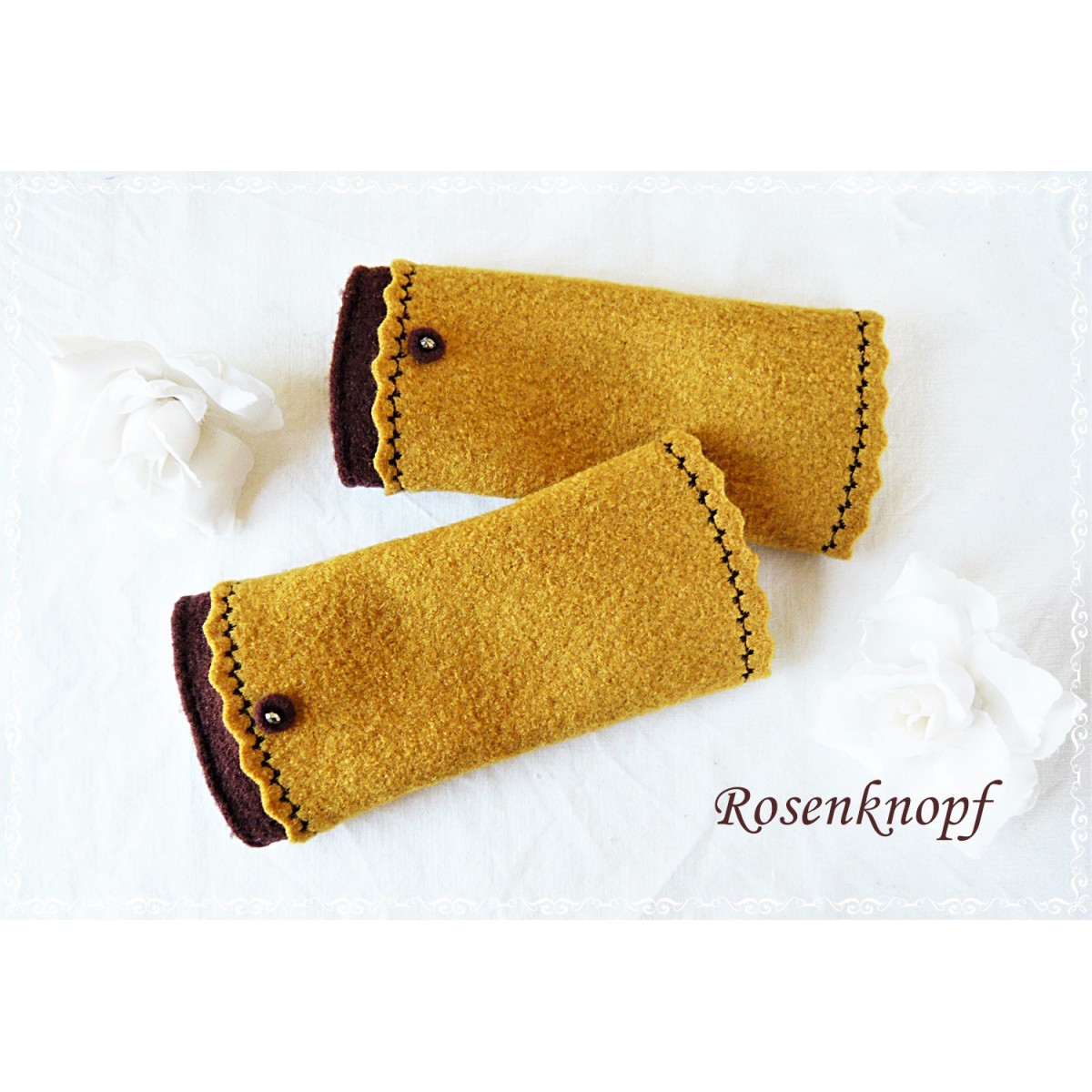 Wärmende und zeitlose Walkstulpen für kühle Tage die aus hochwertigen, feinem Walk in Ocker gefertigt wurden.