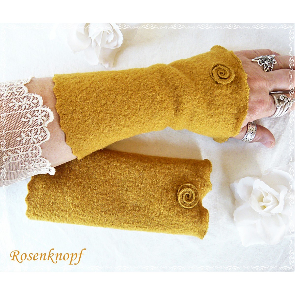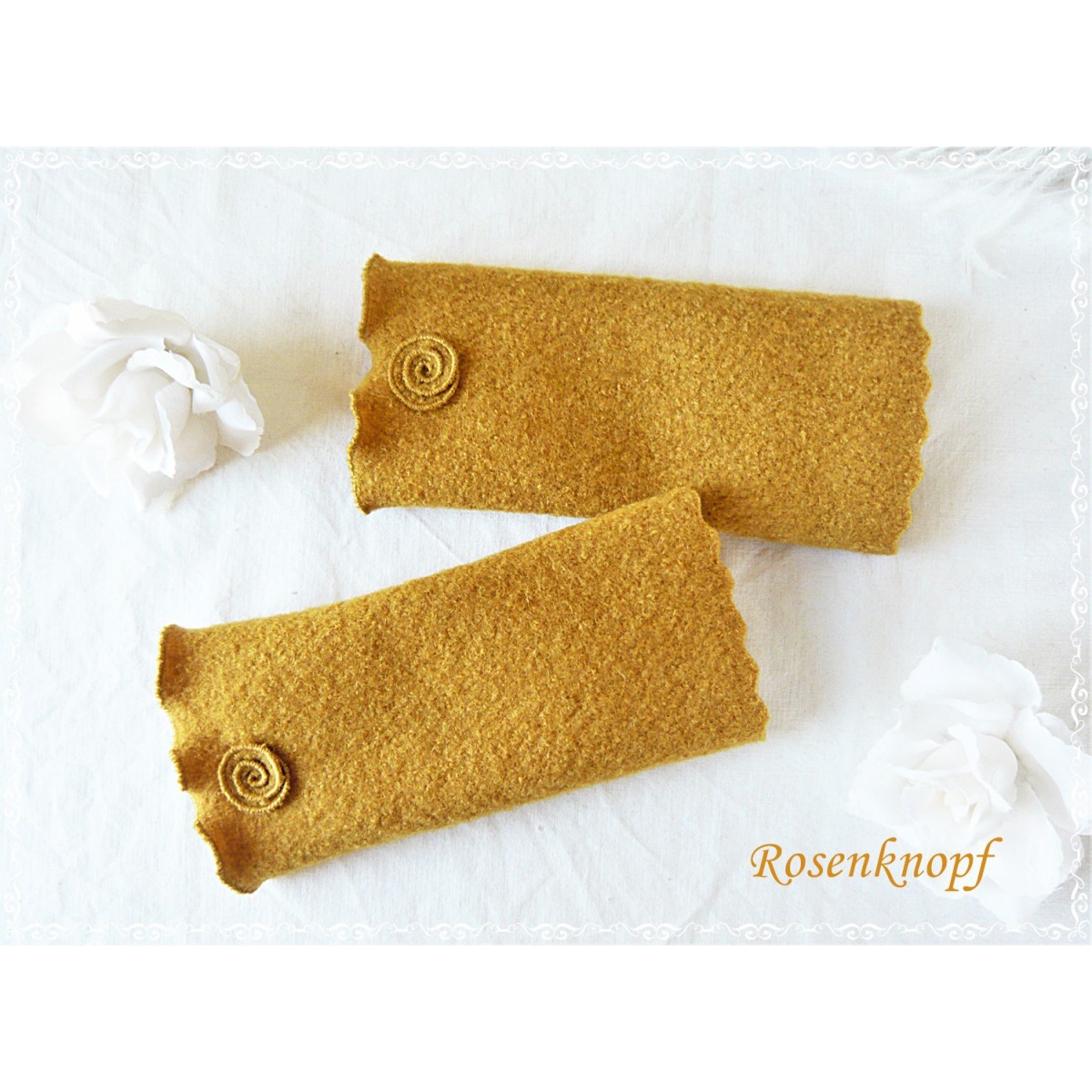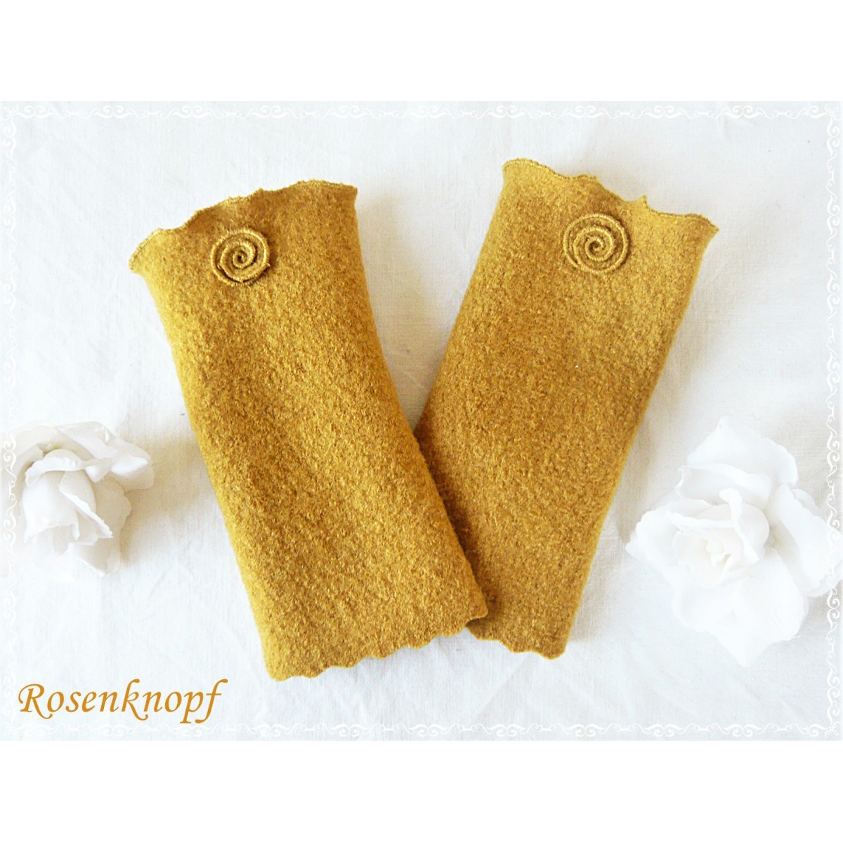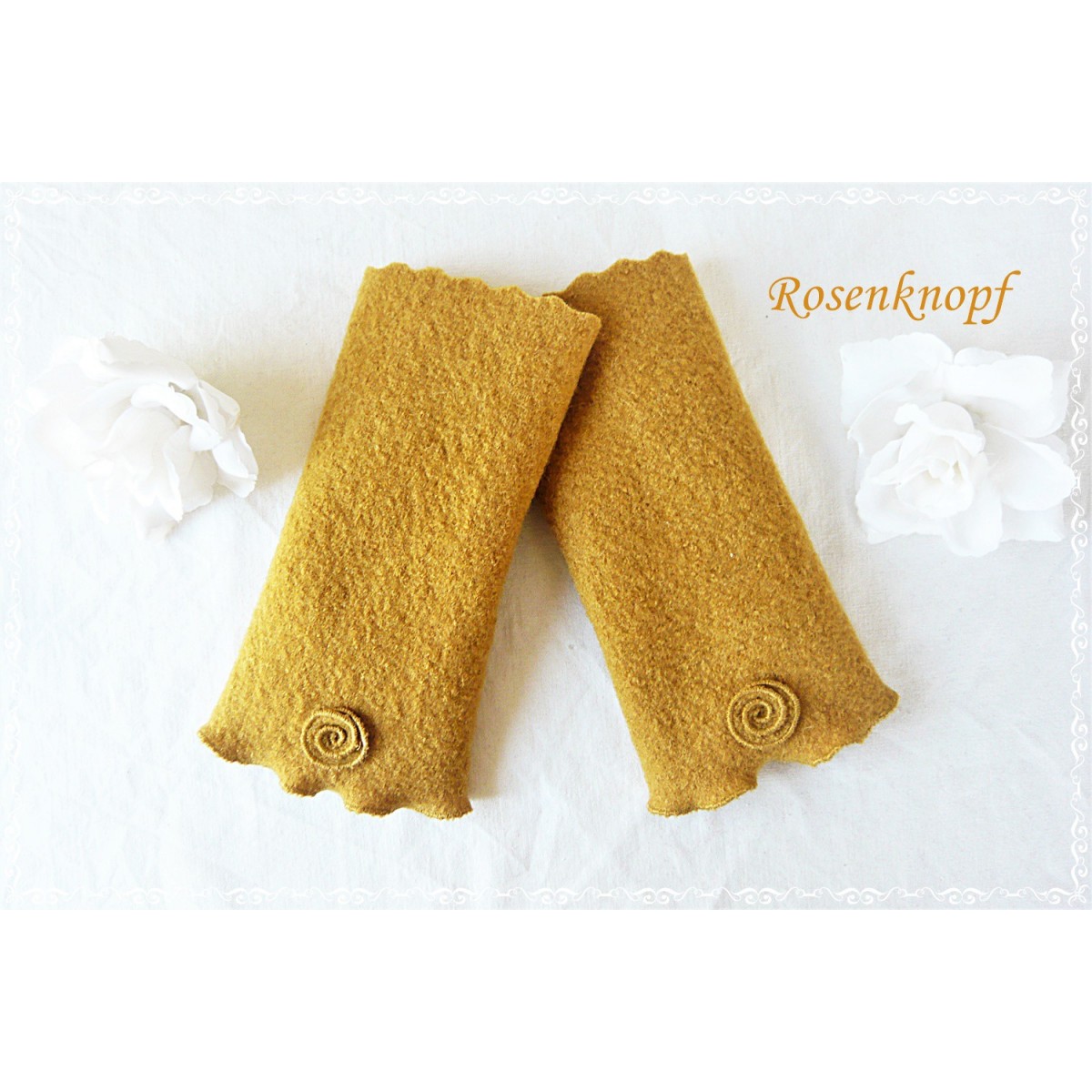 Elegante Stulpen für kühle Tage die aus hochwertigem Woll-Walk in Ockergelb genäht wurden.