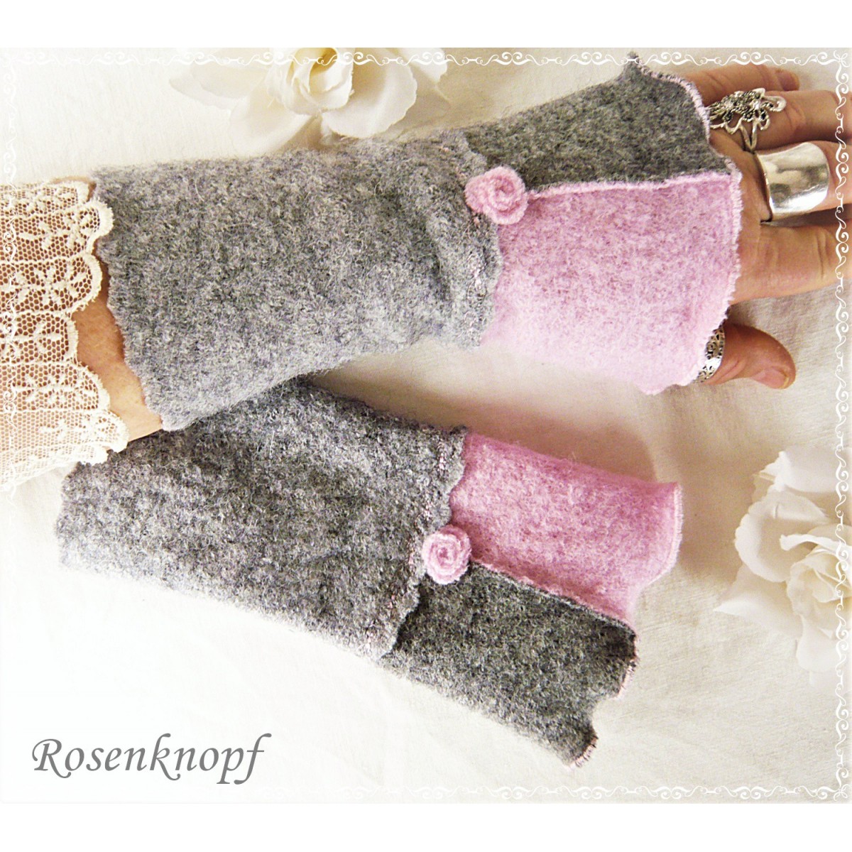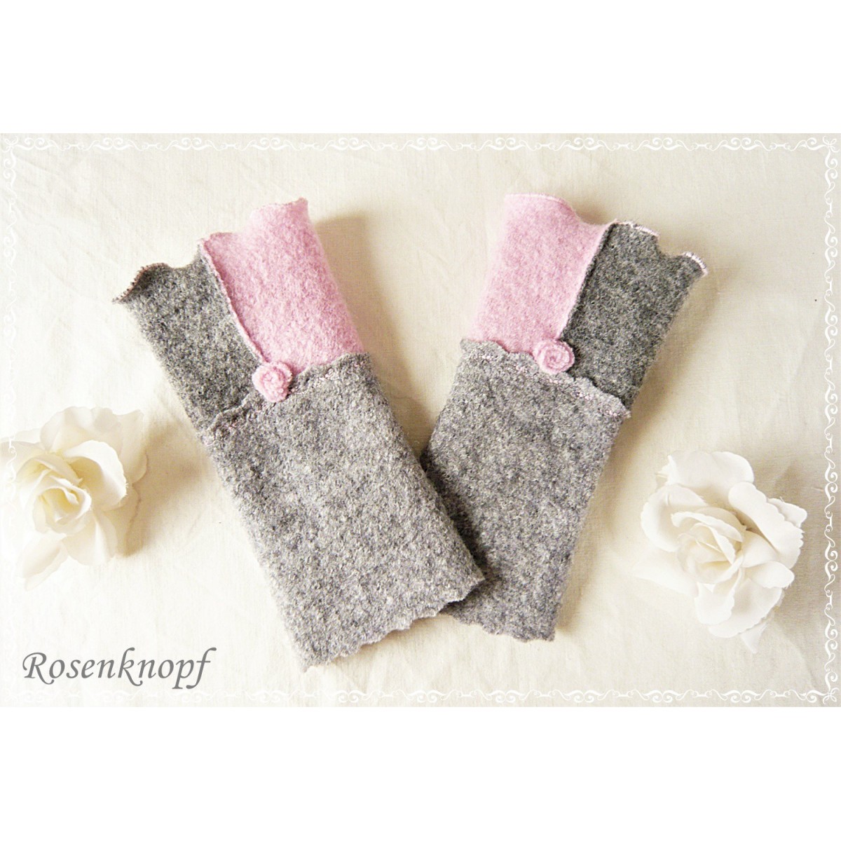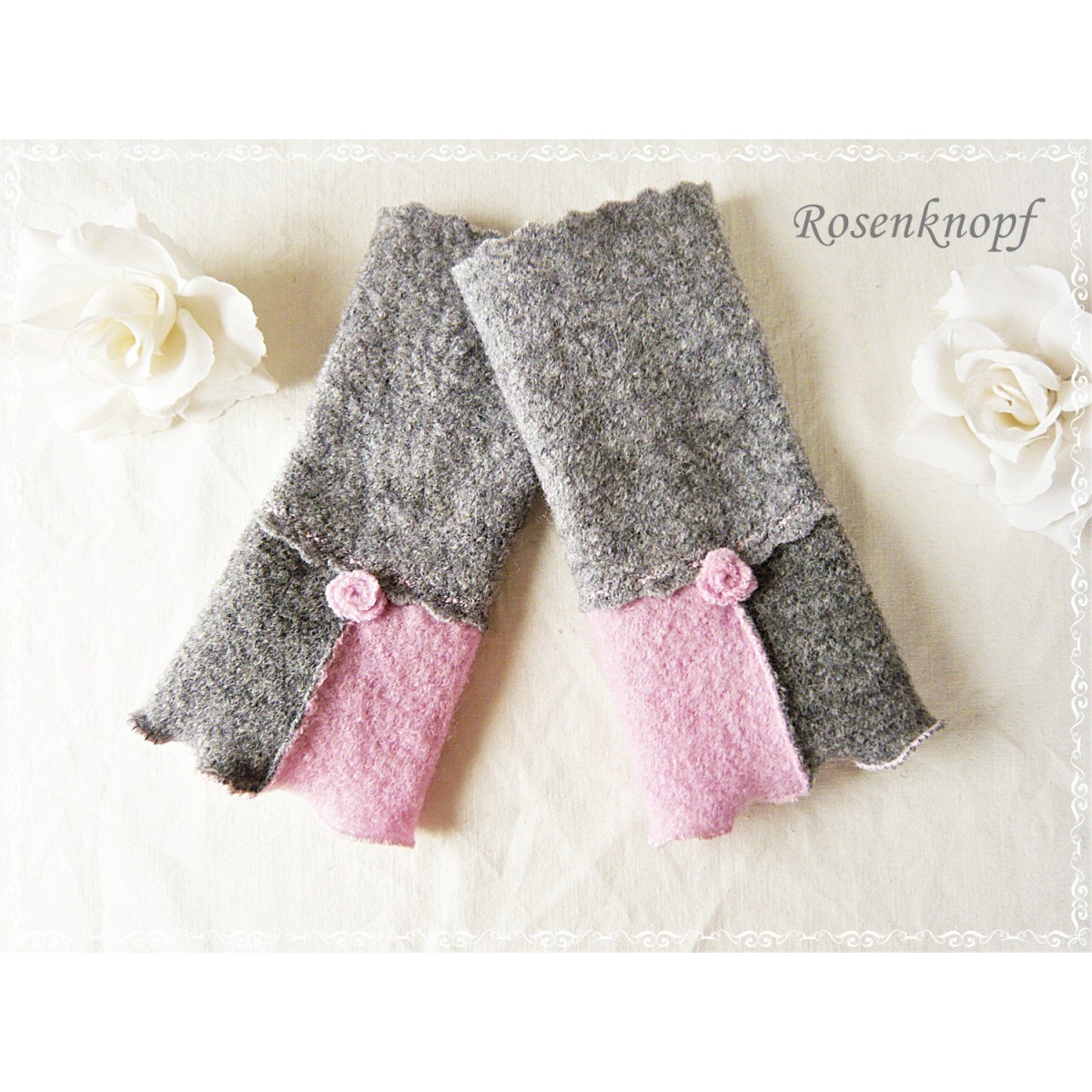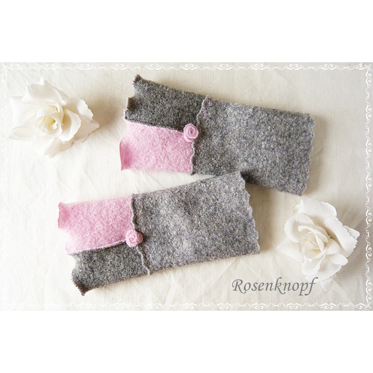 Romantische Akzente erhalten die Armstulpen durch die wellig versäumte Kante, dem Walkröschen und einer Ziernaht.