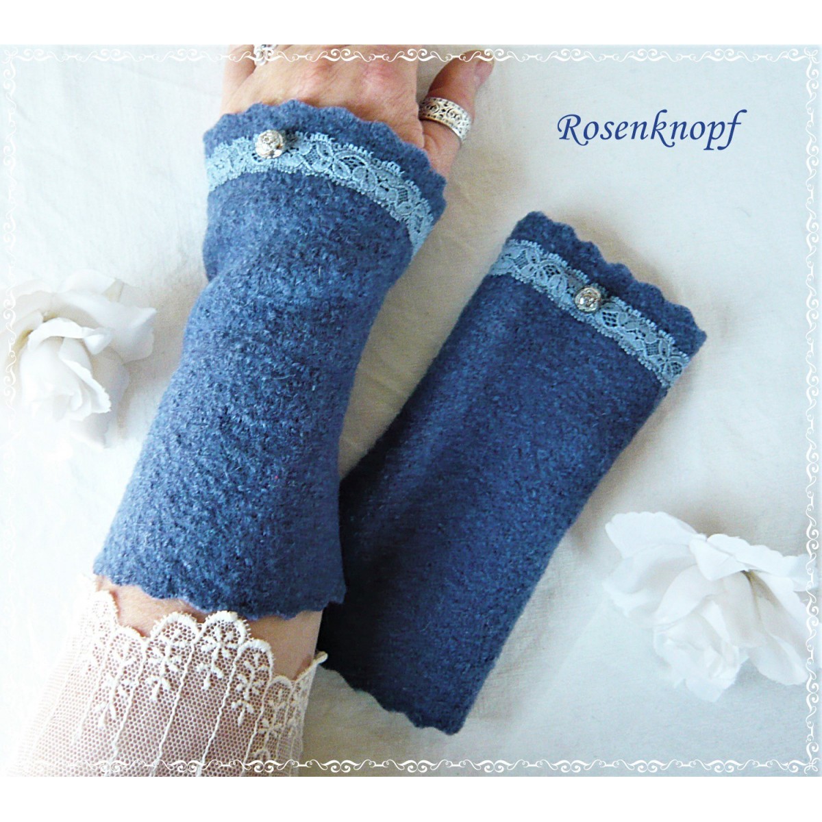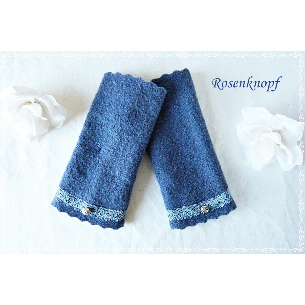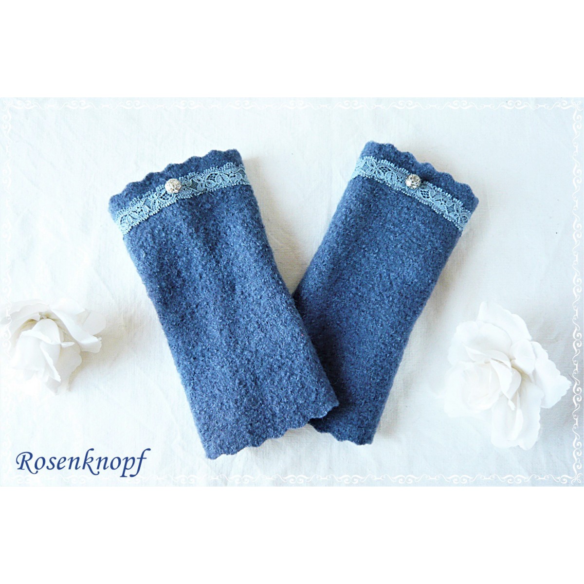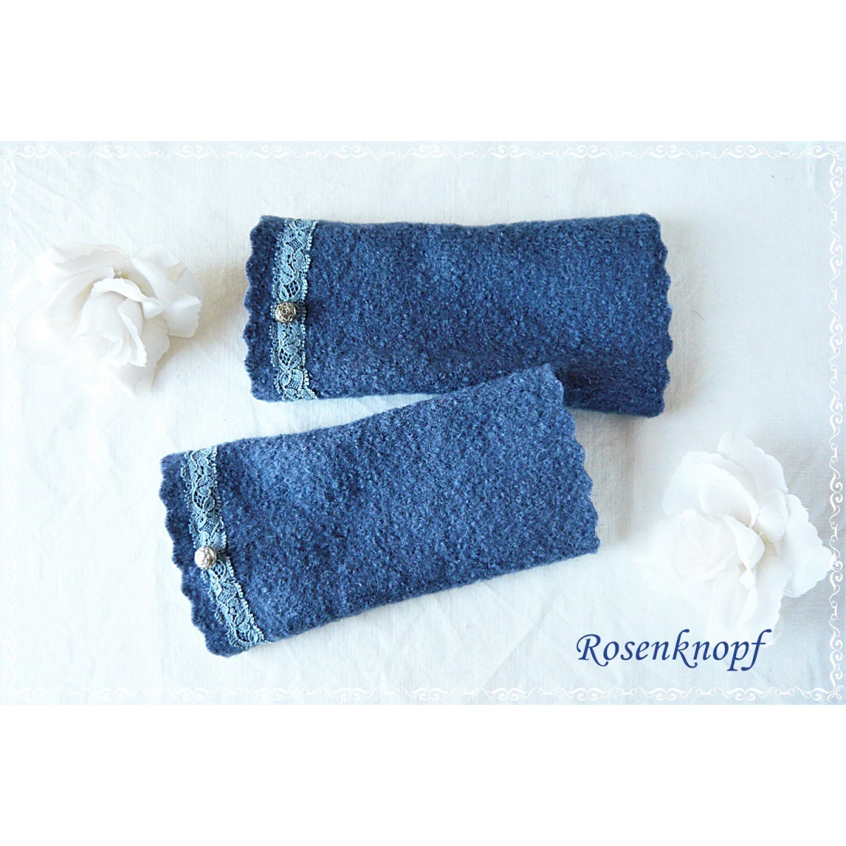 Alltagstaugliche und wärmende Walkstulpen die aus hochwertigem Walk in Jeansblau gefertigt wurden.