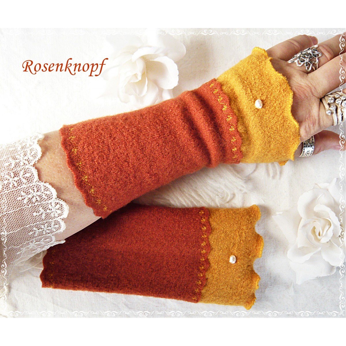 Romantische Akzente erhalten die zeitlosen Armstulpen durch den mit floralem Zierstich angesetzten Walk in frischem Ocker mit seiner wellig versäumten Kante und einer kleinen künstlichen Süßwasserperle.