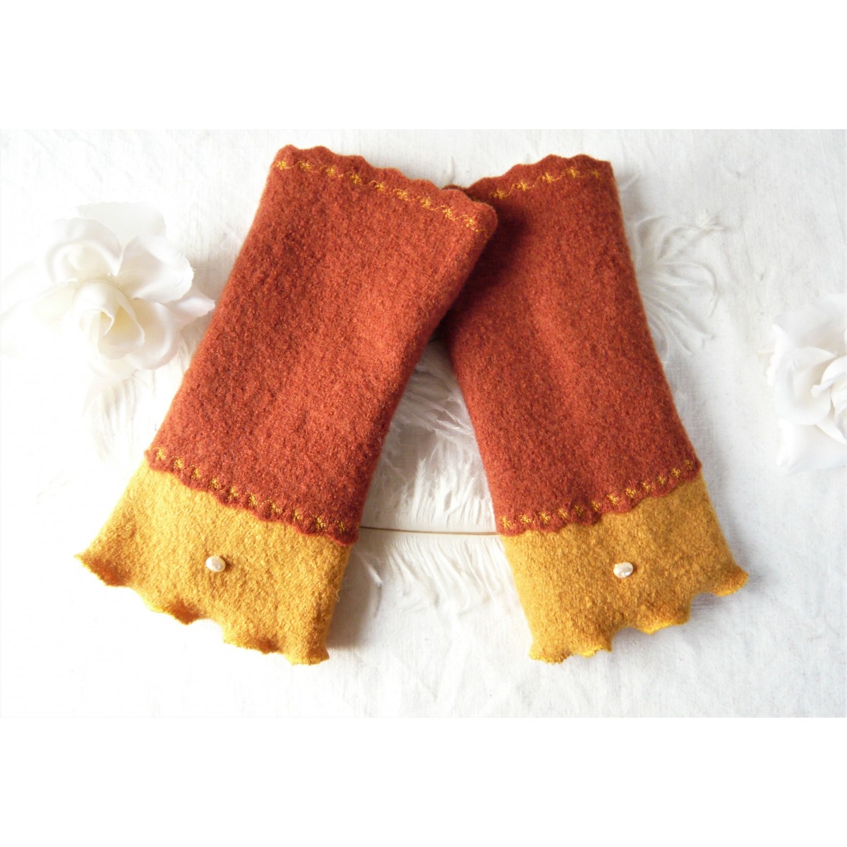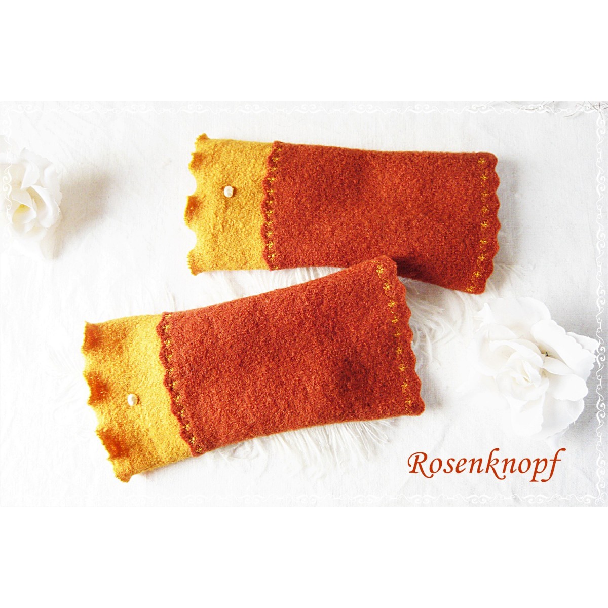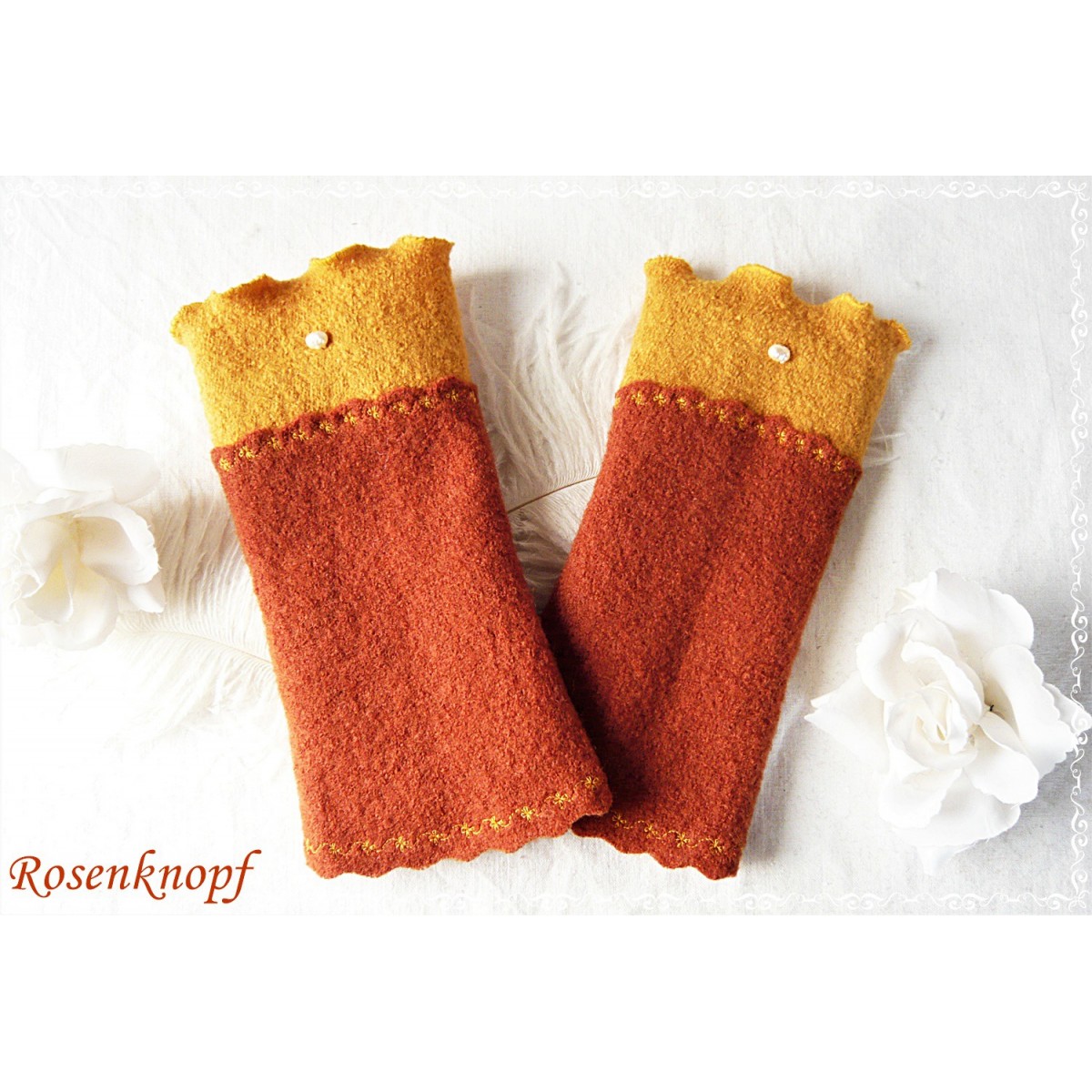 Elegante und wärmende Walkstulpen für kühle Tage die aus Wollwalk in Rostbraun.