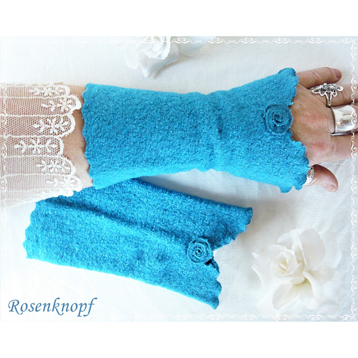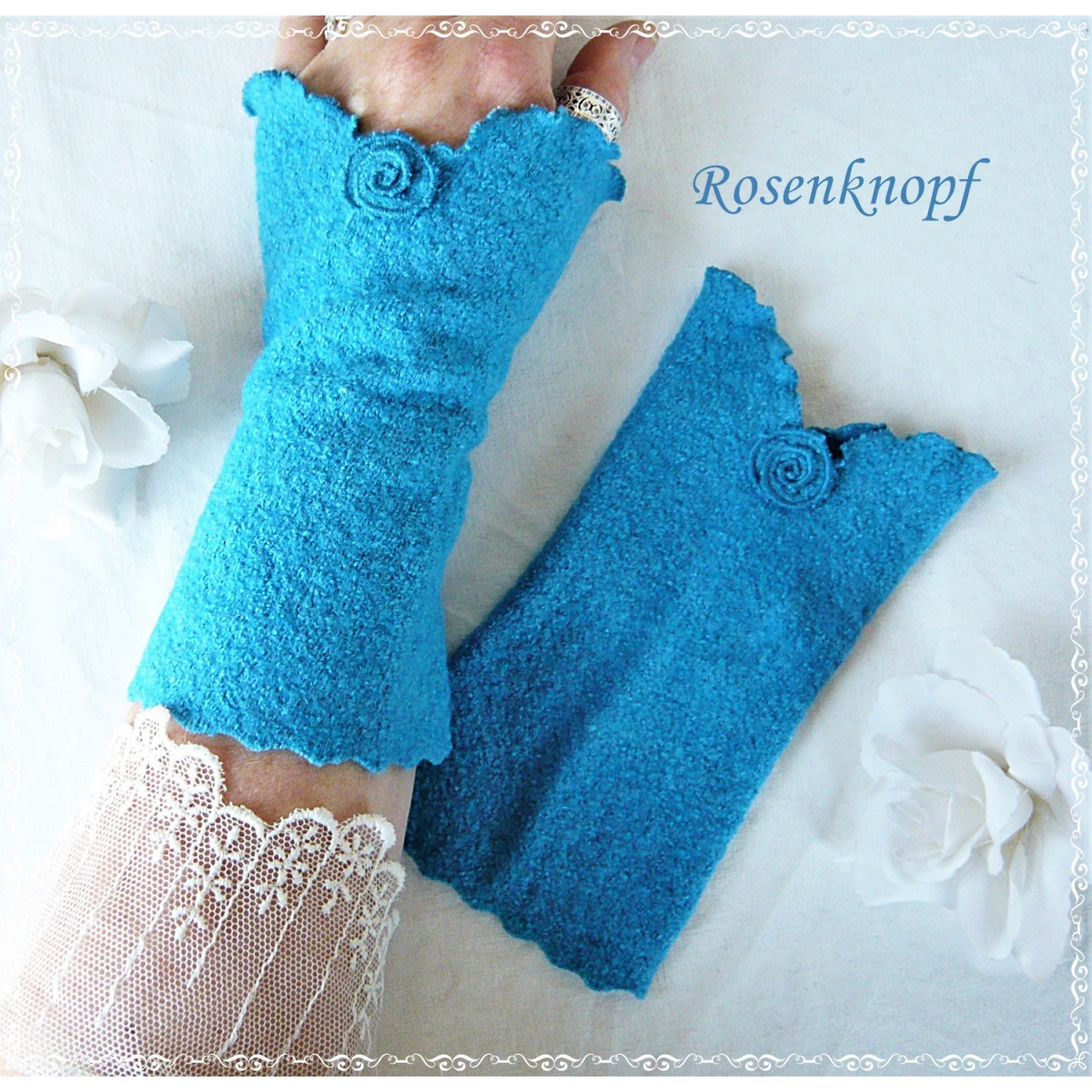 Romantische Akzente erhalten die Armstulpen durch das Walkröschen in der Schnittmitte und die versäumte Kante mit ihrem verspielten Einschnitt.
