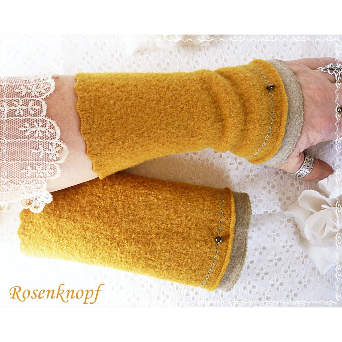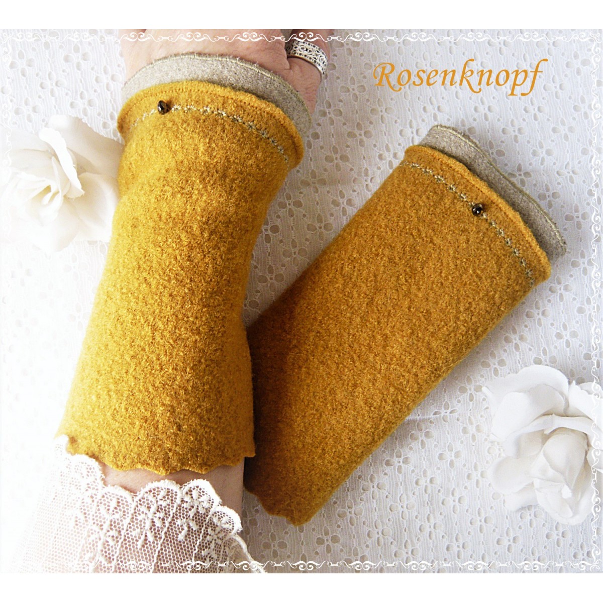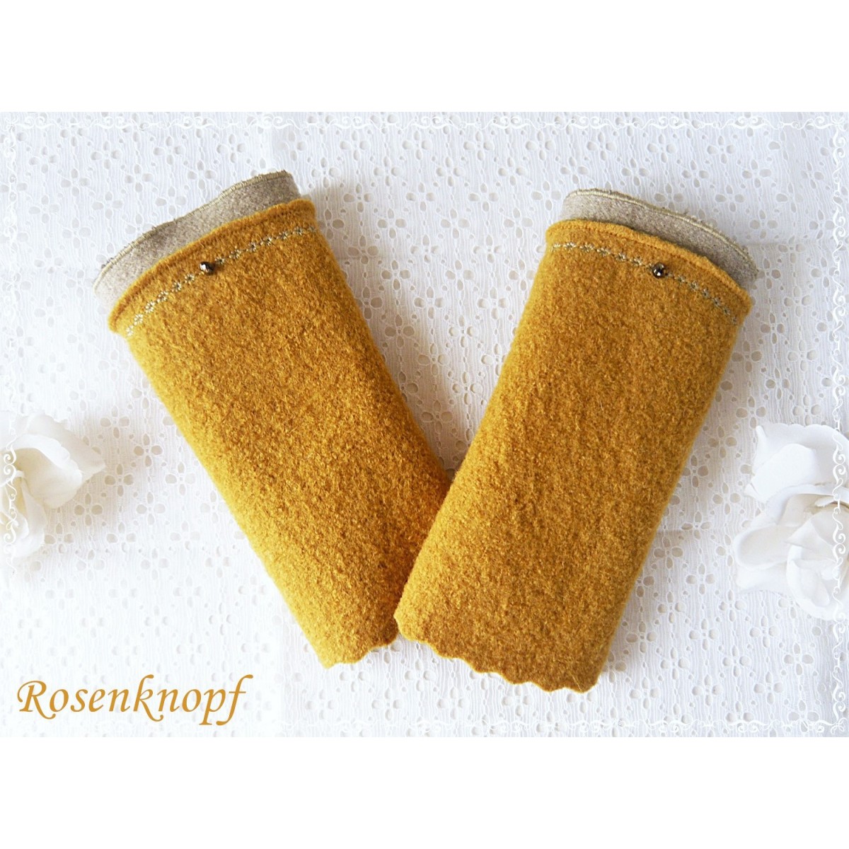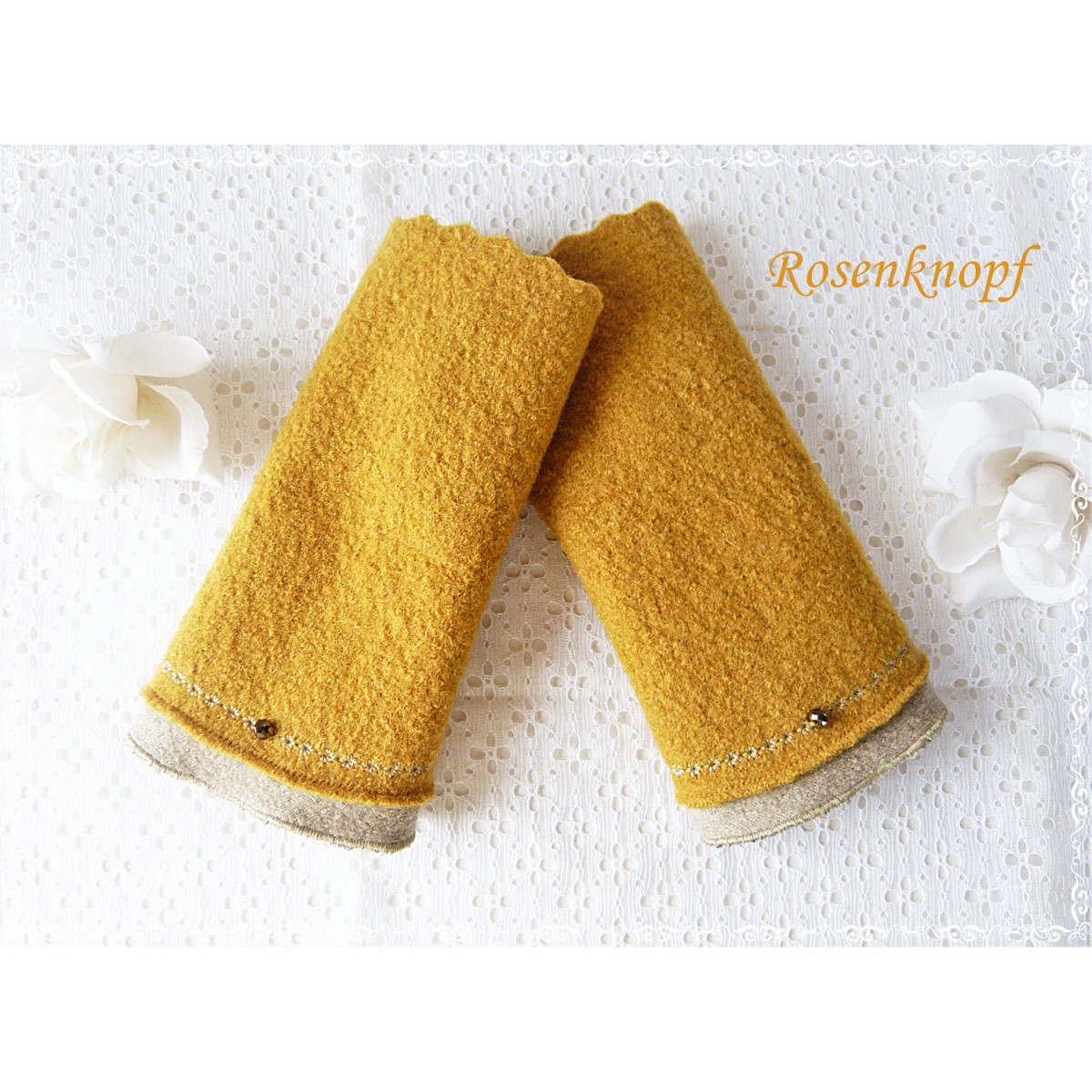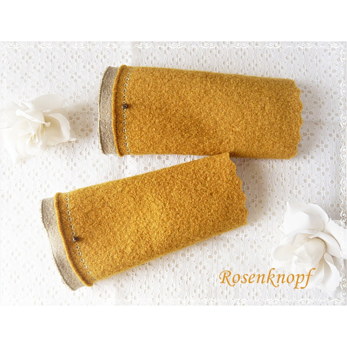 Elegante und wärmende Walkstulpen für kühle Tage aus Wollwalk in Senf.