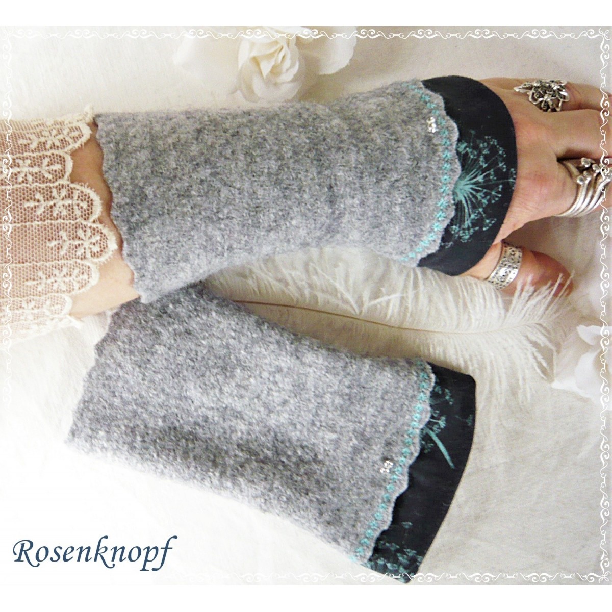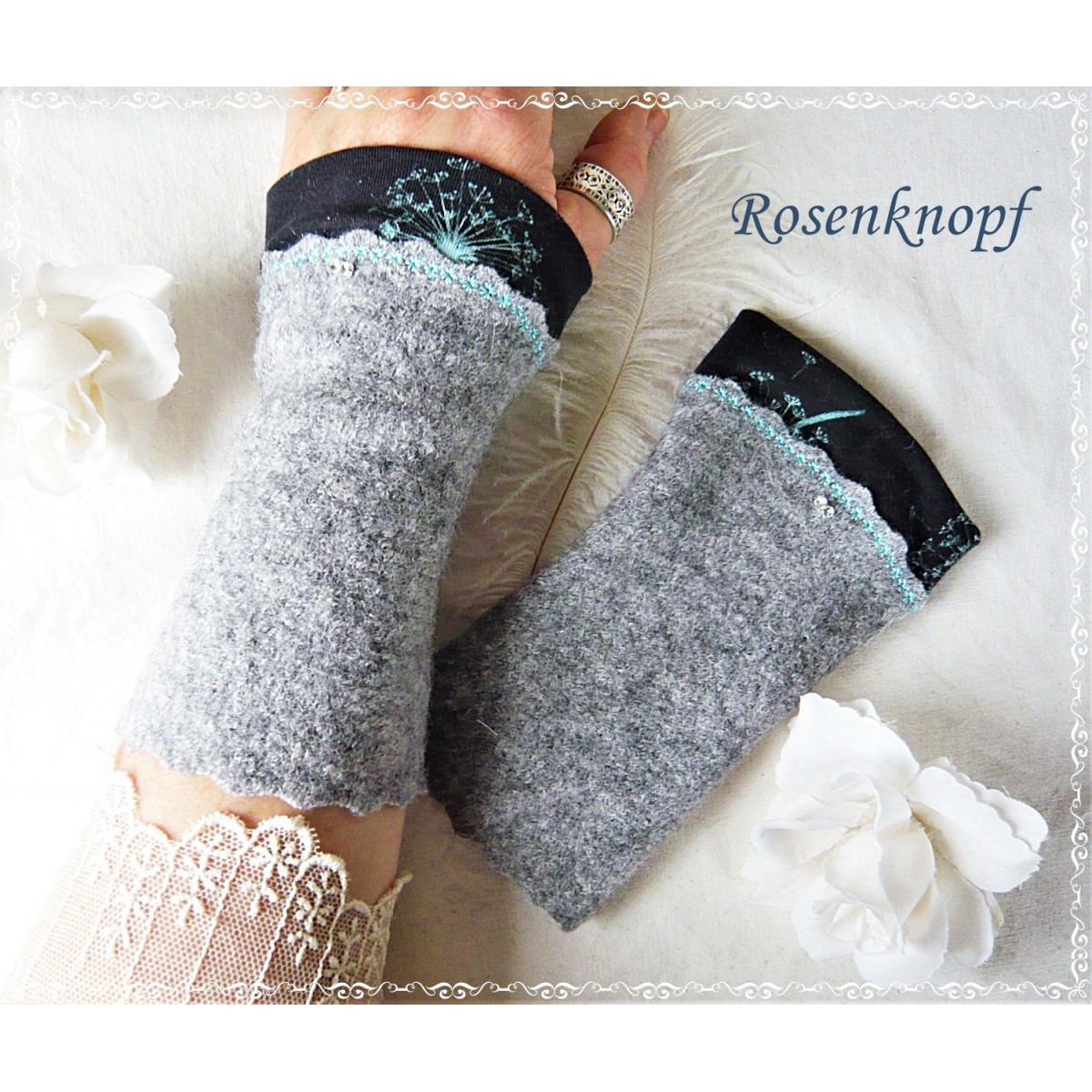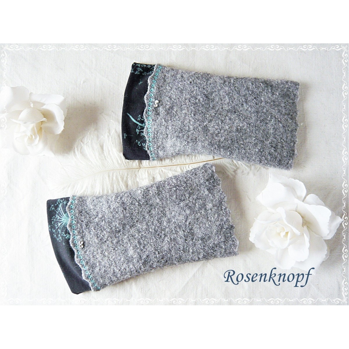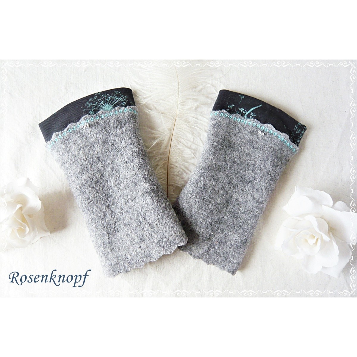 Zeitlose Walkstulpen aus hochwertigem Walk in Grau mit farbigem Zierstich angesetztem Jersey mit Pusteblumenmuster in Türkis.