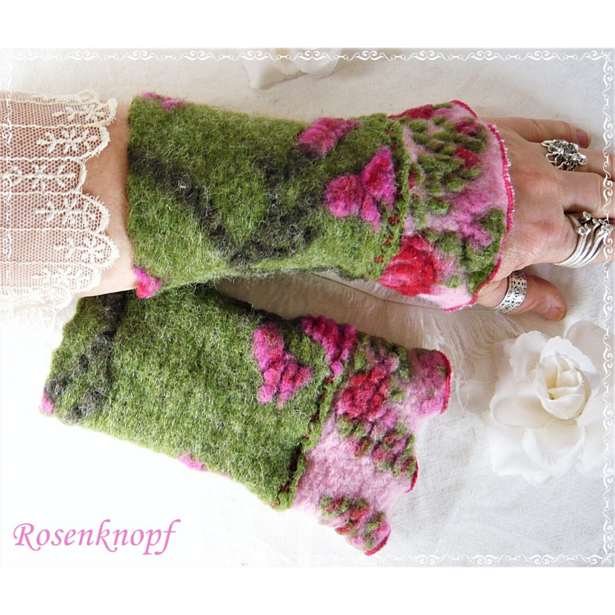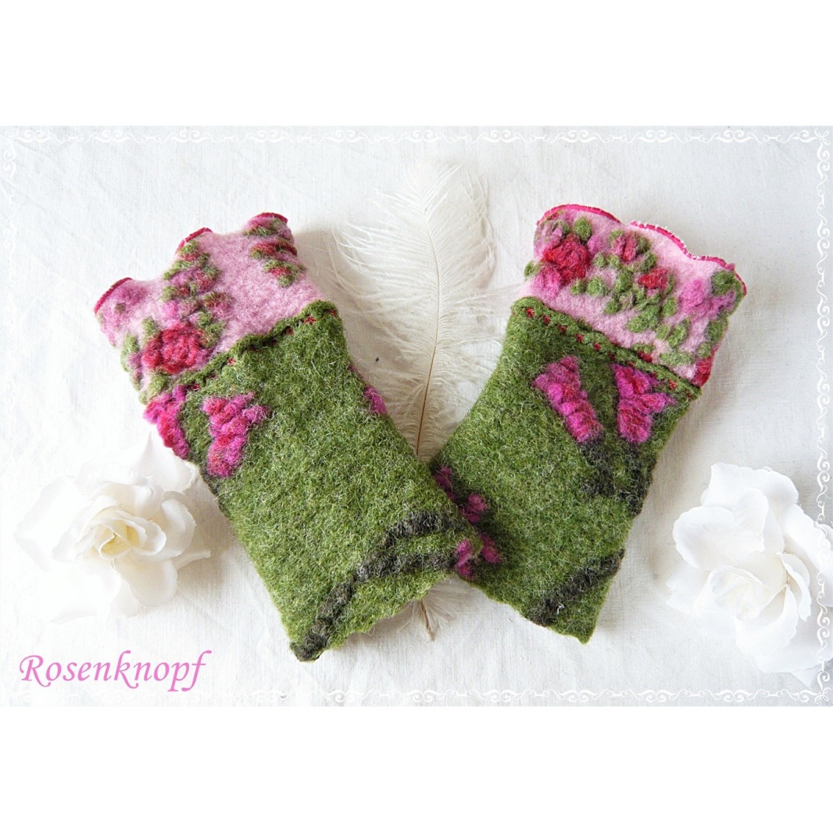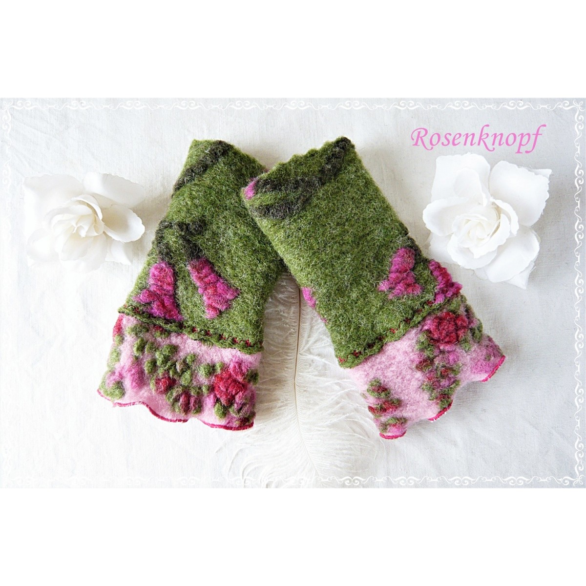 Zauberhaft romantische und kuschelwarme Walkstulpen für kühle Tage die aus hochwertigem Musterwalk in Grün mit floralem Muster in Tannengrün, Rot und Pink gefertigt wurden.