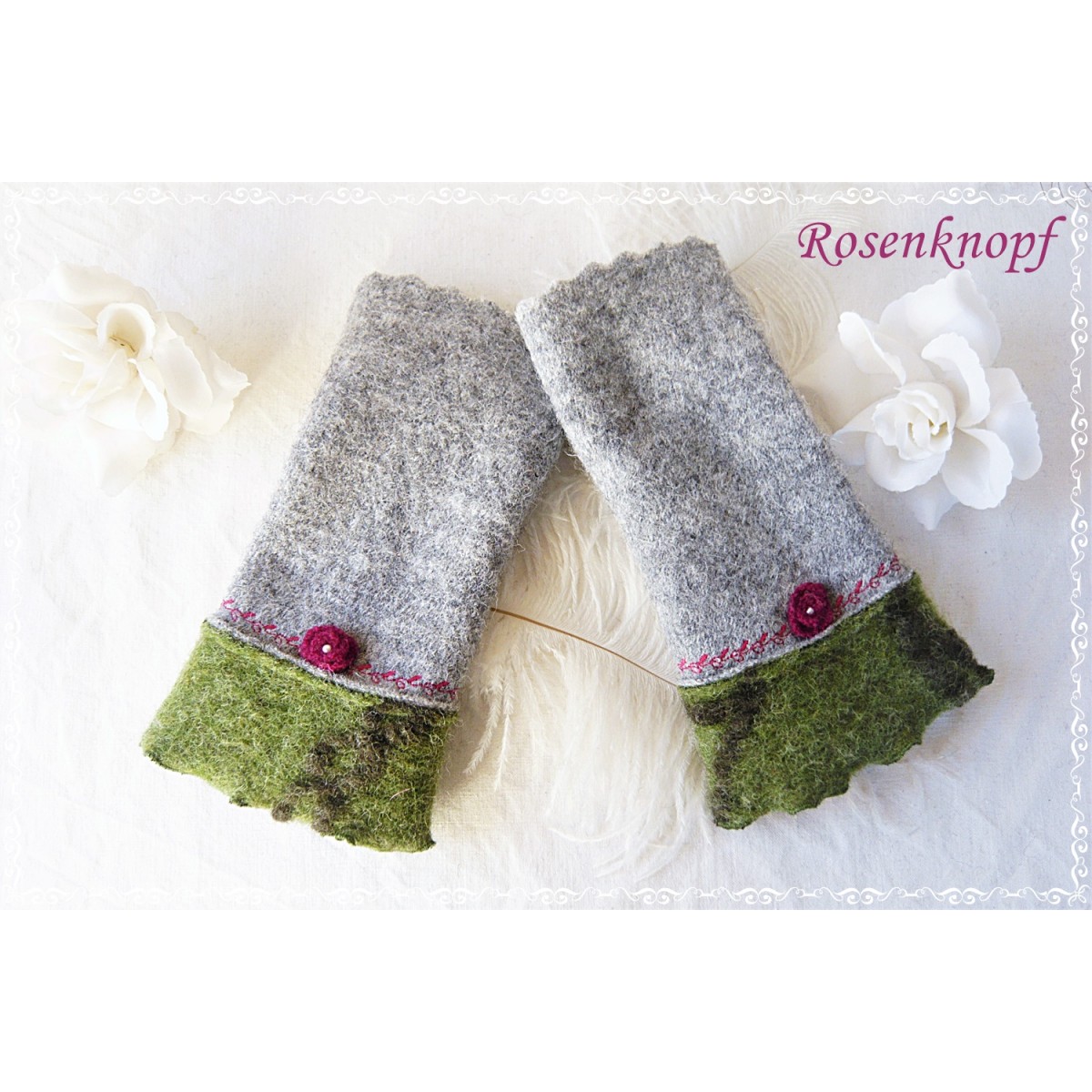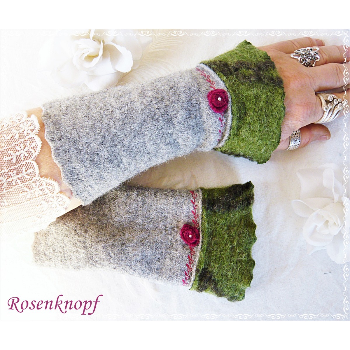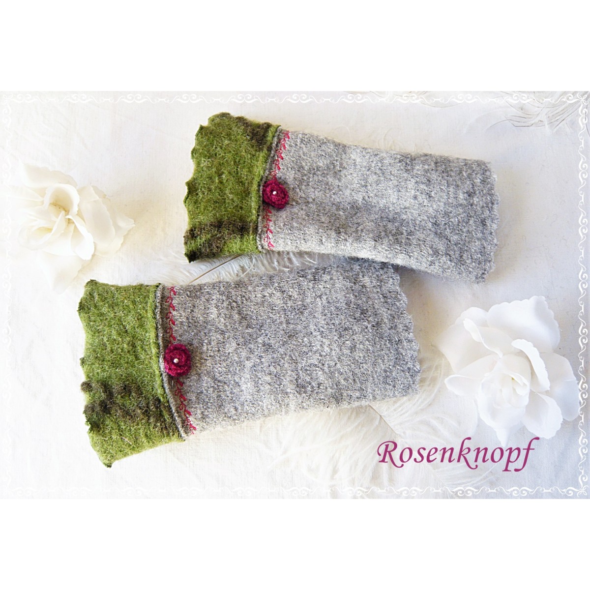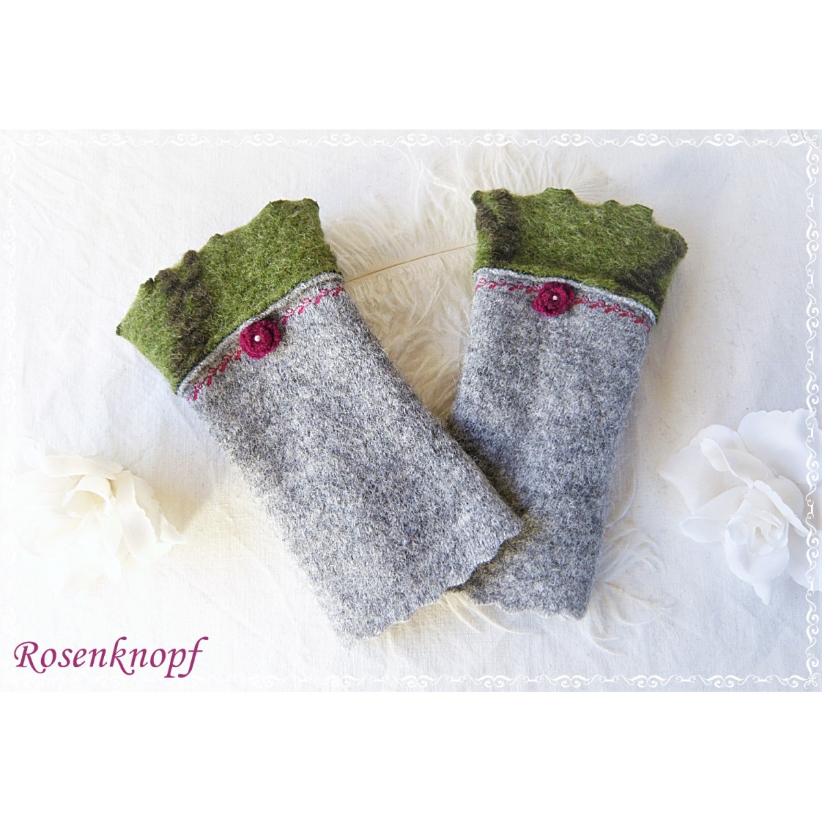 Zauberhaft romantische und kuschelwarme Walkstulpen für kühle Tage die aus hochwertigem Walk in Grau gefertigt wurden.